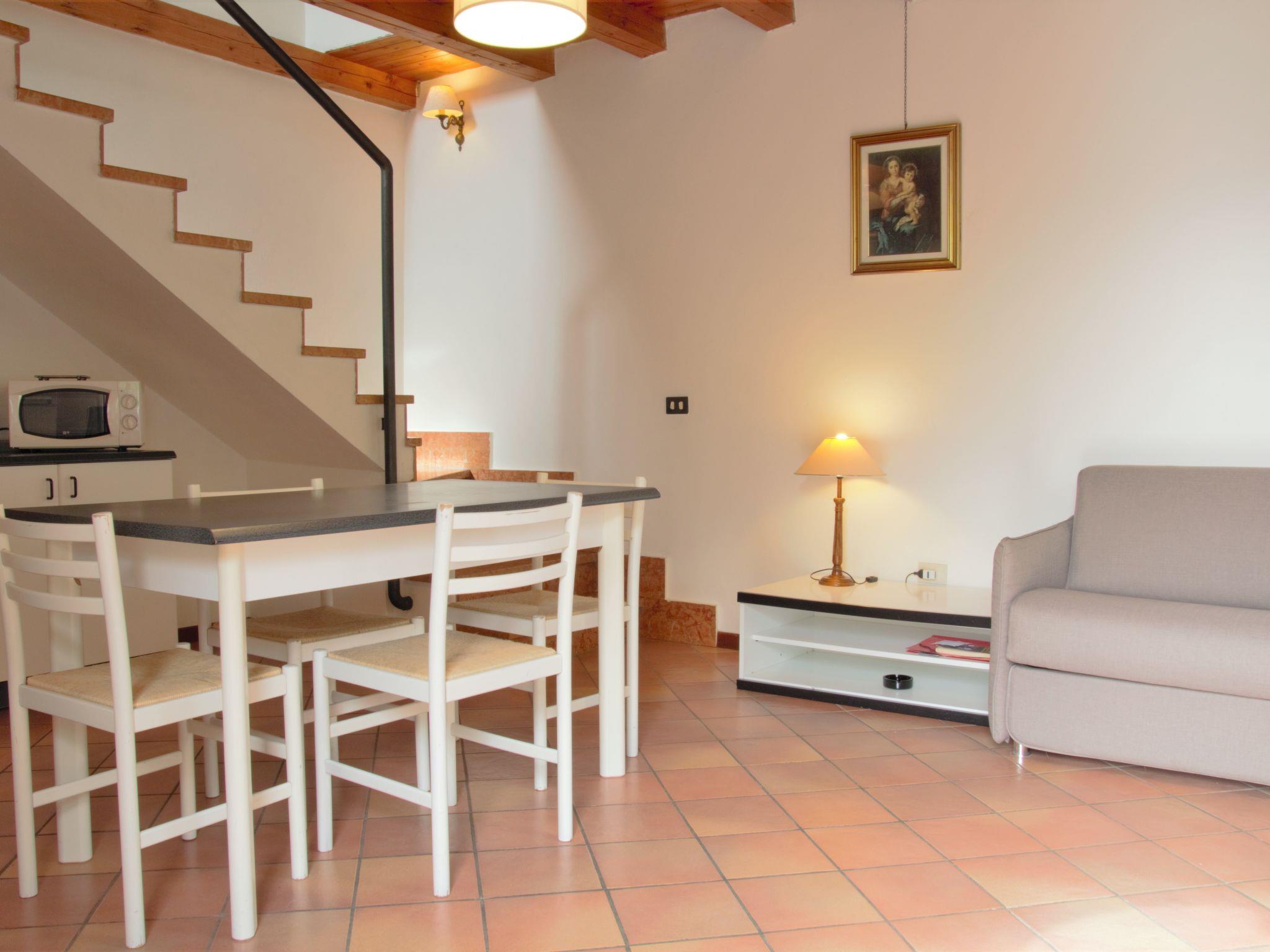2-room apartment 49 m2 on 2 levels on 1st floor. Practical furnishings: living/sleeping room with 1 double sofabed, dining table and satellite TV. Open kitchen (4 gas rings, microwave, electric coffee machine). Upper floor: (open staircase) with sloping ceilings, 1 double bedroom. Shower/bidet/WC. Air-conditioning, forced-air heating (extra). Heating not available in all rooms. Patio. Distant view of the lake. Parking at the house. Please note: non-smokers only. Maximum 1 pet/ dog allowed. Private entrance. IT023036B4R937XSBC