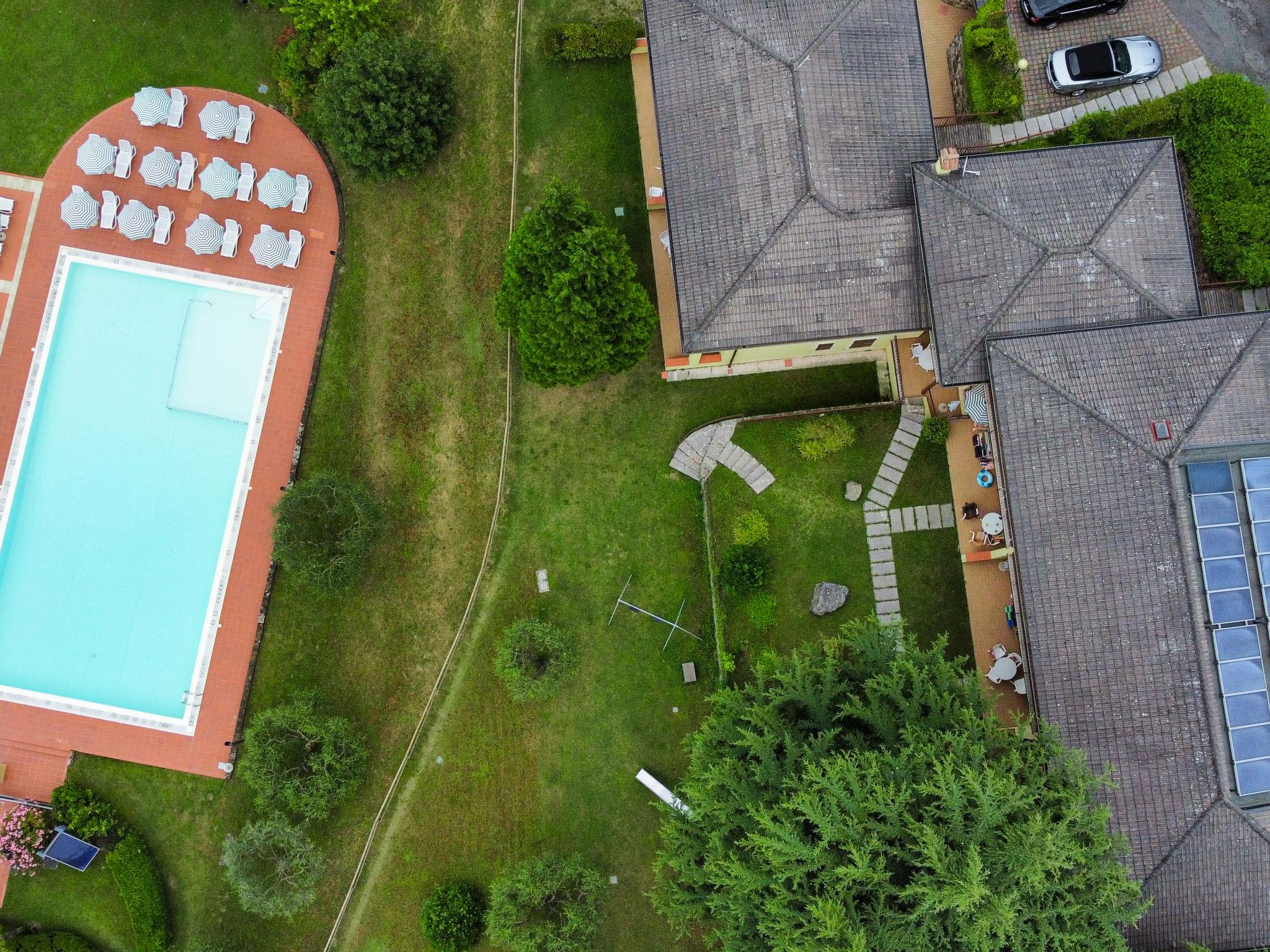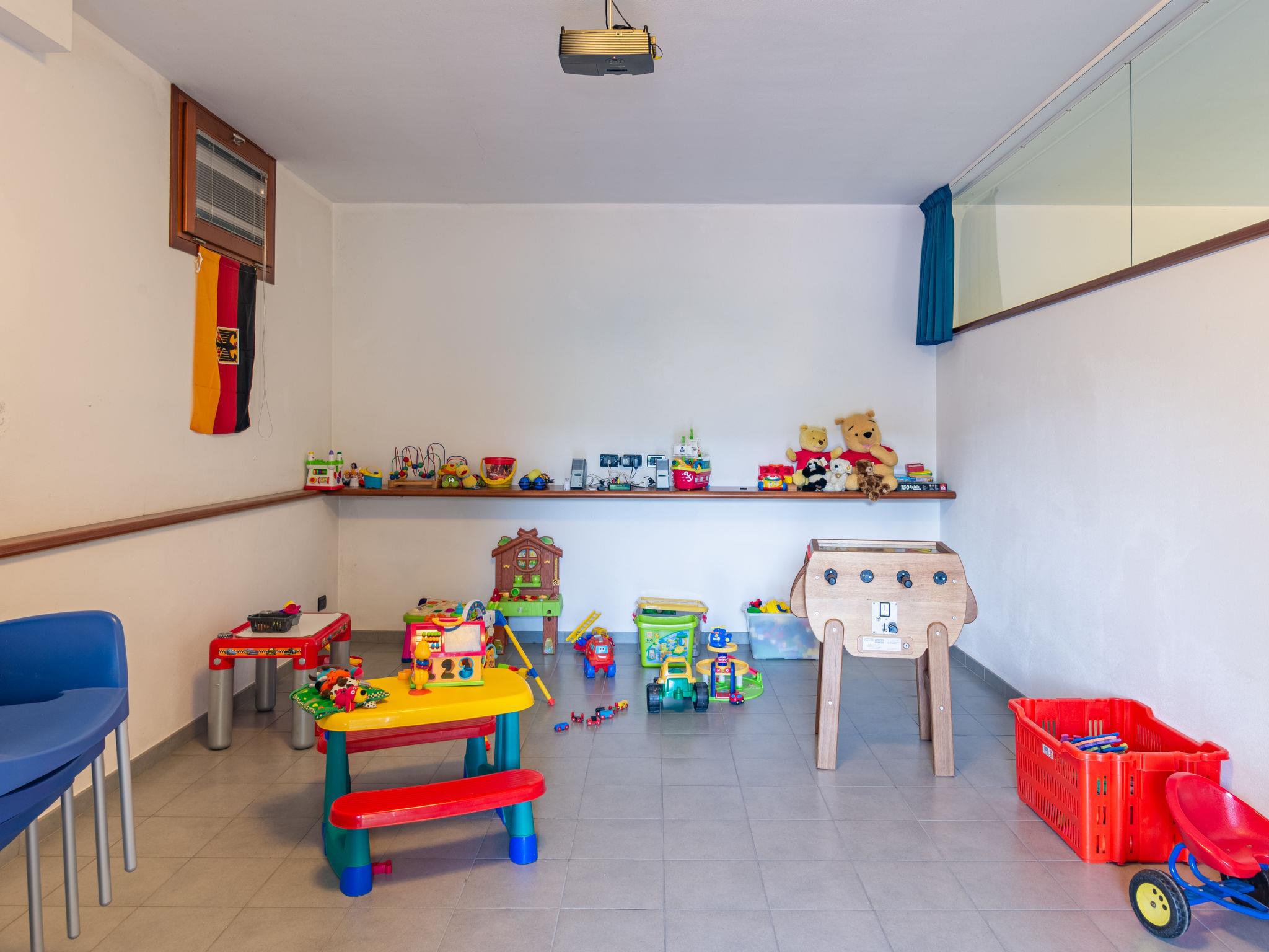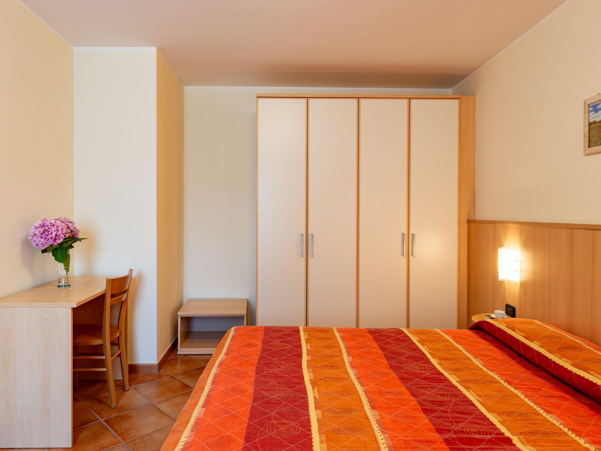 Residence "Corte Camaldoli". 20 apartments in the residence. On the outskirts, 1.2 km from the centre of Garda, on a slope, 1.5 km from the lake. For shared use: property 14'000 m2, well-kept terraced garden with lawn and trees, swimming pool (20 x 10 m, seasonal availability: 01.Apr. - 30.Oct.). WC in the pool area, outdoor shower, beach volleyball, patio, arbour, garden furniture, barbecue, children's playground. In the complex: reception, lounge with TV, internet access, WiFi, fitness room, table tennis, table football, storage room for bicycles, washing machine (for shared use), heating to be paid on the spot, bicycle rental. Bread roll service. Parking on the premises. Bus stop 20 m, pebble beach 1.5 km. Golf course (18 hole) 5 km. Nearby attractions: Peschiera del Garda 29 km, Malcesine 30 km, Verona 38 km. Hiking paths: Monte Baldo 30 km. The owner does not accept any youth groups. Residence with electric gates. Air conditioning only available from early June to mid September.