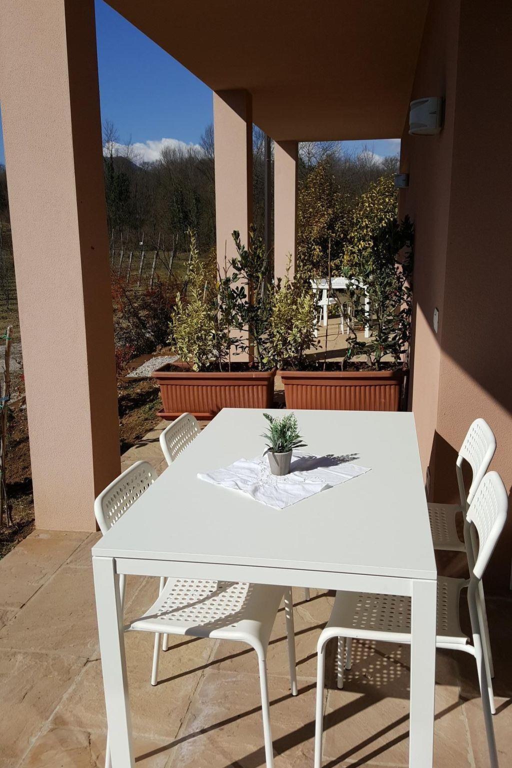 The holiday flat has a veranda with a table and chairs.