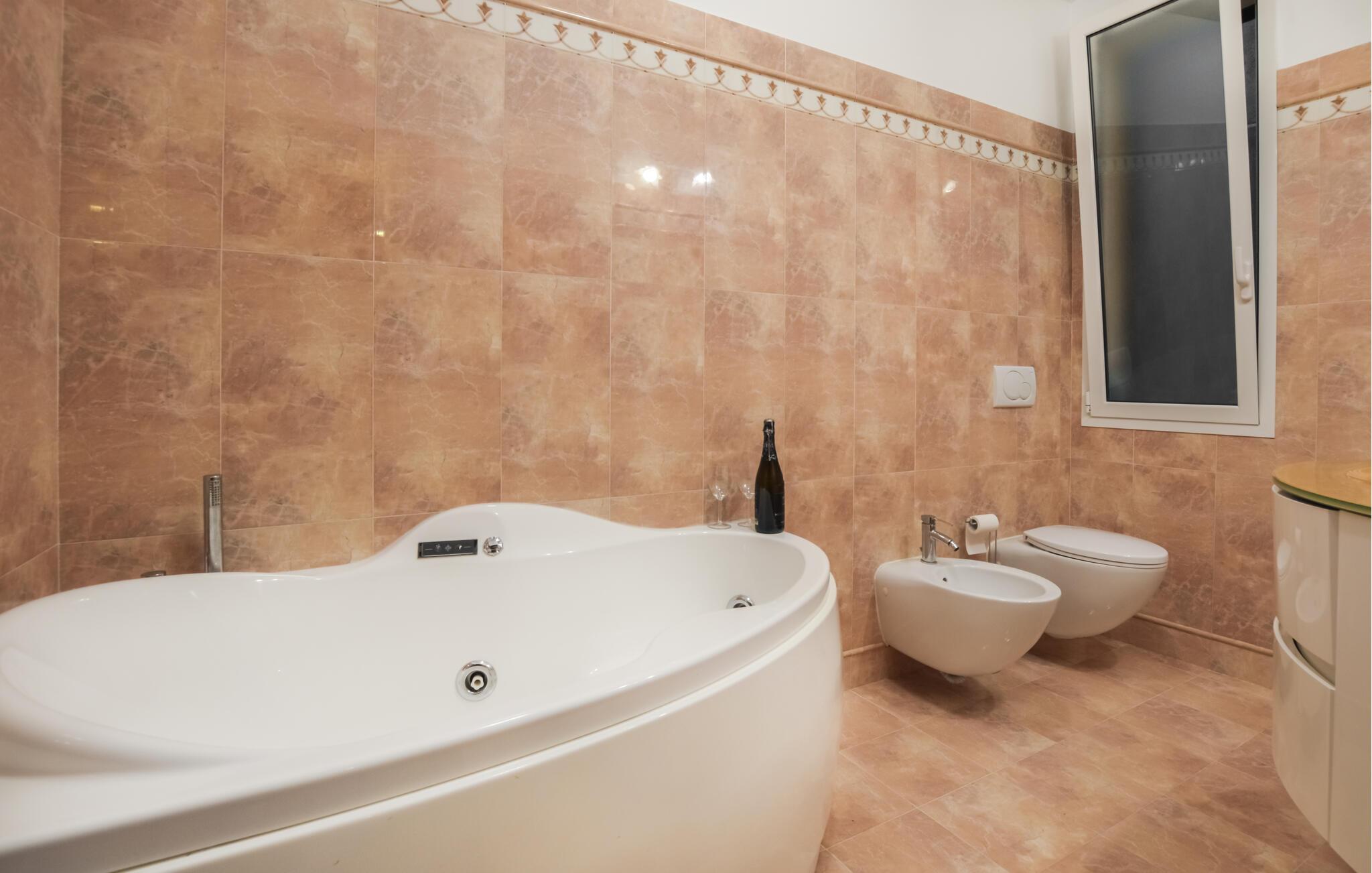 Rejs med en stor familie eller sammen med en gruppe venner til denne smagfuldt indrettede lejlighed, der byder på en varm og indbydende atmosfære. Den lyse stue er et dejligt sted at slappe af, og det veludstyrede køkken byder på perfekte betingelser for at trylle lækre retter frem. De mange soveværelser sørger for en god nats søvn, mens det fantastiske badeværelse med hammam og spabad fuldender komforten.