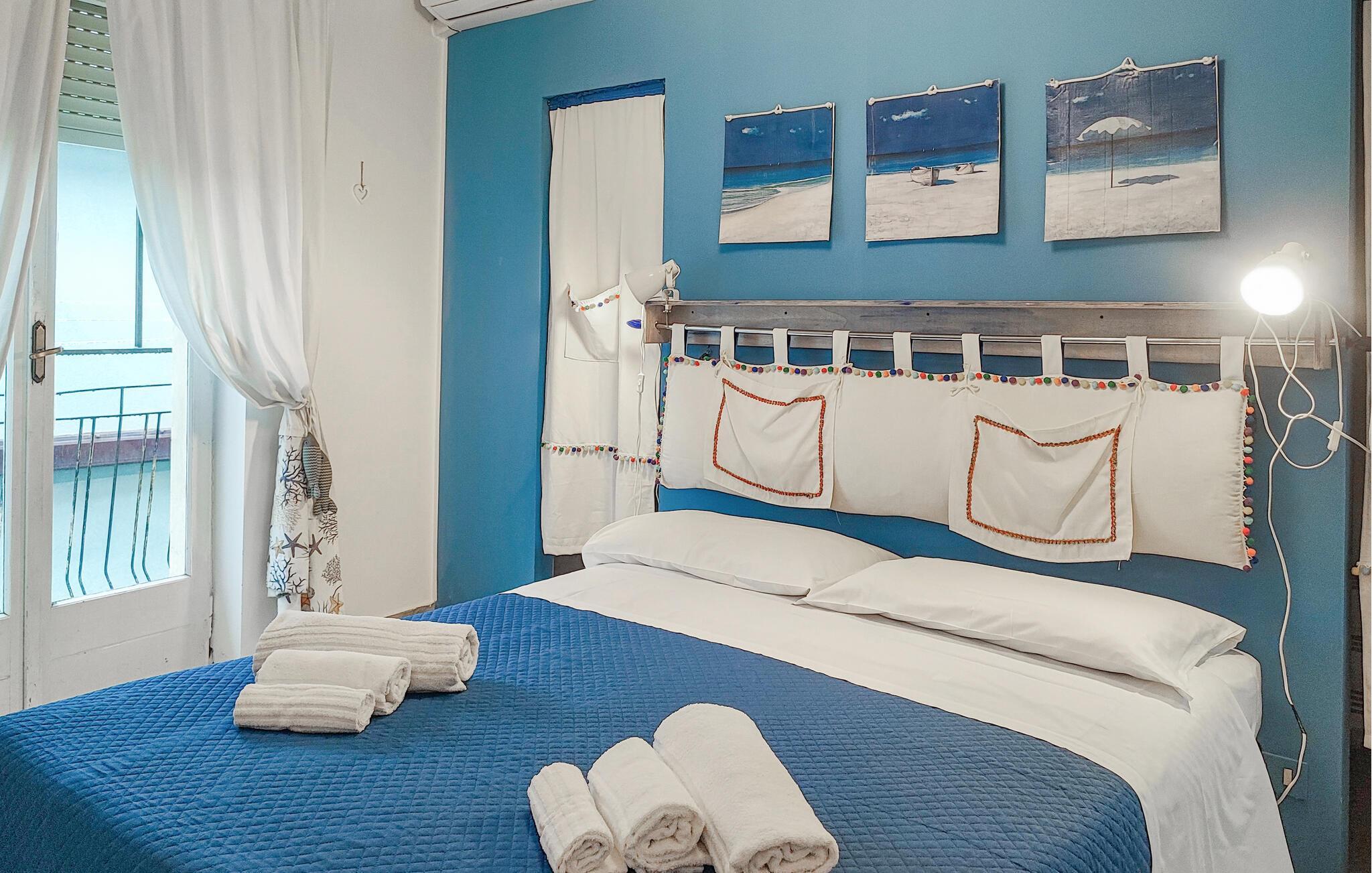 Den velindrettede lejlighed udstråler en afslappet feriestemning med lyse farver og maritime accenter. Den hyggelige opholdsstue lægger op til at tilbringe afslappende timer, mens det praktiske køkken er ideelt til at tilberede friske sicilianske specialiteter. Start dagen med en kop kaffe på balkonen og nyd udsigten over de livlige gader i Giardini Naxos.