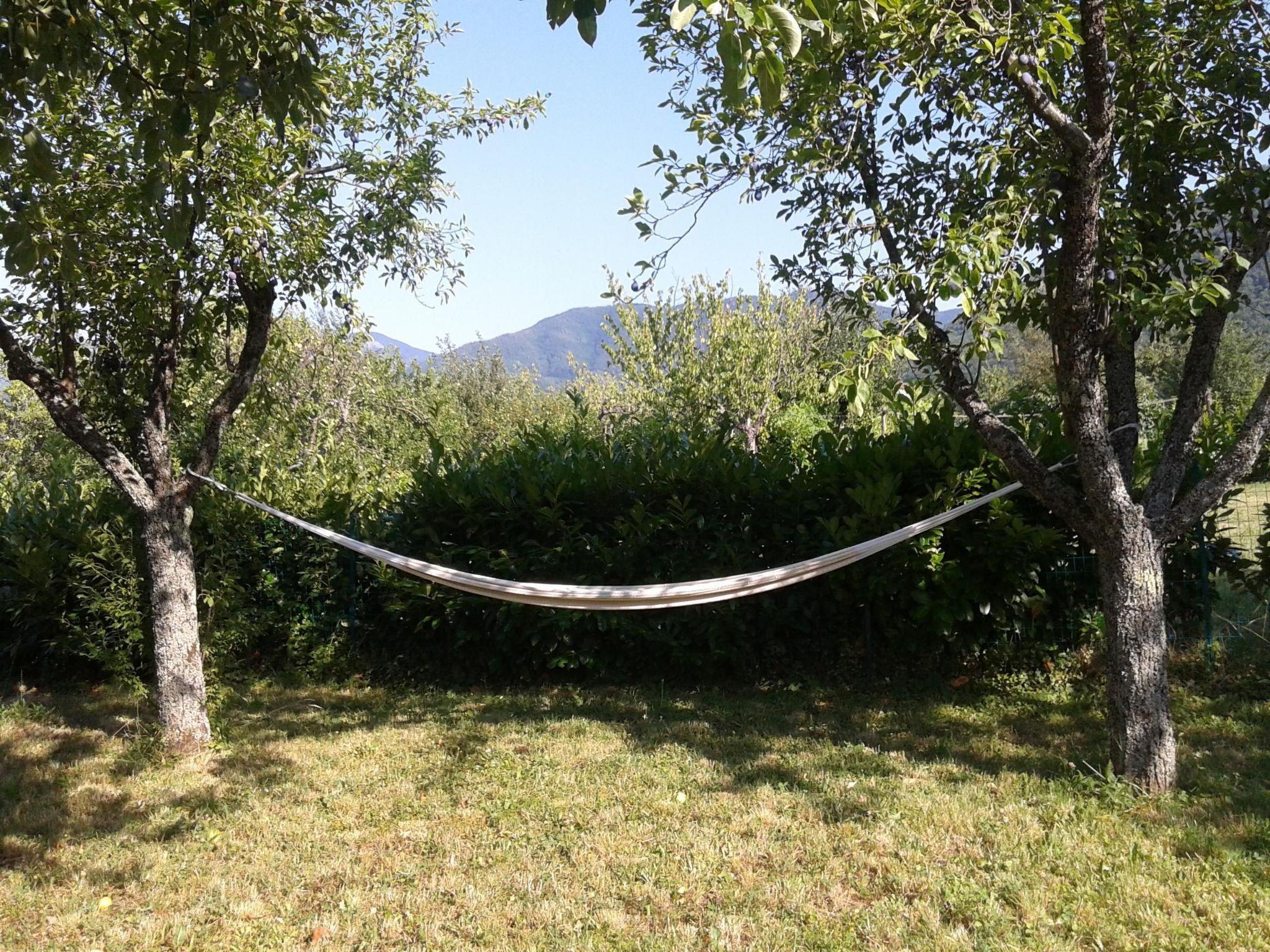 In front of the entrance there is a covered terrace, from which there is access to the completely fenced garden of about 500 square metres. In the warmer months, various garden furniture is available, so you can dine al fresco, relax on deck chairs or in a hammock and admire the magnificent view of the mountains. A children's pool is also available free of charge on request. About 80 metres from the house is a car park where you can park your car free of charge.