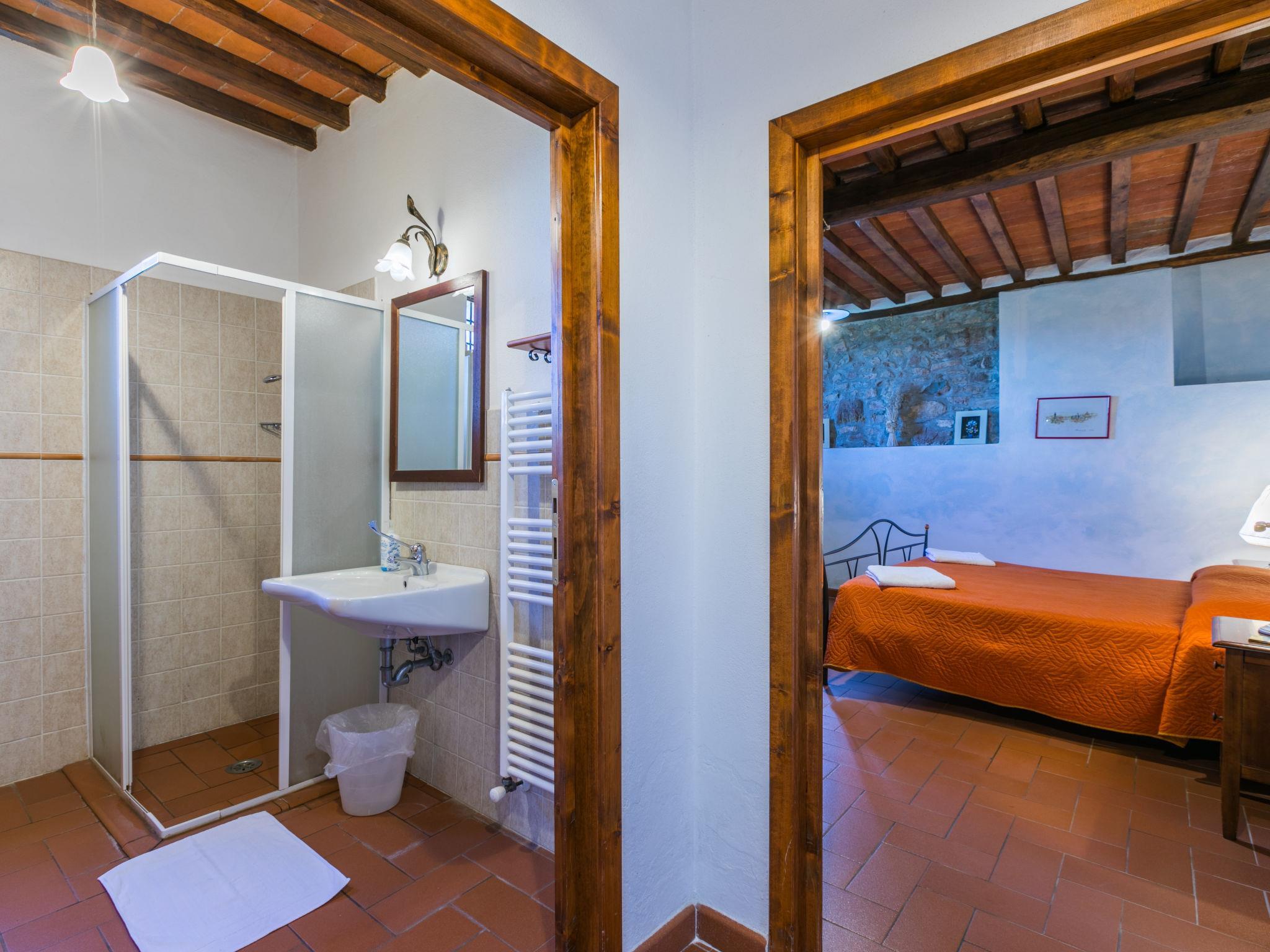 Large, rustic on a vinyard country house "Fattoria l'Ottavo", 400 m a.s.l., from the 18th century, renovated, surrounded by meadows and vineyards. 3 houses in the residence. 9 apartments in the residence. In the district of Lucolena in Chianti 12 km from the centre of Greve in Chianti, 13 m from the centre of Figline Valdarno, in a secluded, sunny, elevated position, in the countryside. For shared use: property 40 ha, natural garden, meadow, swimming pool fenced (8 x 4 m, seasonal availability: 01.May. - 15.Oct. pool opening hours: 08:00-20:00). Outdoor shower, terrace, garden furniture, barbecue, pool maintenance by the owner/gardener. In the house: reception, restaurant, breakfast room, WiFi, washing machine (for shared use). Linen change weekly. Breakfast possible on request (extra). 200 m long narrow motor access to the grounds. Parking on the premises. Shop 700 m, grocery 700 m, supermarket 12 km, shopping centre 13 km, restaurant 1 km, bar 700 m, bakery 700 m, bicycle rental 12 km, bus stop "Lucolena" 700 m, railway station "Figline Valdarno" 13 km, sandy beach "Calambrone" 110 km, indoor swimming pool 13 km, lake Trasimeno 114 km. Golf course (18 hole) 20 km, tennis 12 km, riding stable 2 km, walking paths from the house 100 m. Nearby attractions: Firenze 37 km, Siena 50 km, Arezzo 54 km, San Gimignano 65 km. Please note: car recommended. Reception open 10:00-17:00 hrs. Suitable for families, baby equipment (included). Suitable for events. Local sale of farm products. Please note: the owner lives on the same property. All houses/apartments are individually designed/furnished.