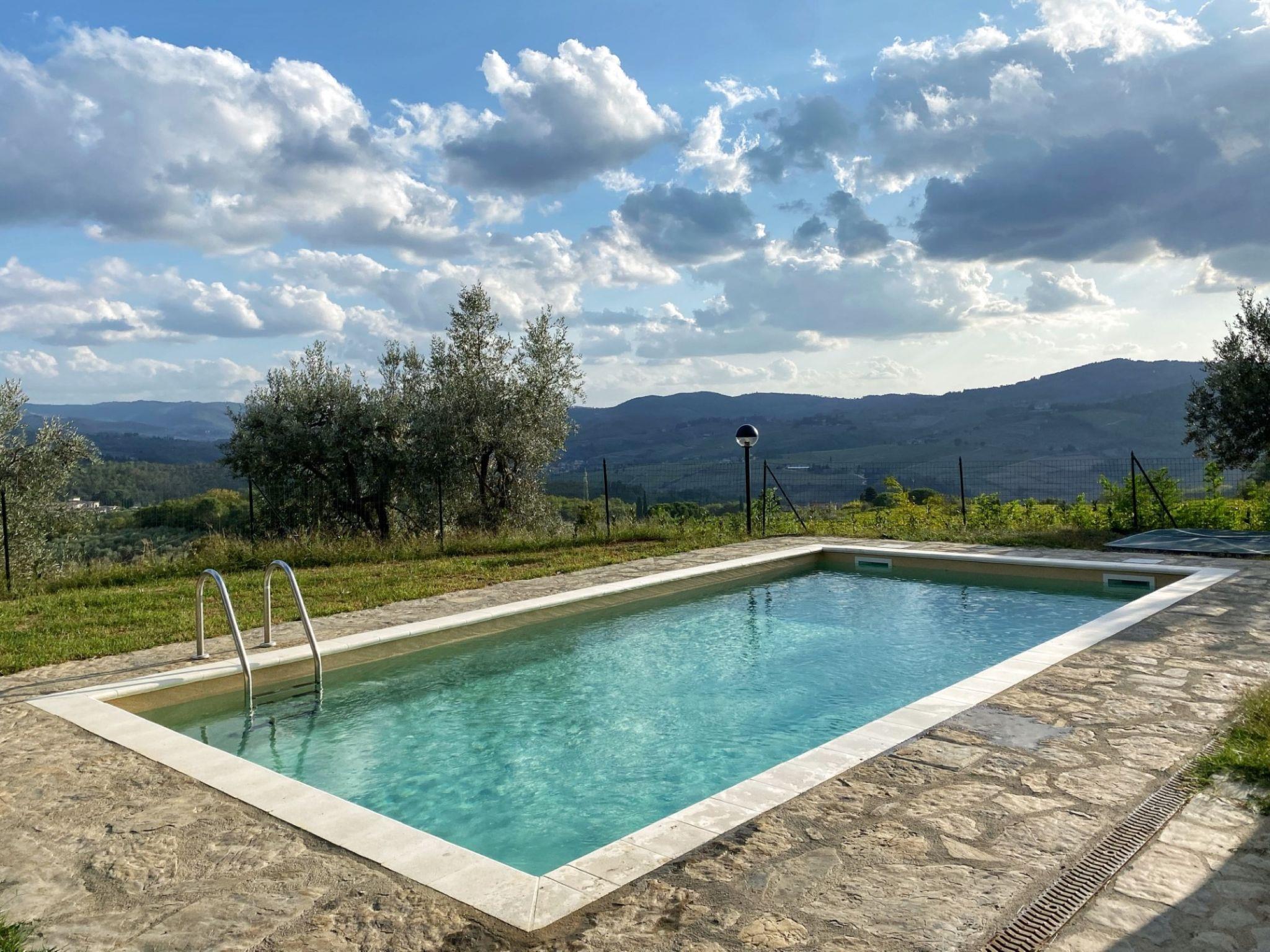 Greve in Chianti: Rustic on a vinyard agricultural estate "Valmontese", surrounded by meadows and vineyards. 3 apartments in the residence. 4 km from the centre of Greve in Chianti, in a secluded, sunny, elevated position, 100 km from the sea, in the countryside. For shared use: natural state property 5'000 m2 (fenced), plants and trees, swimming pool fenced (4 x 8 m, seasonal availability: 01.May. - 15.Oct.). Outdoor shower, patio, terrace, garden furniture, barbecue, pool maintenance by the owner/gardener. In the house: reception, WiFi. 1.5 km long bumpy motor access to the grounds. Parking at the house. Shop 4 km, grocery 4 km, supermarket 4 km, restaurant 2.5 km, bicycle rental 4 km, bus stop 2.5 km, railway station "Firenze" 26 km. Golf course (18 hole) 12 km, tennis 4 km, walking paths from the house 100 m. Nearby attractions: Firenze 26 km, San Gimignano 45 km, Siena 65 km. Please note: car recommended. Baby equipment (included). Local sale of farm products. Residence with electric gates. The owner lives on the same property. The owner has a dog. Animals in the neighbourhood. All houses/apartments are individually designed/furnished.