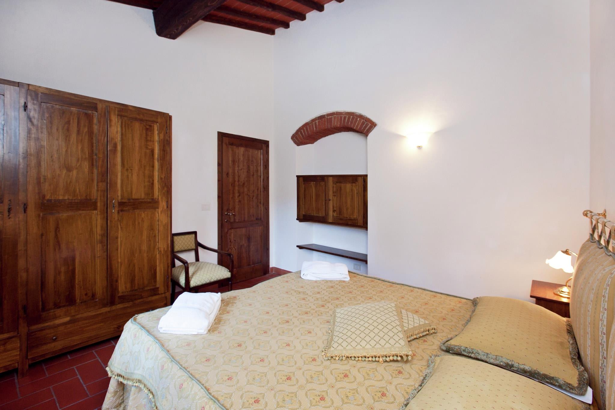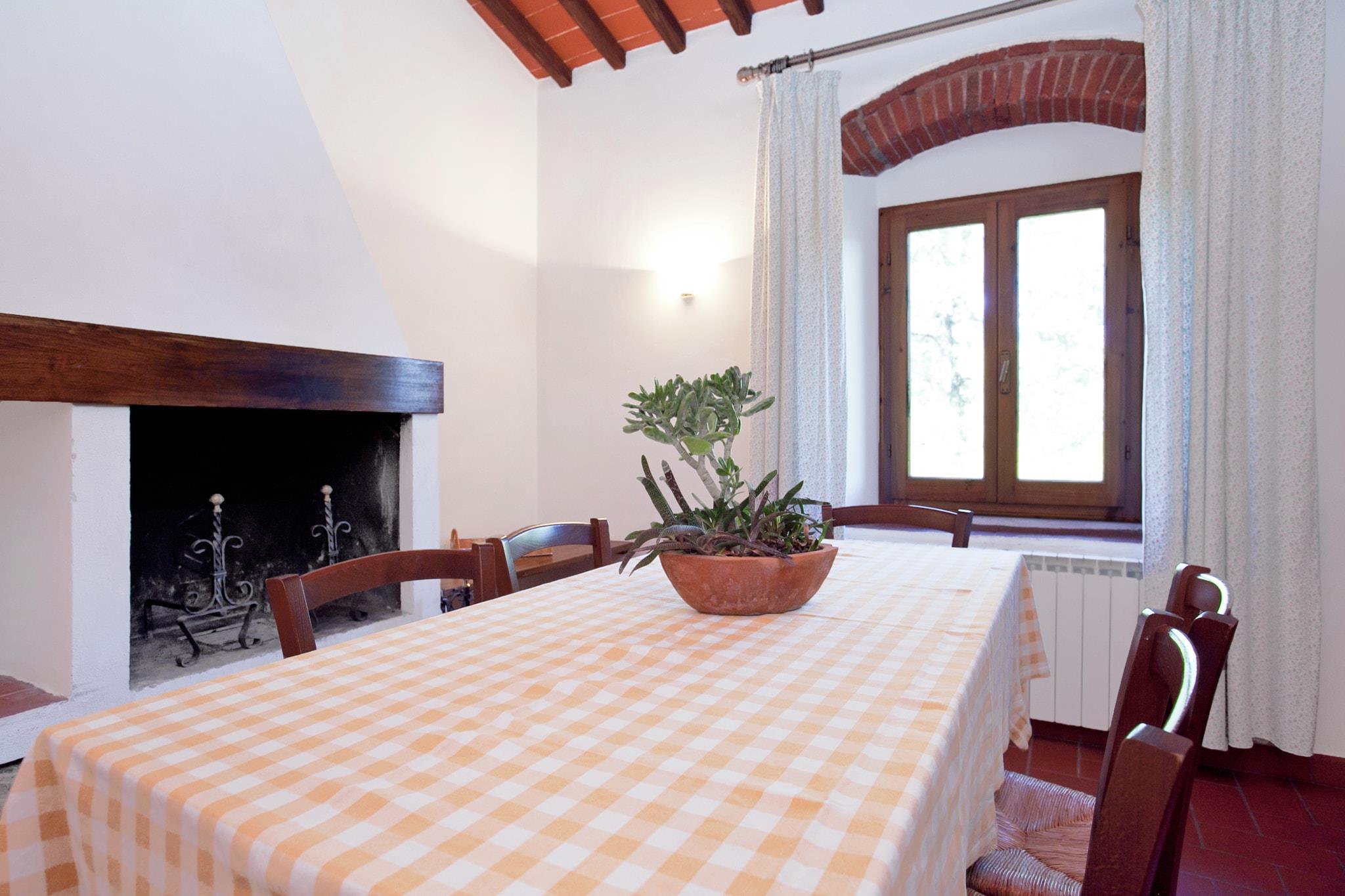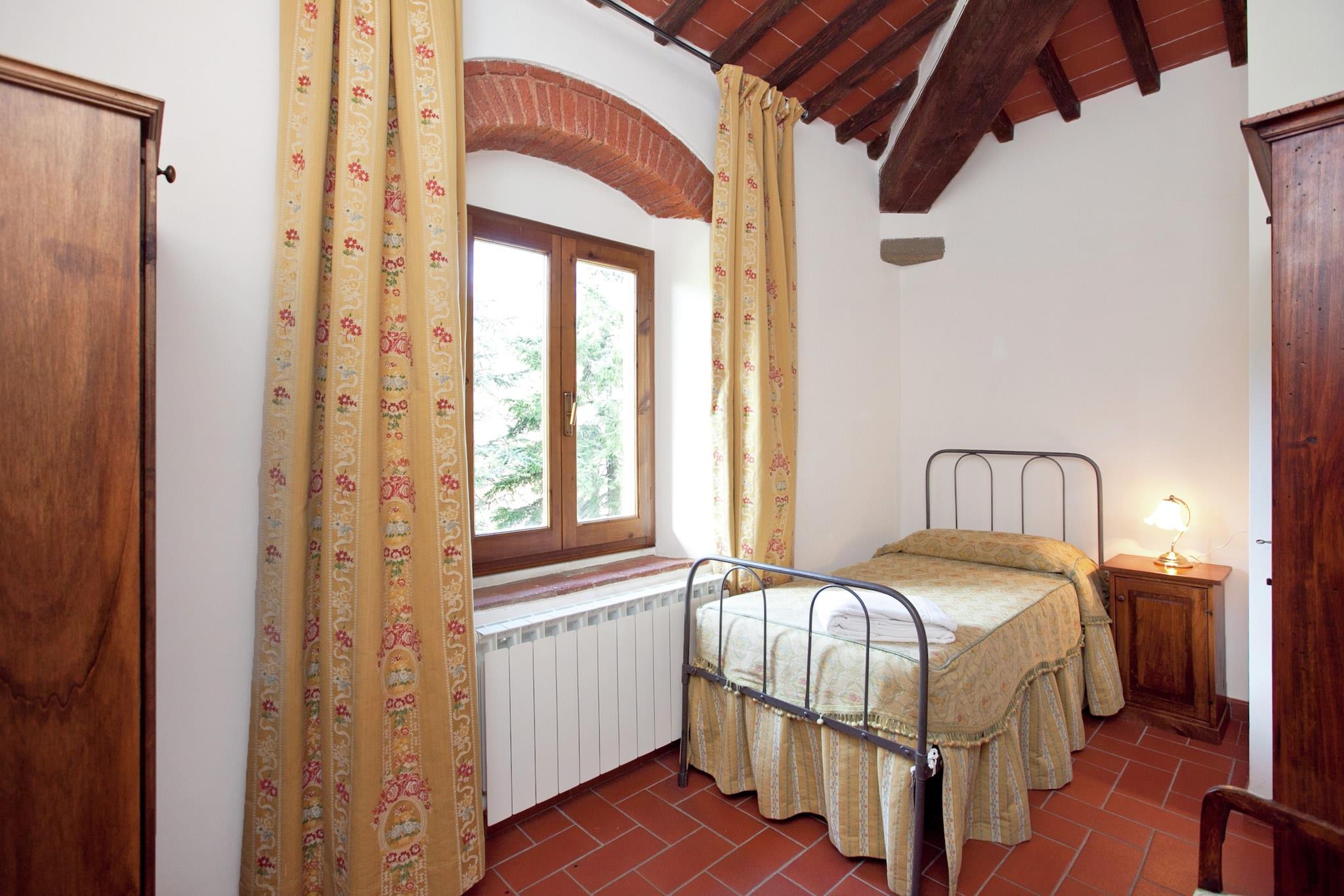 I bakkerne i Toscana finder du denne charmerende lejlighed beliggende på en historisk vin Chianti Classico, lavet af den røde signaturdrue fra Toscana, dens ejendom ligger nær Greve in Chianti - hjertet af Chianti Classico-regionen. Beliggende i et traditionelt toscansk bondehus, blander det rustik charme med fredfyldte udsigter over landskabet, og tilbyder et fredeligt tilflugtssted perfekt for familier eller par, der ønsker at slappe af blandt vinmarker, olivenlunde og kulturrige byer. Træd udenfor i den smukt vedligeholdte fælles have, hvor børn kan nyde legeredskaber, mens du slapper af under solen. Køl af i den store fælles swimmingpool (åben maj til september) eller samles til en grill efter en dag med vinsmagning. Den stenbyggede lejlighed har en indbydende stue/spisestue med pejs og et fuldt udstyret køkken, ideelt til afslappede toscanske middage. En høj stol og børneseng er til rådighed for unge rejsende. Kun 7 km væk ligger den fortryllende by Greve in Chianti, kendt for sit charmerende hovedtorv, lokale håndværksbutikker og den berømte Chianti Classico vinfestival, der afholdes hver september. De nærliggende Panzano, Radda og Castellina byder på postkortværdige landskaber og vine i topklasse. For en dagstur er Siena og Firenze - rig på kunst, arkitektur og historie - inden for en times kørsel. Madelskere vil nyde nærliggende trattoriaer, der serverer regionale favoritter som florentinsk bøf og ribollita. En hyggelig landsbybar kun 1,5 km væk er perfekt til din morgen-espresso eller til at hente lokale råvarer. Til ridesportssjov ligger et ridecenter kun 5 km derfra, og golfspillere kan spille afsted kun 20 km fra ejendommen.
