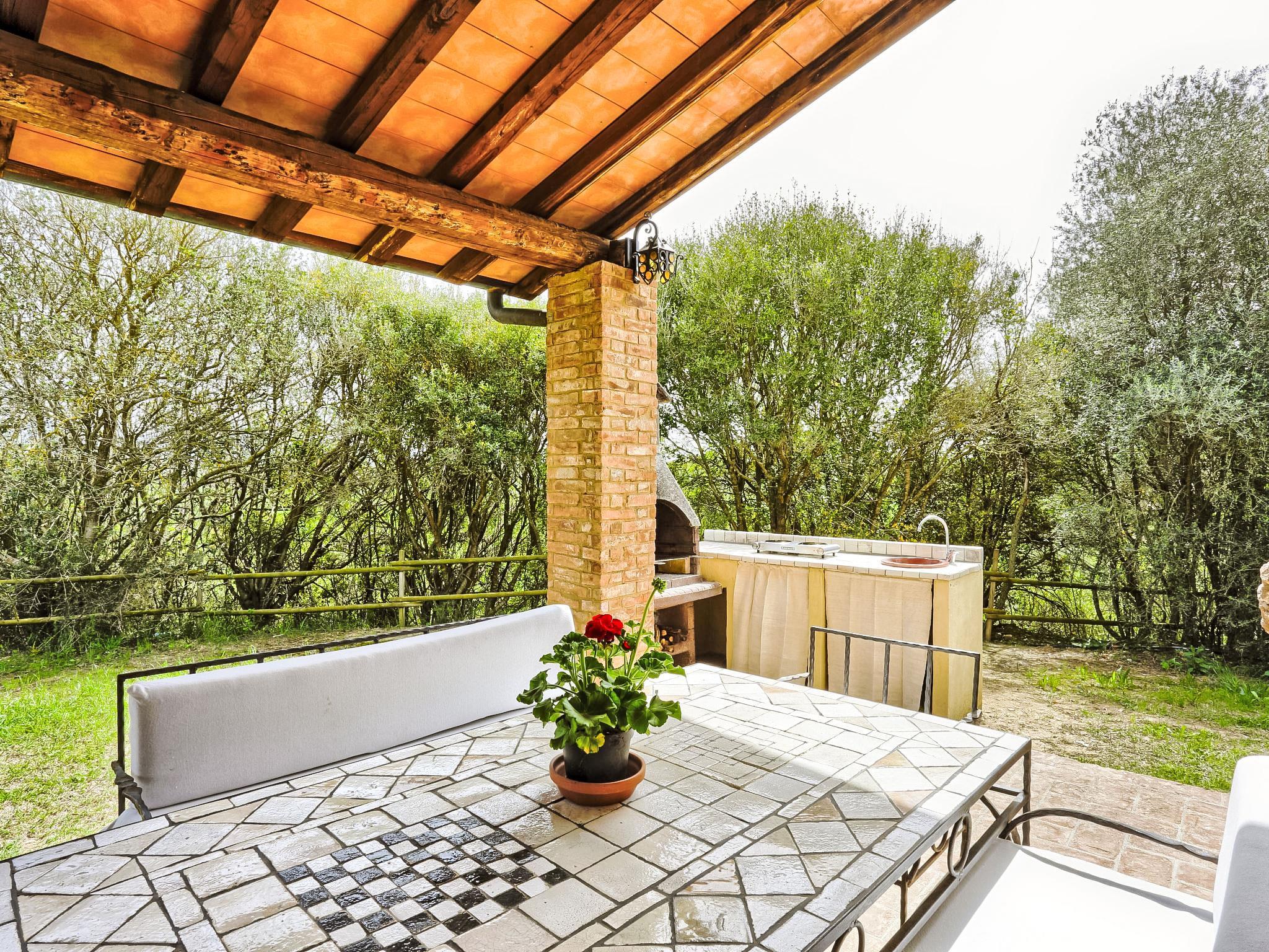 "Sweet Maremma", 3-room house 50 m2, on the ground floor. Renovated, tasteful furnishings: dining room with dining table and TV (flat screen), air conditioning. Exit to the loggia. 1 double bedroom with shower/WC and air conditioning. 1 double bedroom with air conditioning. Kitchenette (4 hot plates, oven, dishwasher, X ceramic glass hob hotplates). Shower/bidet/WC. Air-conditioning, forced-air heating (extra). Large patio roofed. Terrace furniture, sitting area. View of the countryside. Facilities: washing machine. Internet (WiFi, free). Maximum 2 pets/ dogs allowed. Please note that the extra bed is only for a child up to 11 years old age. IT053002B5I73F3W3J