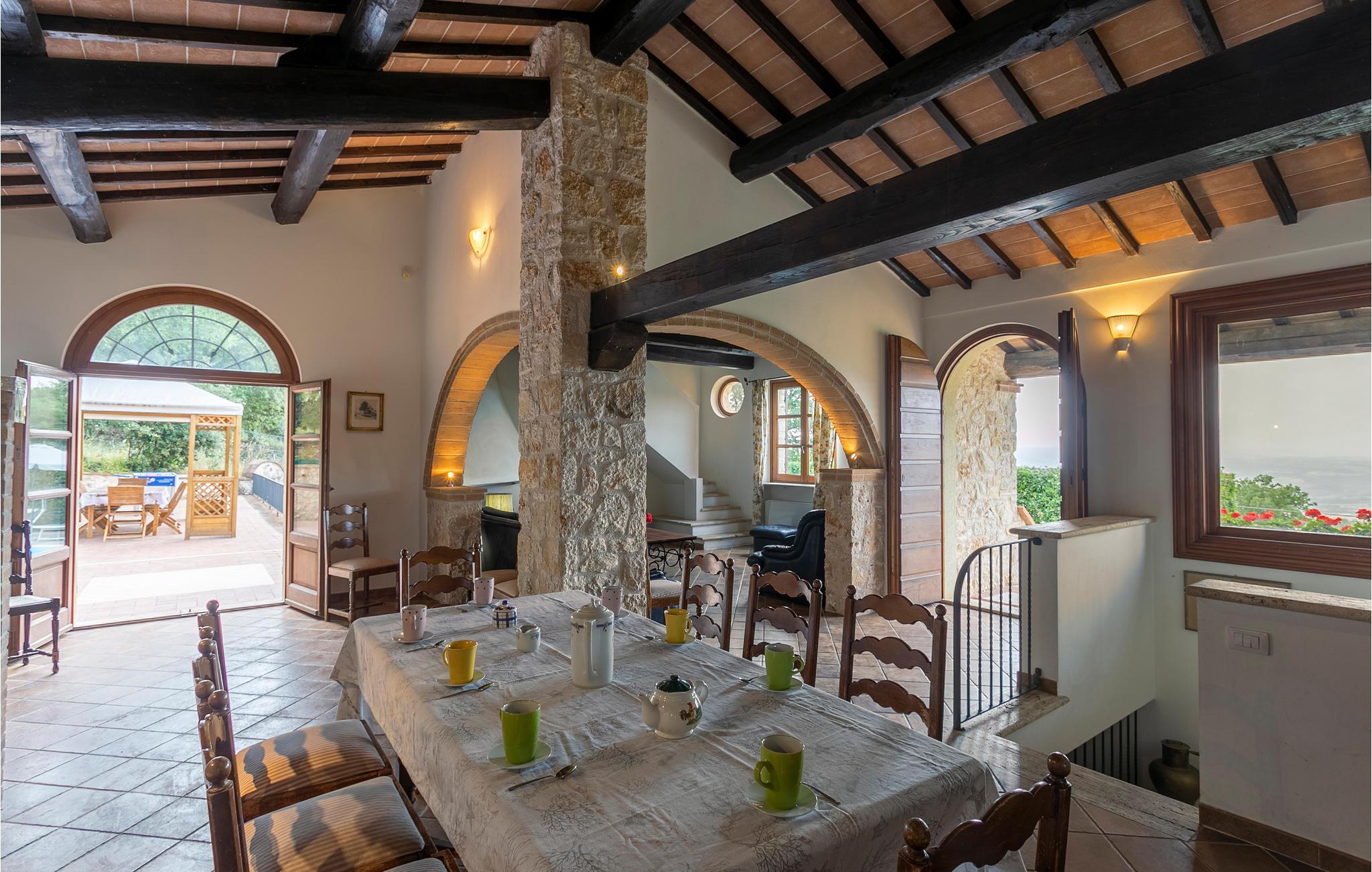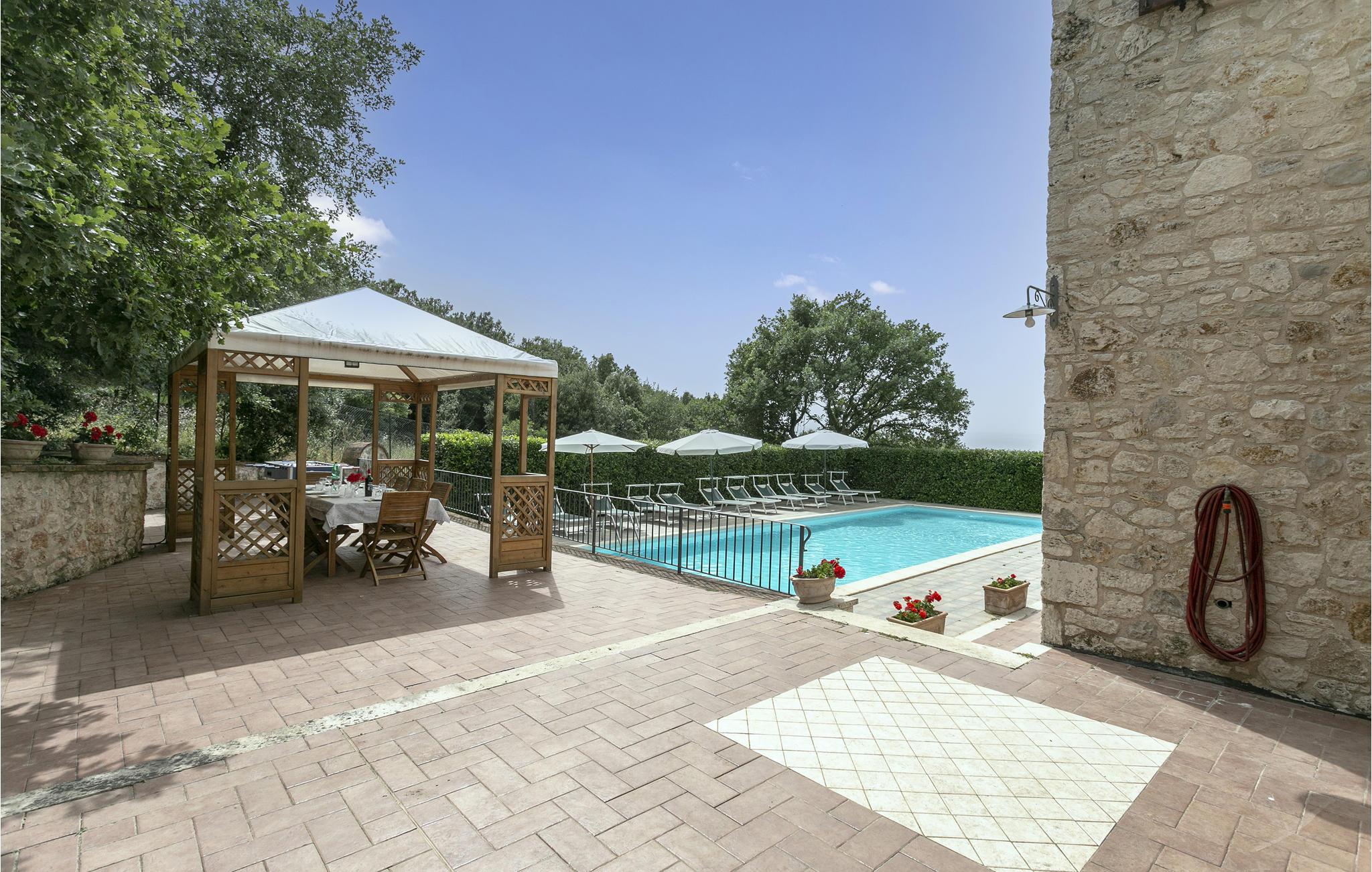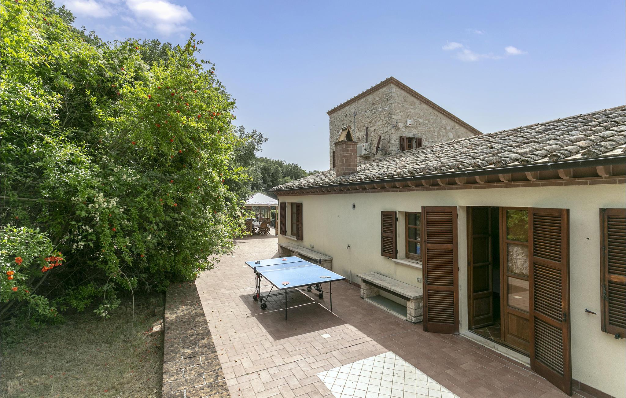 Roligt beliggende, smukt, stort landhus i sten med udsigt til landsbyen Guardea (1,5 km), Alvianosøen og Tiberdalen - en rigtig naturoase. Den 1,1 hektar store grund prydes af skov, olivenlunde og frugtplantager. I haven har I en skøn swimmingpool og et grøntområde, hvor I kan nyde jeres måltider i det fri. Vinduerne i stueetagen er højt placerede, så herfra er ingen udsigt. Hushjælp ved forespørgsel (afregnes på stedet). Afstande: Orvieto 20 km, Todi 40 km, Viterbo 45 km, Tuscania 70 km samt Perugia 80 km. Perugia er et yndet udflugtsmål, hvis forhøjet beliggende gamle by har en helt særlig atmosfære, mange små gader og et væld af kulturskatte. Se det overdådige Palazzo dei Priori med den unikke udvendige trappe og Umbriens nationale kunstmuseum. I begyndelsen af hver juli afholder Perugia desuden den store, kendte jazzfestival Umbria Jazz, og i oktober en chokolademesse, en sand forkælelse for jeres gane. På rideentusister venter et af Italiens største rideanlæg i nærheden af feriehuset.