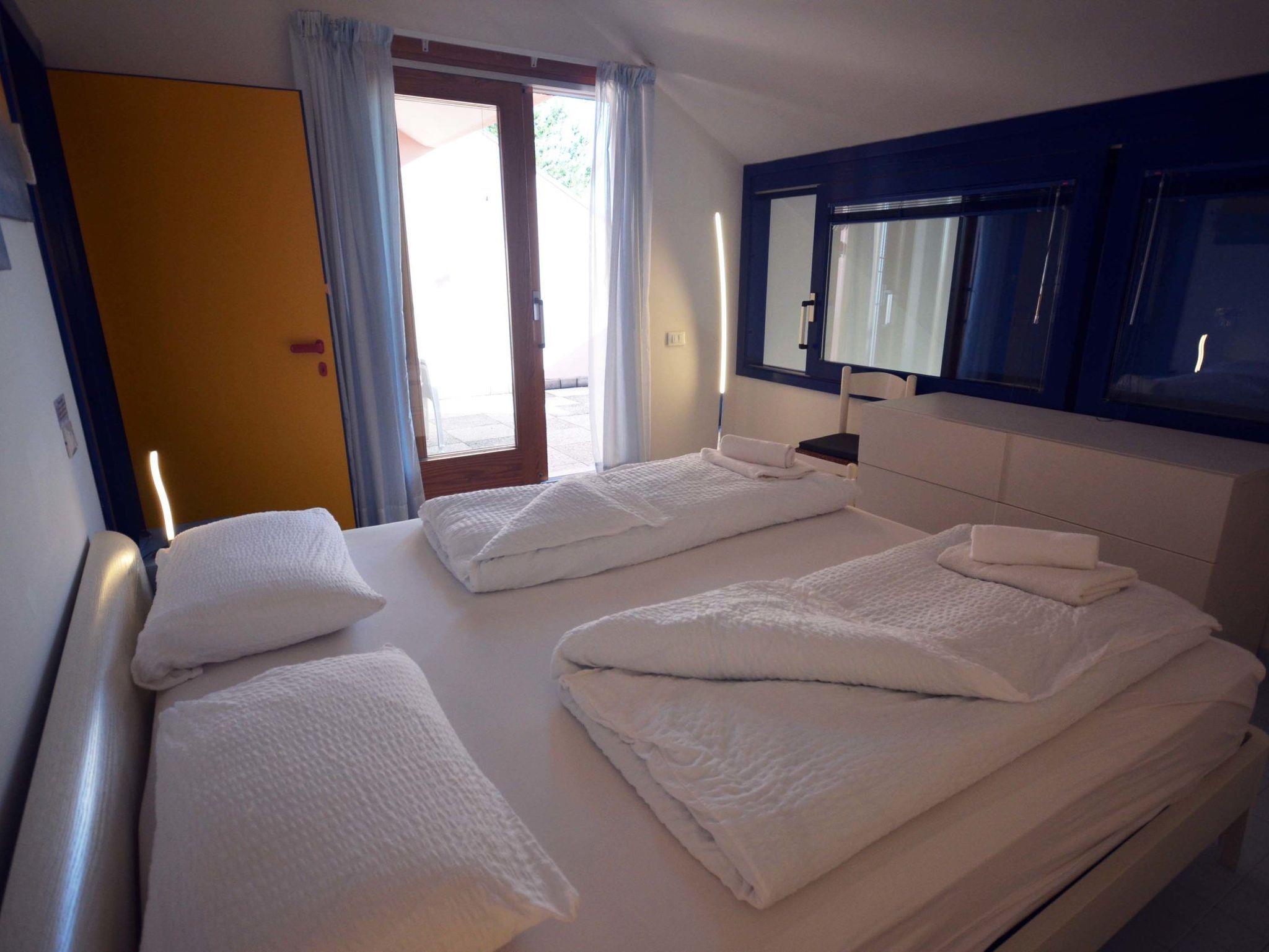 • Zwei Schlafzimmer je mit Tür zu Nord-Terrasse, Doppelbett / Kajütenbett