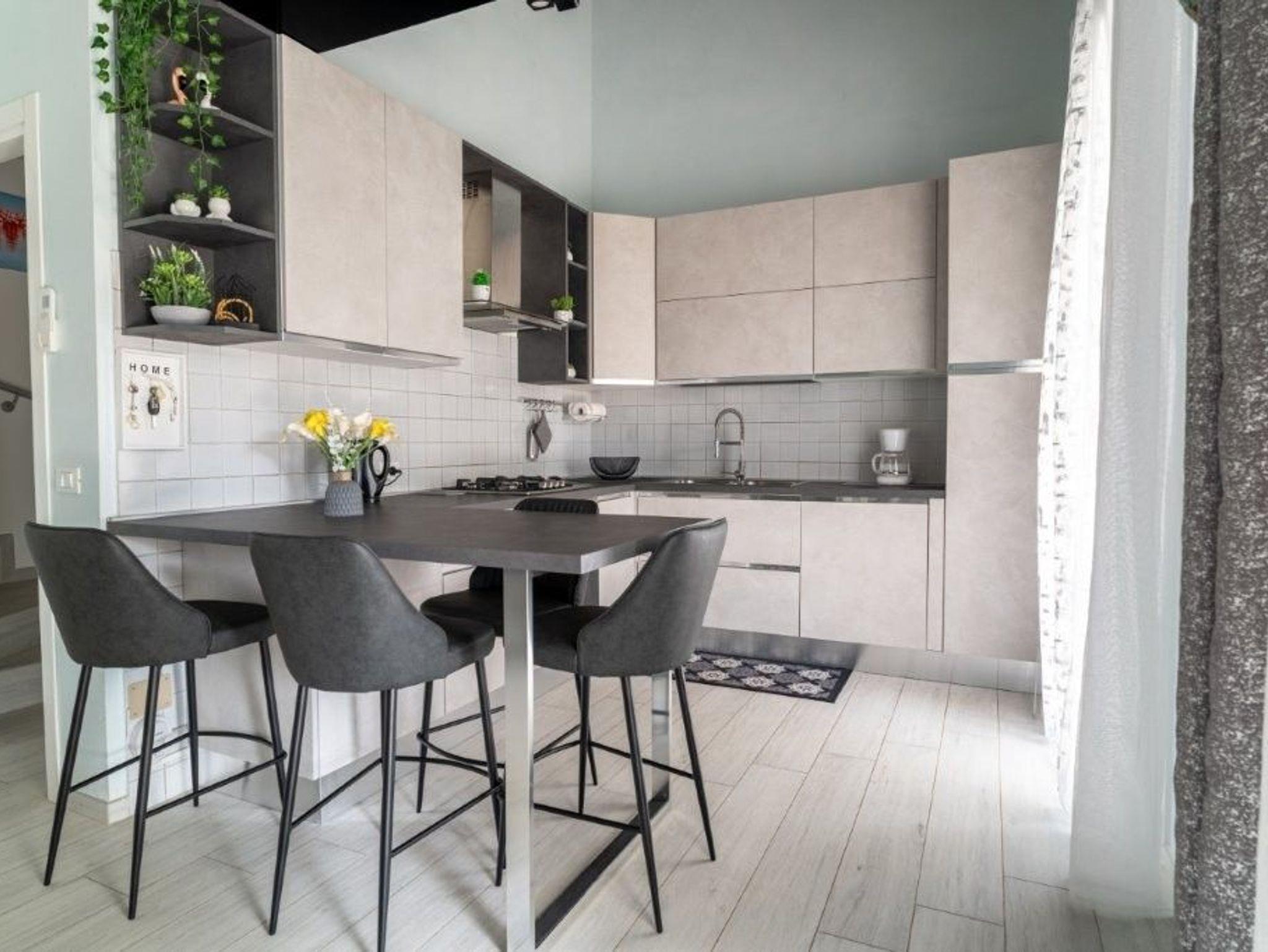 • Gut ausgestattete Küche mit Kaffeemaschine, Backofen, Kühlschrank mit Gefrierfach und Spülmaschine