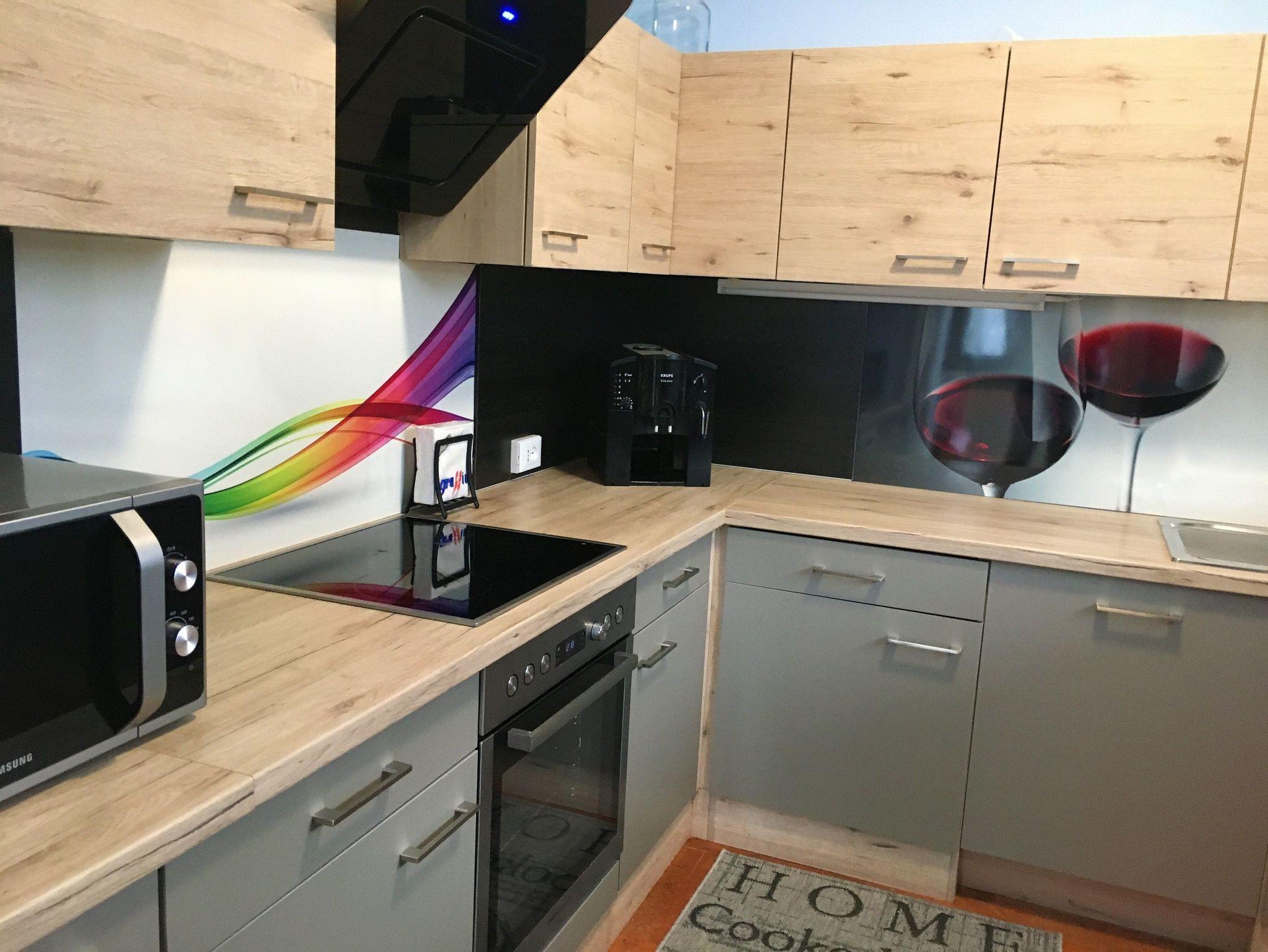 • Komplett ausgestattete Küche, mit Backofen, Toaster, Kühlschrank, Gefriechfach, Spülmaschine, Mikrowelle, Kaffeemaschine, Wasserkocher