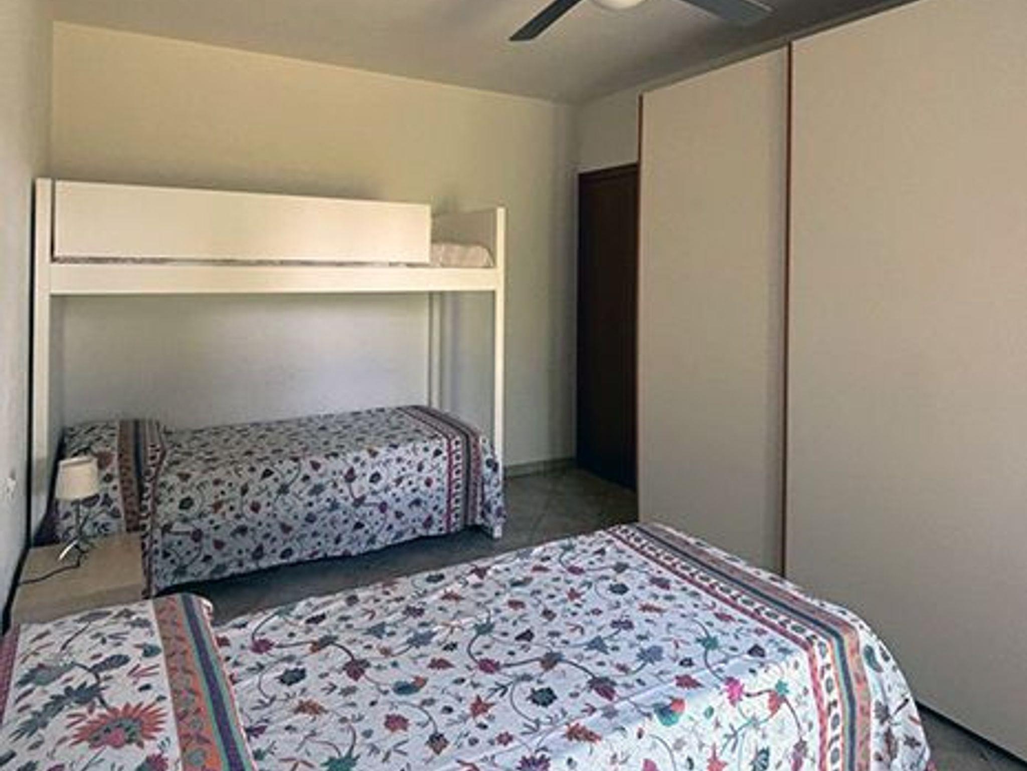 • Ein Schlafzimmer mit einem Einzelbett und einem Etagenbett (Erwachsenengröße) mit Kleiderschrank, Deckenventilator und Fenstertüren mit Blick auf den Garten.