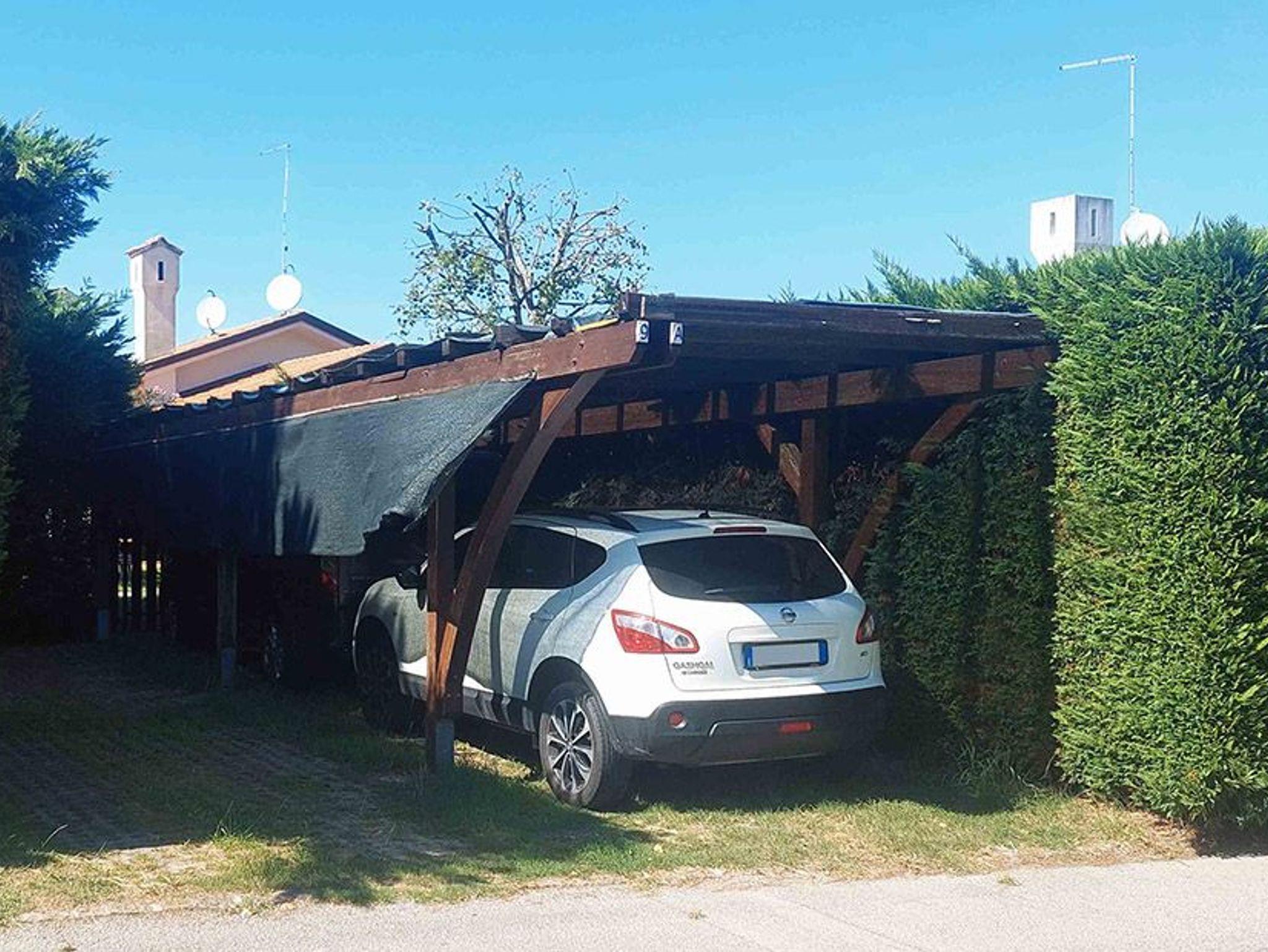 • Überdachte Pergola im Freien mit Kamin zum Grillen, ausziehbarem Holztisch, Schrank zur Mülltrennung und ein Schuhschrank.