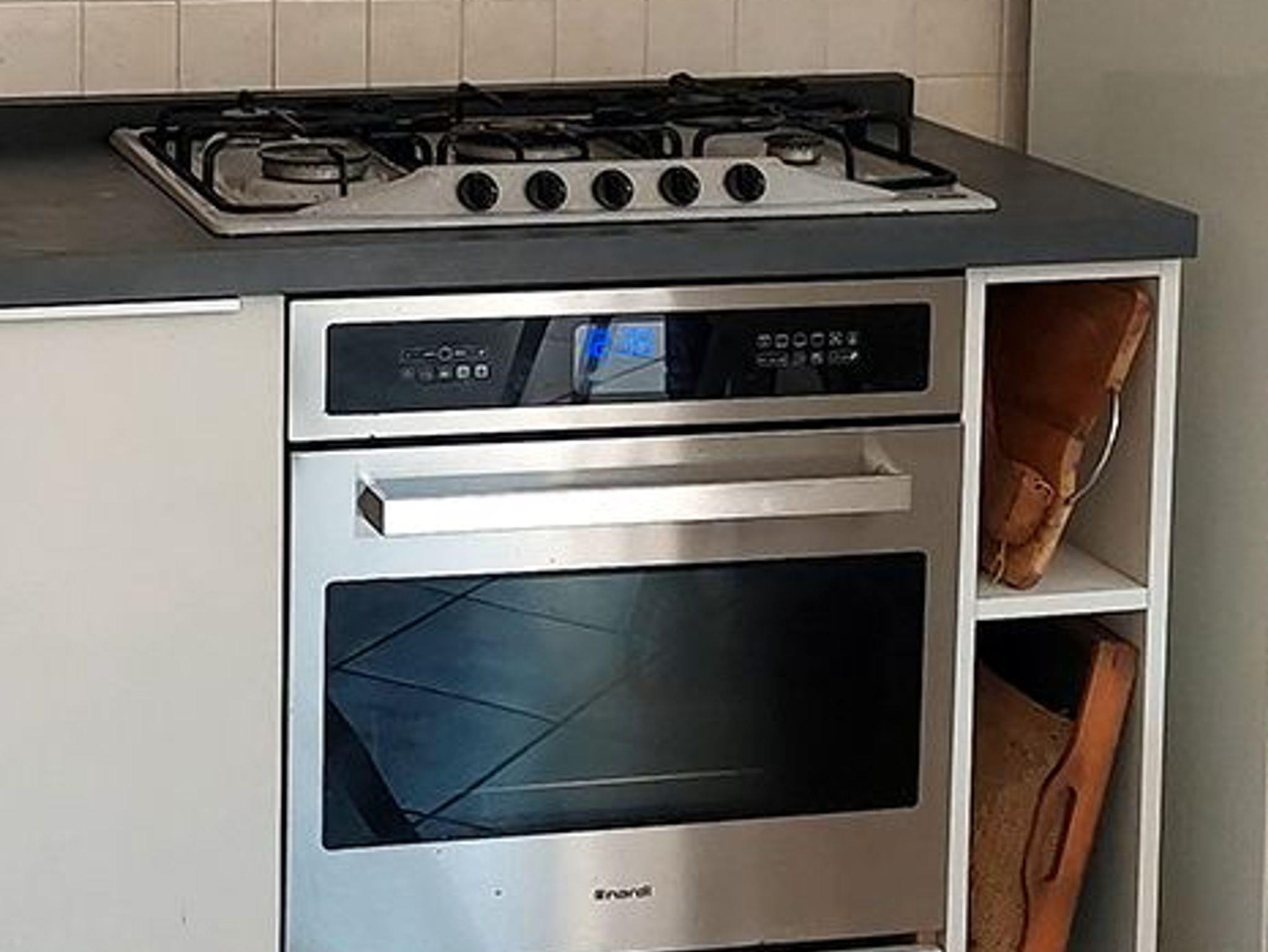 • Gut ausgestattete Küche mit Herd, Backofen, Geschirrspüler, Kühlschrank mit kleinem Gefrierfach, Kaffeemaschine, Toaster, Wasserkocher, Geschirr und Kochutensilien.