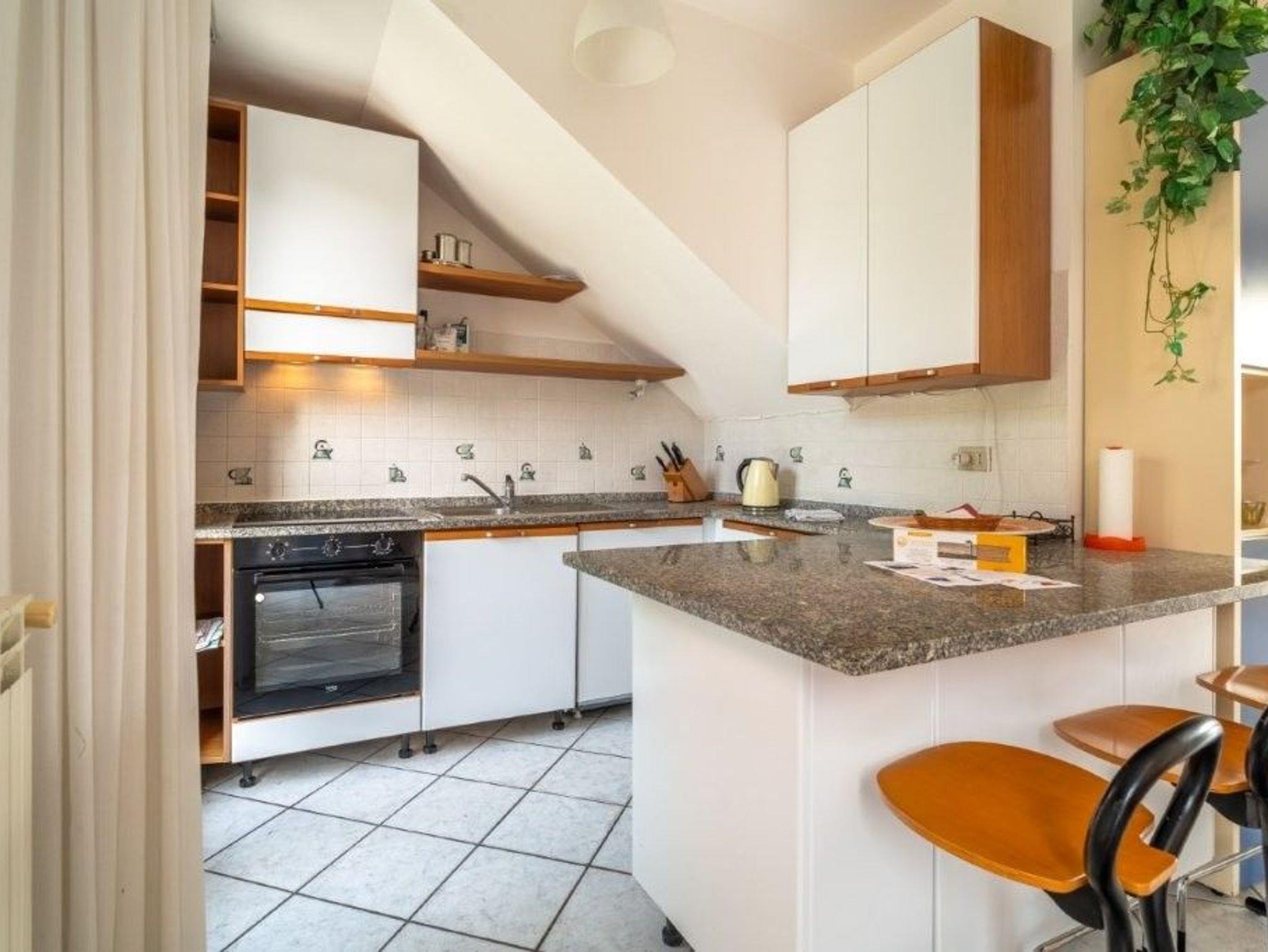 • Gut ausgestattete Küche im Wohnbereich mit Kaffeemaschine, Wasserkocher, Backofen, Kühlschrank mit Gefrierschrank und Spülmaschine