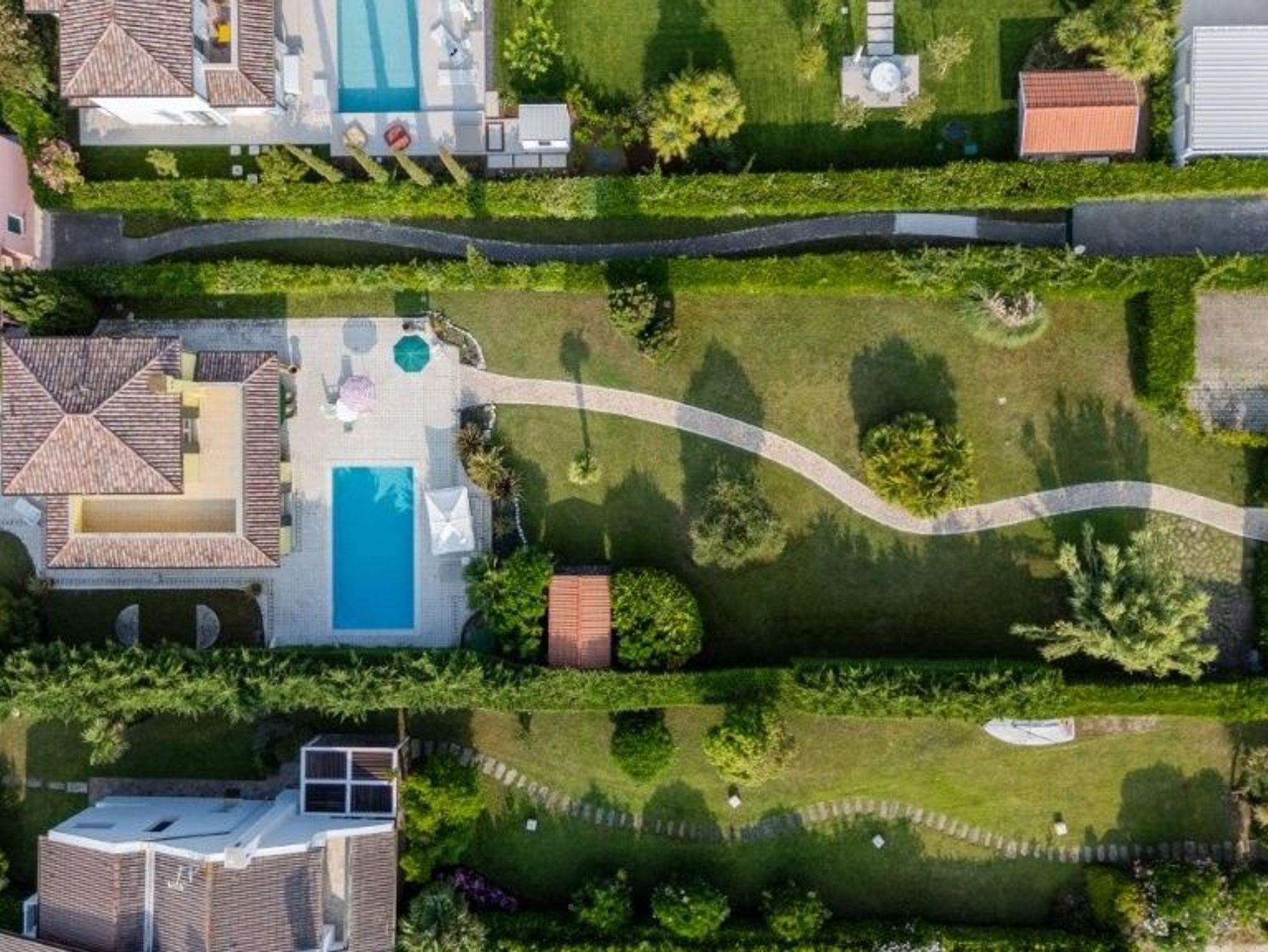 Ein sehr gepflegter, großer Garten mit Gartenmöbel, Sonnenliegen und Pool