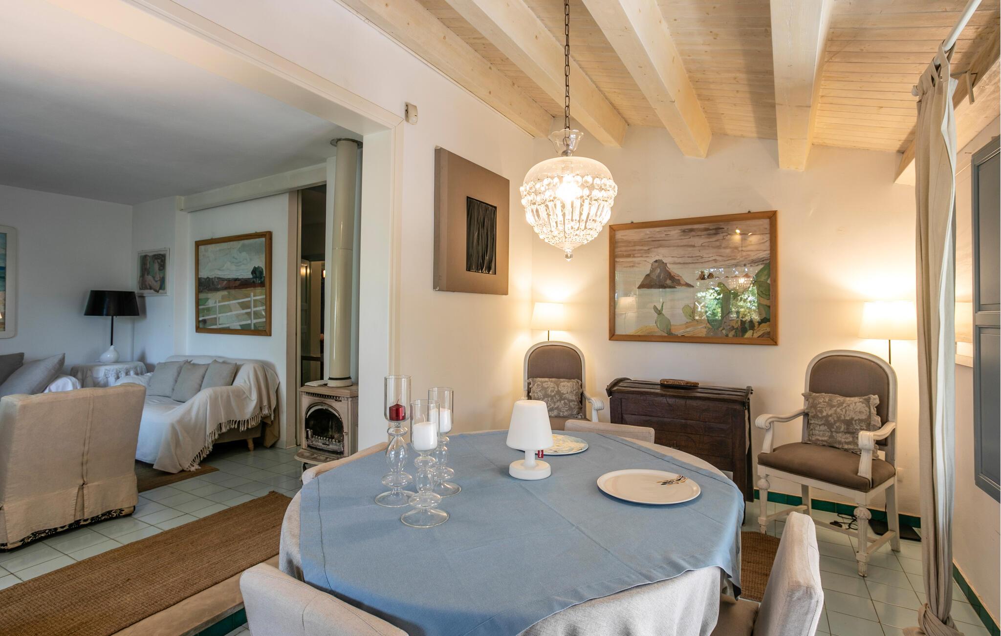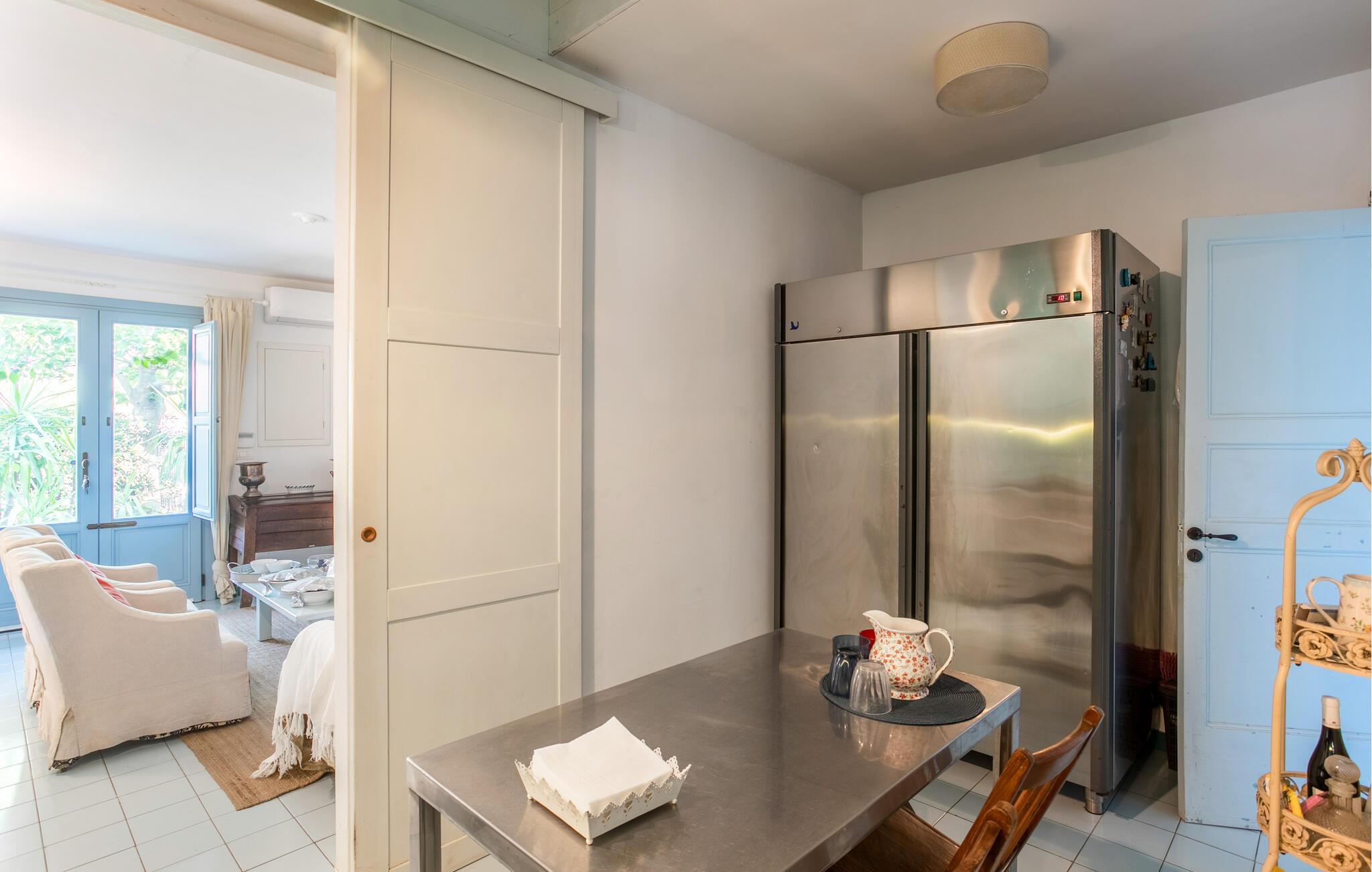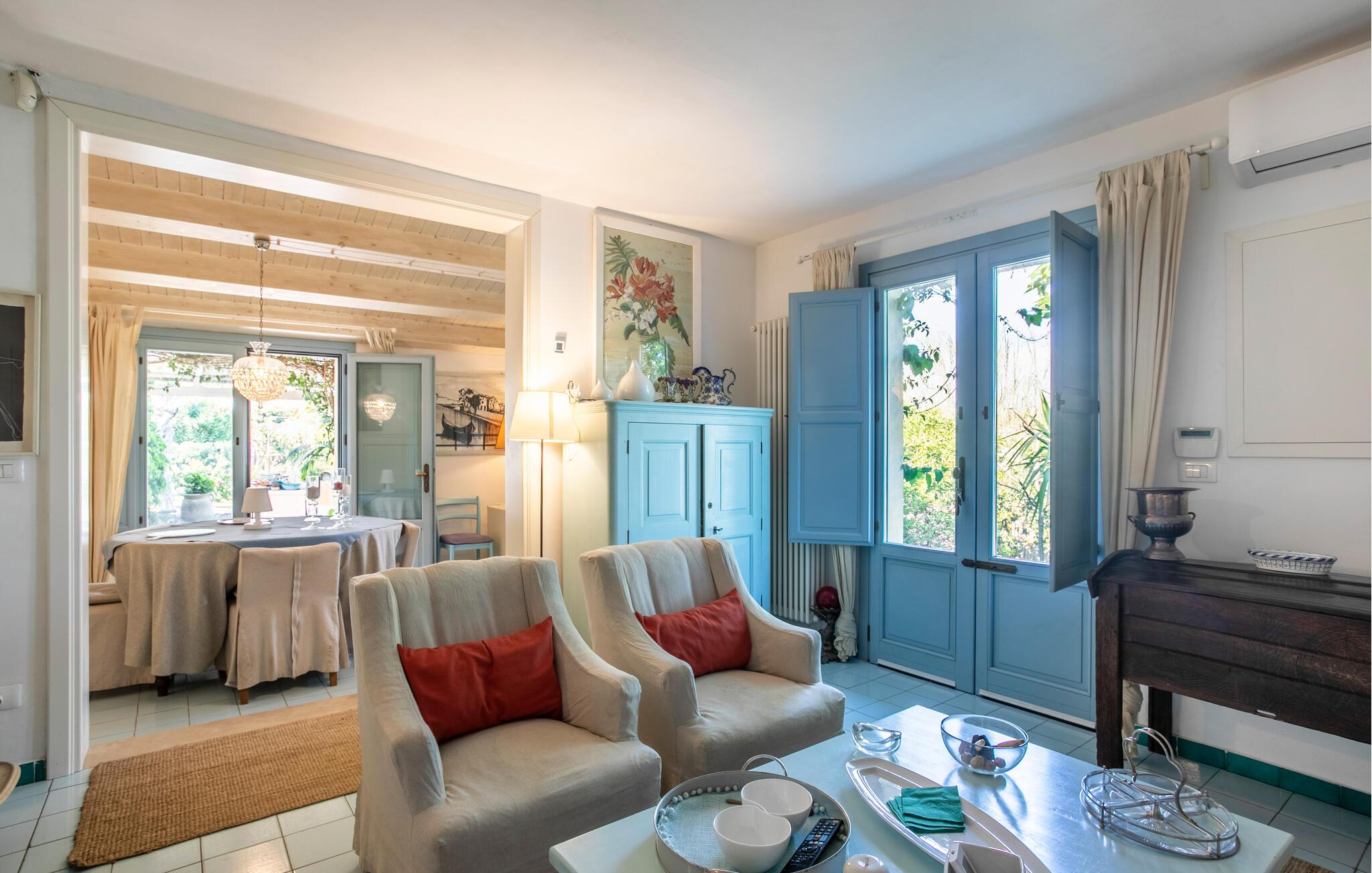 Huset er nydeligt indrettet, og særligt det veludstyrede opholdsområde og det farverige køkken emmer af autenticitet og ro. Den rummelige, overdækkede terrasse og udendørsområdet er særligt indbydende, og her er der lagt op til afslapning og sociale måltider i det fri. I kan også nyde middelhavsstemningen i den grønne have.