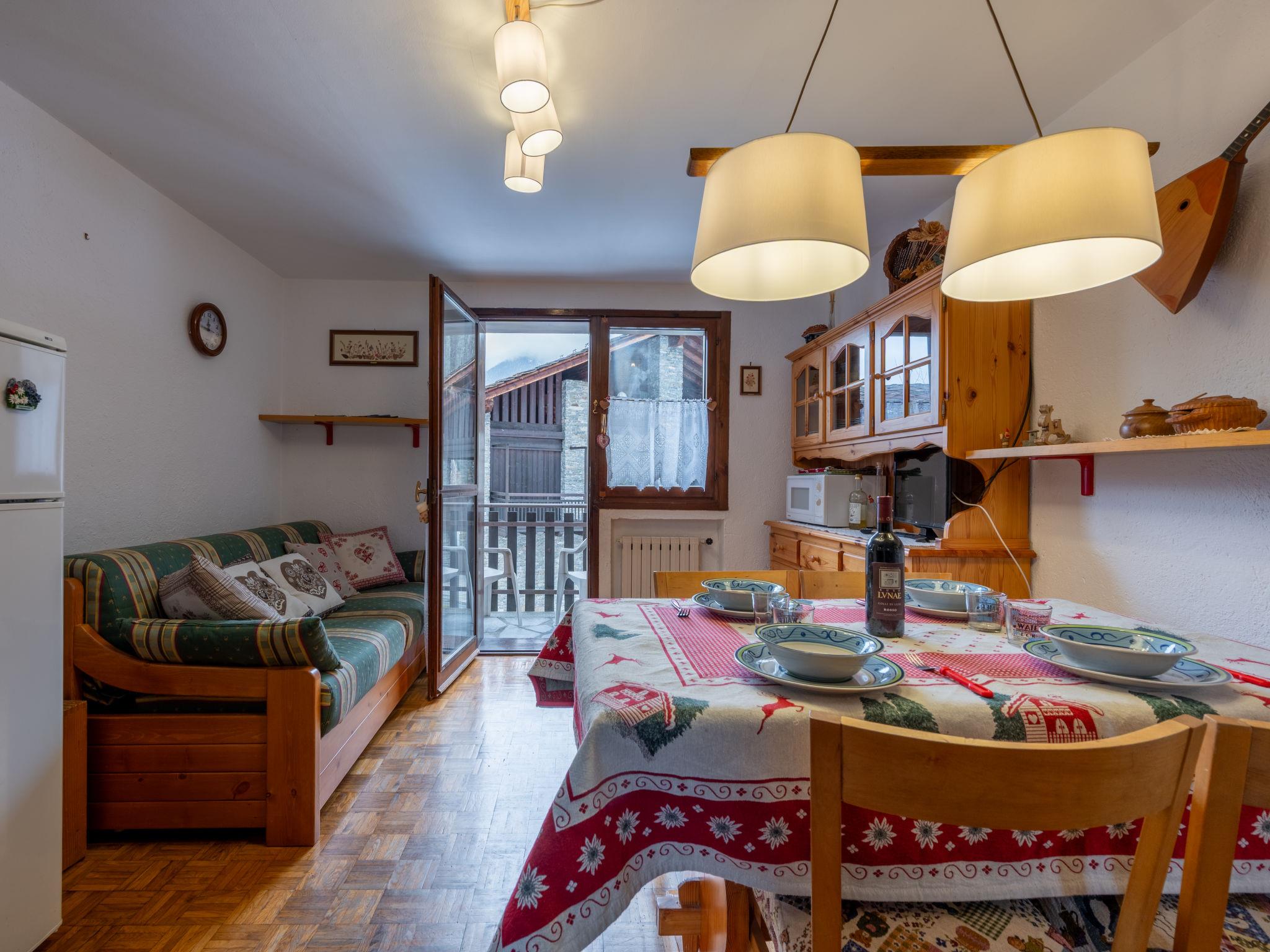 Simple, comfortable apartment block 1'000 m a.s.l.. 1 km from the centre of La Salle. In Winter: please take snow chains. Parking at the house. Grocery 400 m, restaurant 50 m, bar, bus stop 400 m, thermal baths "QC Terme Pré Saint Didier" 8 km. Skisport facilities 14 km. Nearby attractions: SkyWay Monte Bianco 16 km, Aosta 27 km. Well-known ski regions can easily be reached: Courmayeur 14 km, La Thuile 18 km. Please note: car recommended.
