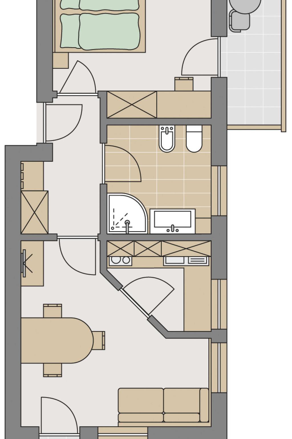 The flat has a cosy living room of approx. 18 m² with an east-facing balcony, a dining table and a couch. The modern kitchen is fully equipped with a dishwasher, induction hob, fridge with freezer compartment, microwave, hand blender and all the necessary cooking utensils. A spacious bathroom with a large window, shower, bidet, WC, washbasin with shelf and a hairdryer as well as a bedroom made of solid Swiss stone pine with a double bed and a west-facing balcony round off the interior. It is also possible to add a baby cot here.