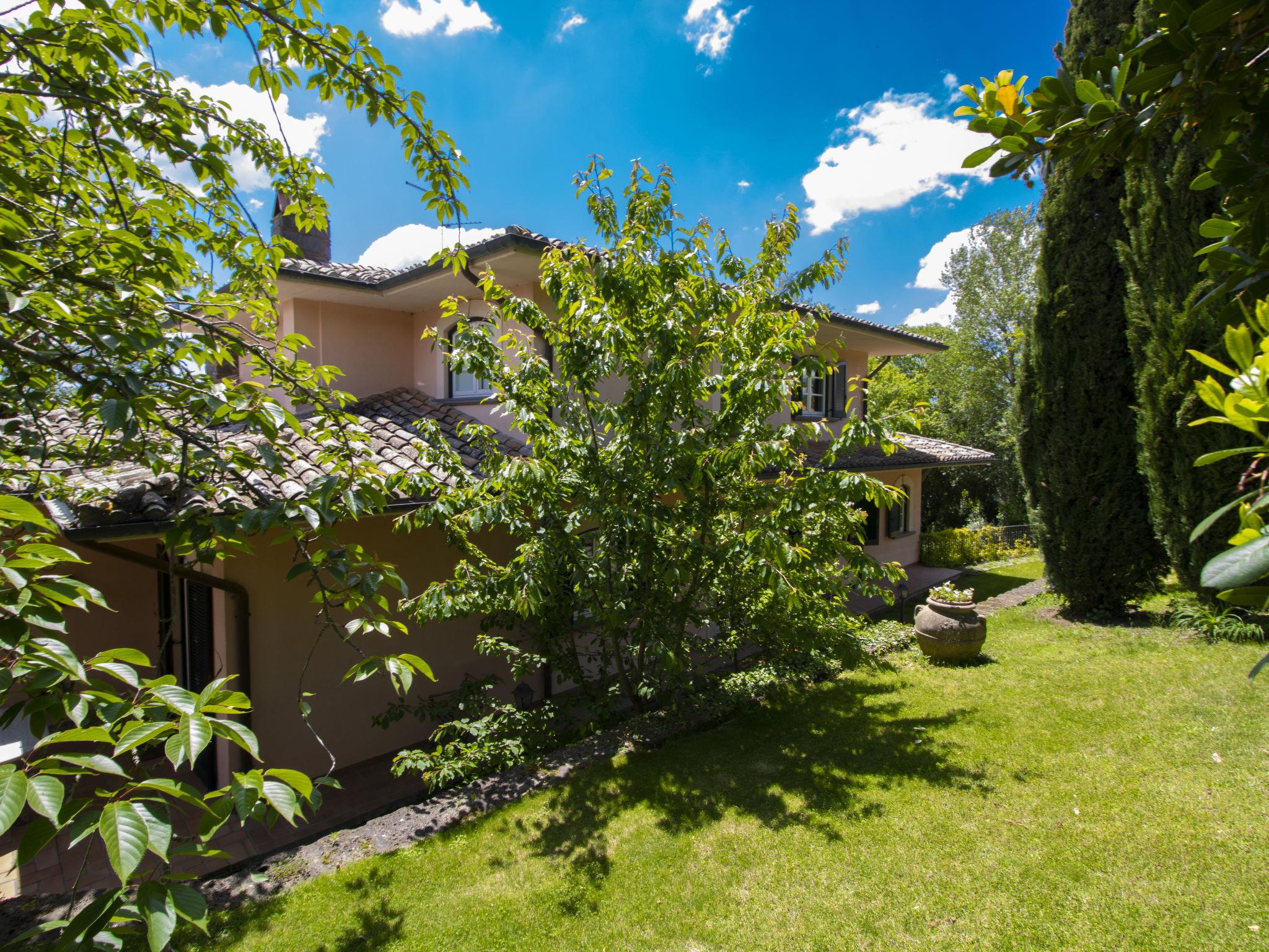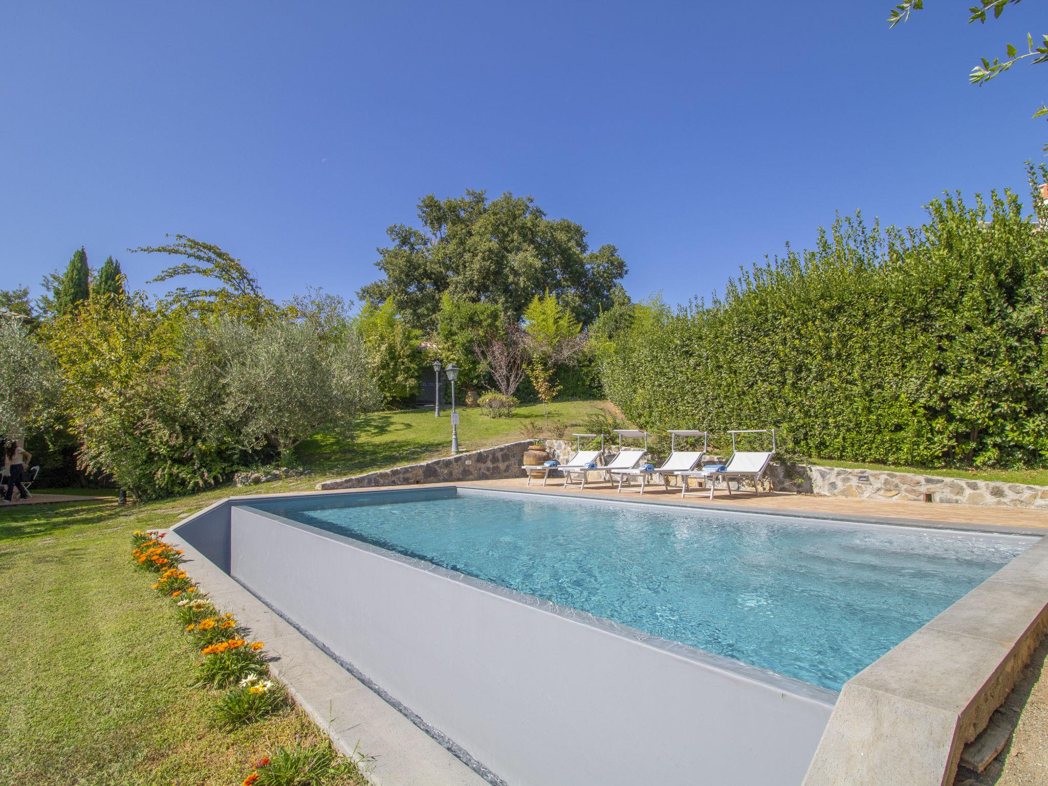 Situated at the edge with Tuscany and Umbria, this exclusive property is ideal for exploring the historical and natural beauty of central Italy. Very beautiful, luxurious villa "Nicoletta", 500 m a.s.l., detached, surrounded by trees. In the centre of San Lorenzo Nuovo 11 km from the centre of Bolsena, on top of a hill, residential area (villas), 6 km from the lake. Private: garden 2'000 m2 (fenced) flowers and trees, swimming pool (12 x 6 m, depth 140 cm, seasonal availability: 15.May. - 30.Sep.) with salt water. Outdoor shower, table tennis, garden furniture, barbecue. Room cleaning on request (extra). Cook on request. Roofed, parking (for 2 cars) at the house. E-charging station. Grocery 260 m, restaurant, bar 100 m, bus stop 500 m, sandy beach "Marina di Montalto" 50 km, grass beach 6 km, park " naturale della Val D'orcia" 50 km, thermal baths "Sorano" 25 km, bathing lake "Bolsena" 6 km. Golf course (9 hole) 6 km. Nearby attractions: Grotte di Castro 4 km, Civita di Bagnoregio 23 km, Orvieto 25 km, Pitigliano 25 km, San Casciano Dei Bagni 31 km. Please note: car recommended. Groups of teenagers on request only. Residence with electric gates. The infinity pool, with salt water, is located in the beautiful and lush garden just a few meters from the house. This is the ideal place to spend relaxing moments enjoying the breathtaking view of Lake Bolsena.