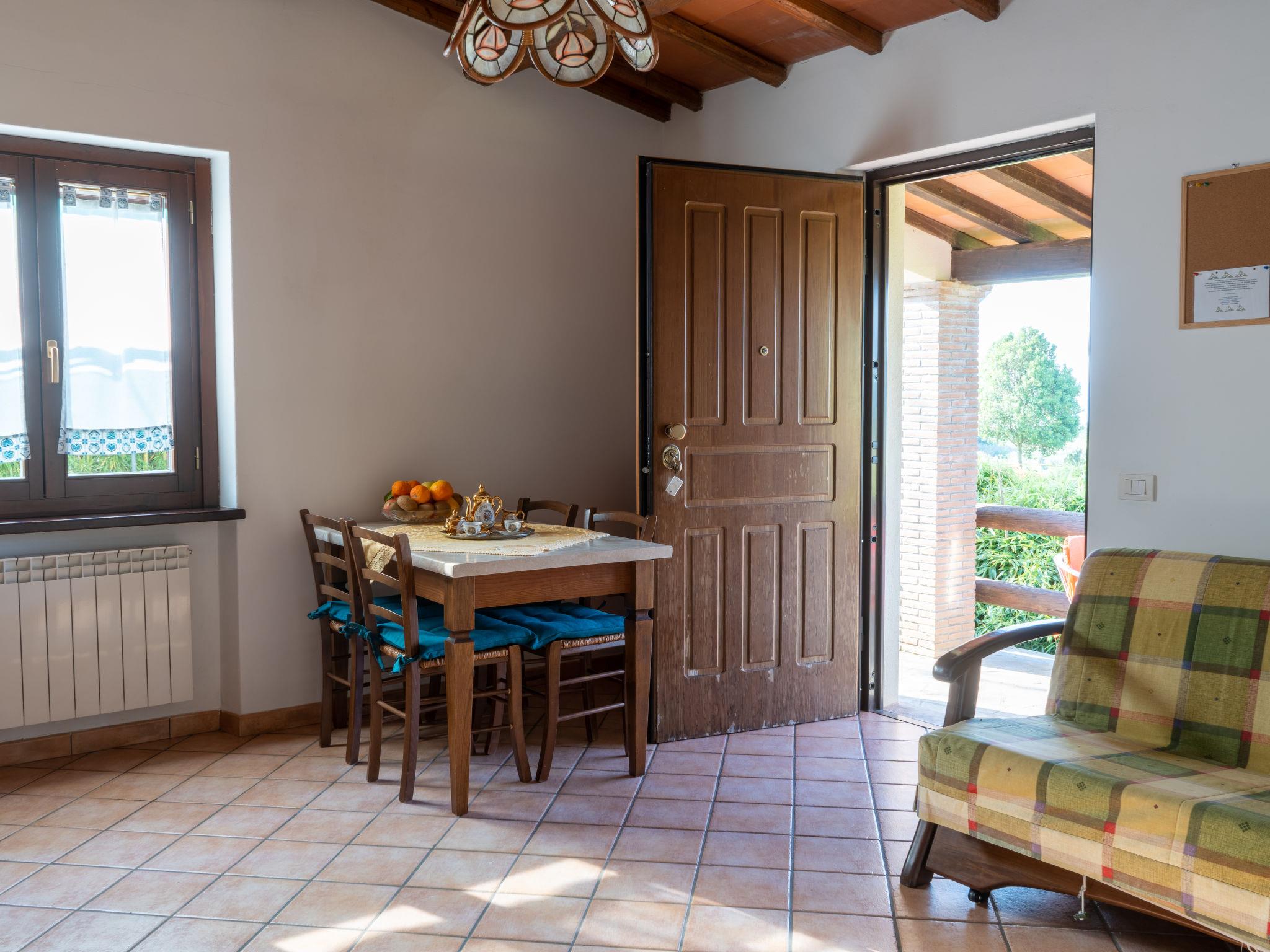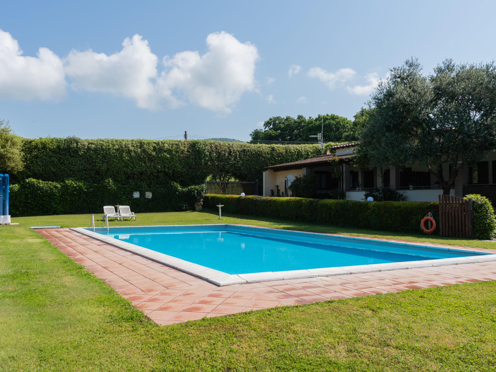 Country house "Dolce Vita". 4 houses in the residence. 9 apartments in the residence. 3 km from the centre of Bolsena, 25 km from the centre of Orvieto, 100 km from the centre of Roma, 900 m from the lake, in the countryside. For shared use: property 5'000 m2 with lawn and trees, orchard, lawn for sunbathing, swimming pool (12 x 6 m, depth 120 - 150 cm, seasonal availability: 16.May. - 10.Oct.). Outdoor shower, barbecue, children's playground. In the house: washing machine (for shared use). Roofed, parking on the premises. Shop 3 km, supermarket 4 km, bus stop 800 m, sandy beach "Lago di Bolsena" 900 m. Golf course (9 hole) 15 km. Nearby attractions: Orvieto 35 km, Viterbo 35 km. Well-known lakes can easily be reached: Bolsena 900 m. Local sale of farm products. Please note: Loading and unloading of baggage is possible at the holiday house. The owner lives on the same property. Motorway 24 km from the property. Airfield 35 km from the property. Additional accommodations can be booked.