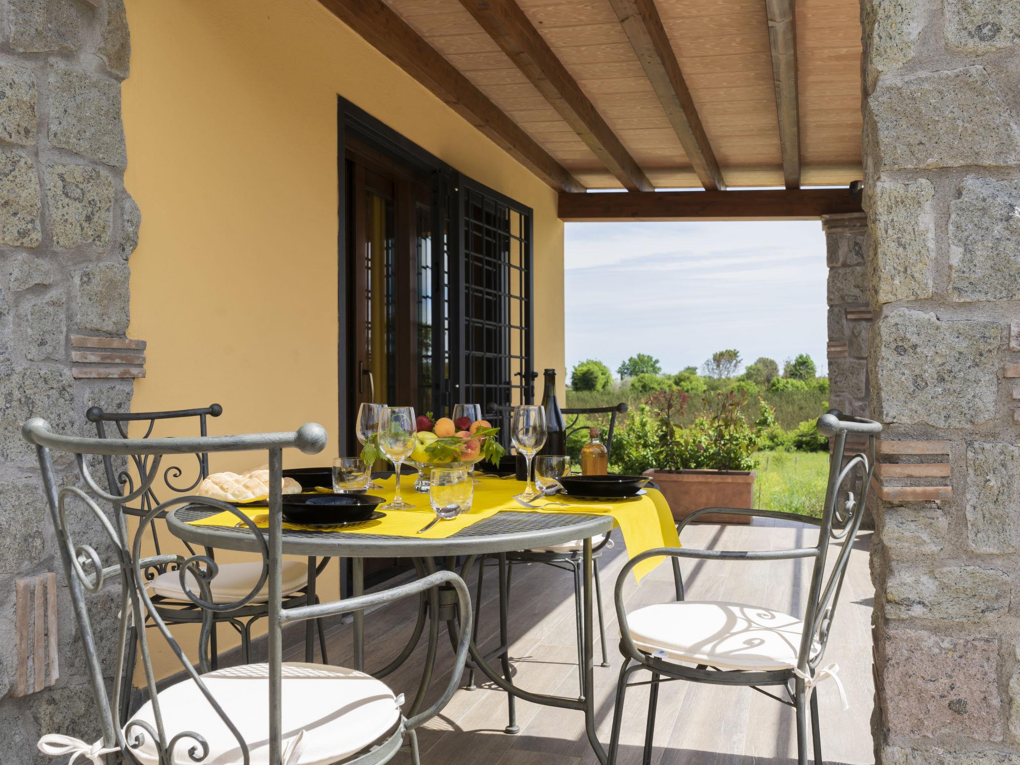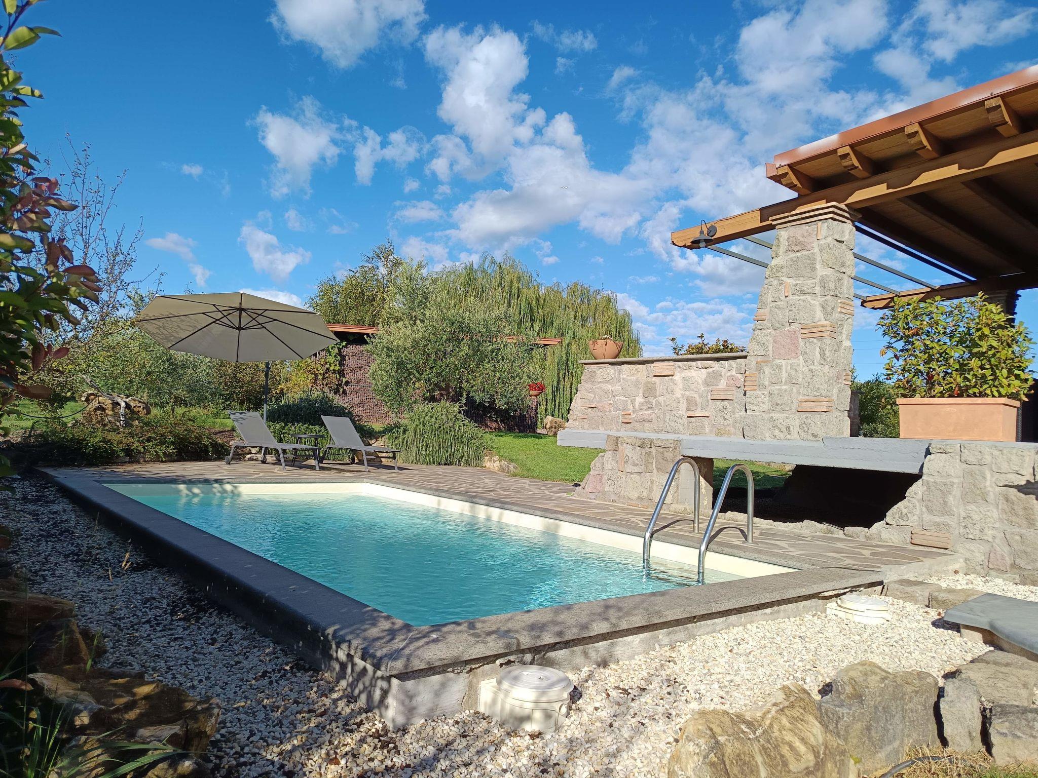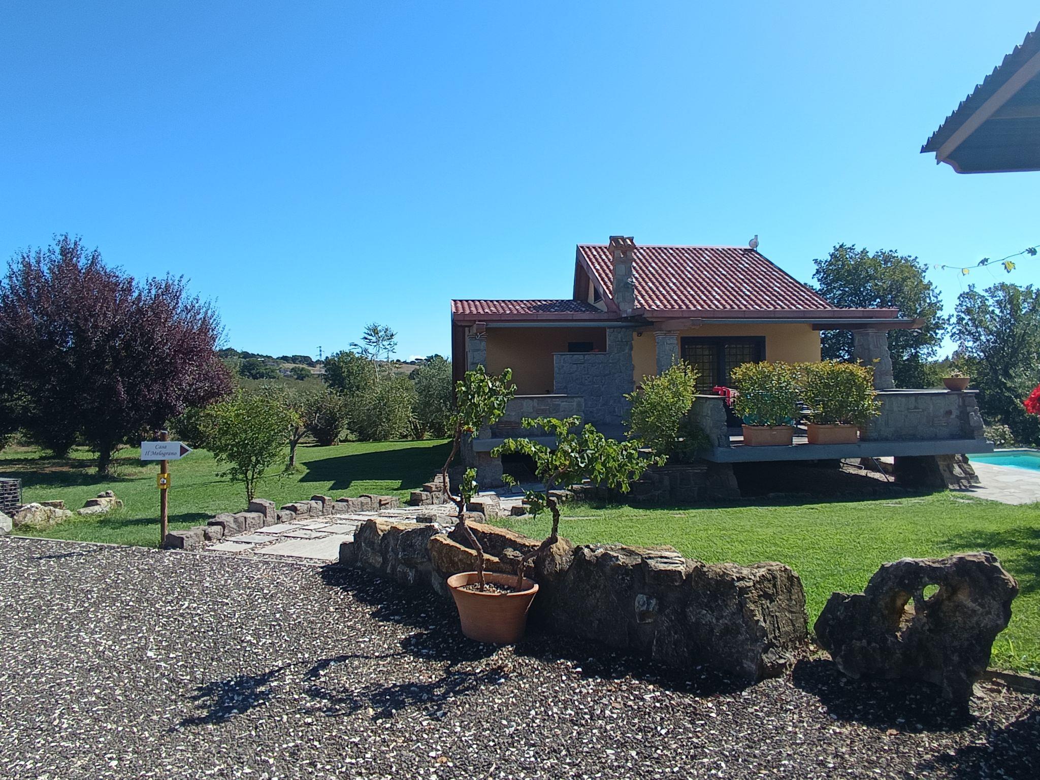 Modern, comfortable chalet "Melograno", detached. 2 houses in the resort. 3 km from the centre of Sutri, 50 km from the centre of Roma, 45 km from the sea, 12 km from the lake. For shared use: park 3 ha (fenced). Private: garden 500 m2, swimming pool (6 x 3 m, depth 130 cm, seasonal availability: 16.May. - 03.Oct.). Outdoor shower, garden furniture, barbecue, pool maintenance by the owner/gardener. In the house: reception, relaxation room. Roofed, parking on the premises. E-charging station. Supermarket 2 km, bus stop 1.2 km, sandy beach "Santa Severa" 45 km, bathing lake "Lago Di Vico" 12 km. Golf course (18 hole) 7 km. Nearby attractions: Viterbo 30 km, Civita di Bagno Regio 45 km, Trevignano Romano 13 km, Tuscania 30 km, Parco Città di Sutri 1 km, Acquapark Fontevivola 1 km. Well-known lakes can easily be reached: Lago di Bracciano 13 km, Lago di Bolsena 45 km. Hiking paths: Via Francigena 1 km, Parco Martignano 13 km, Riserva Naturale lago di Vico 5 km. Local sale of farm products. Residence with electric gates.