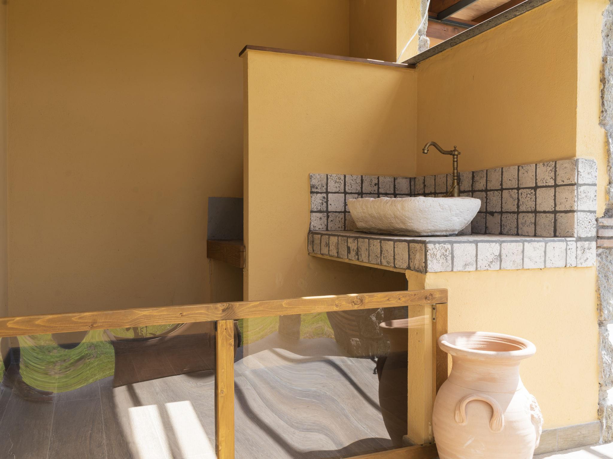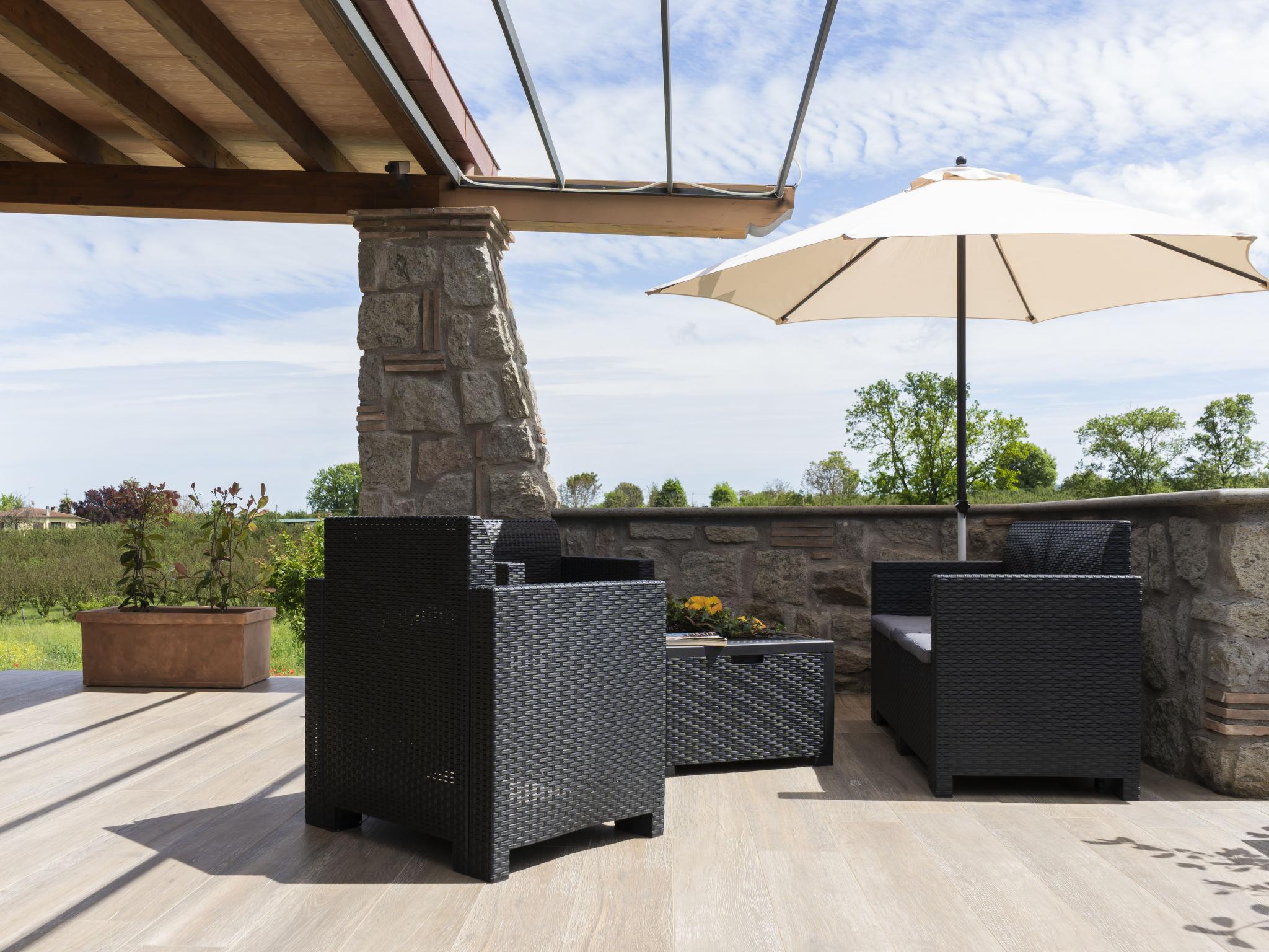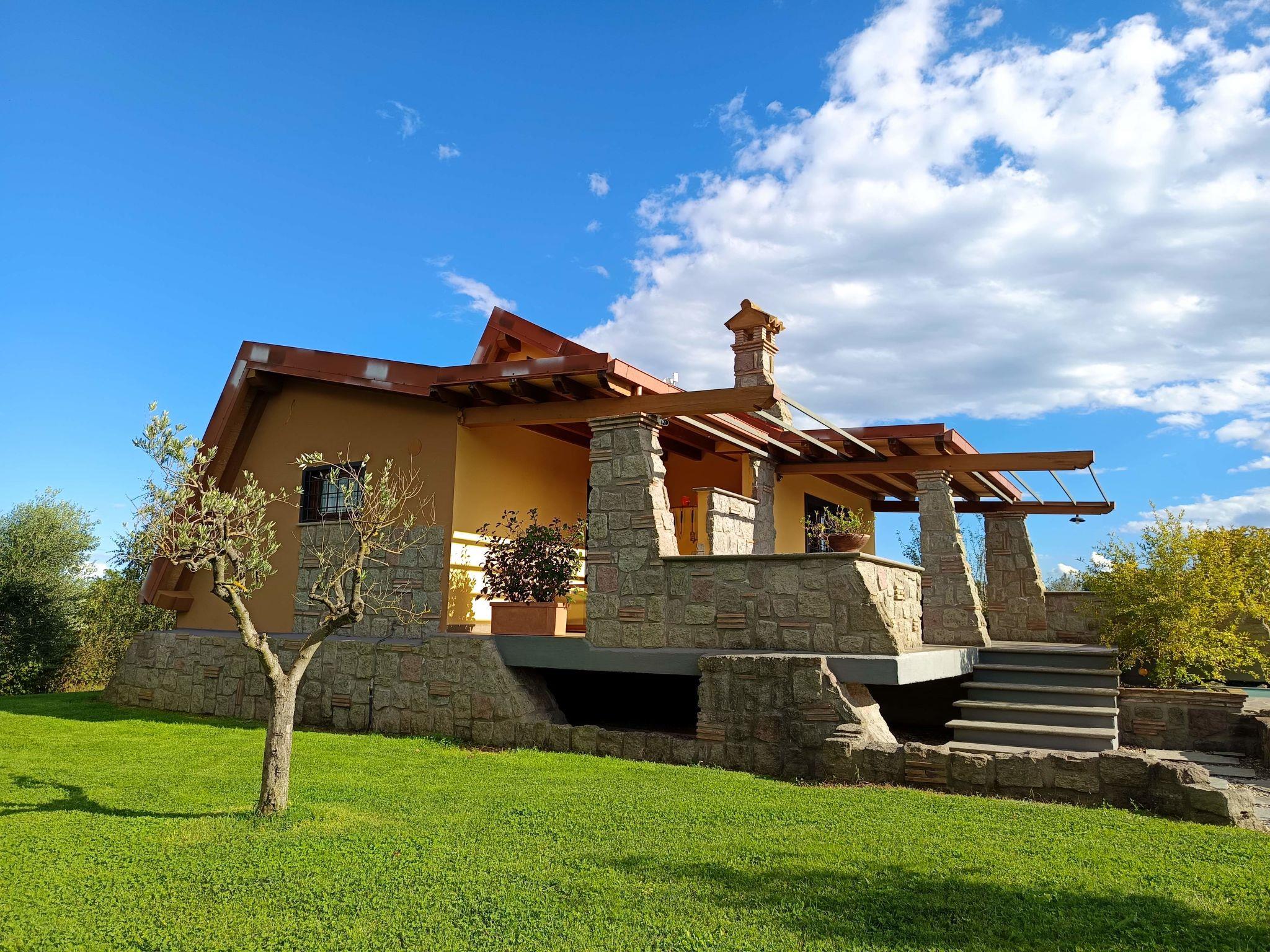 Modern, comfortable chalet "Melograno", detached. 2 houses in the resort. 3 km from the centre of Sutri, 50 km from the centre of Roma, 45 km from the sea, 12 km from the lake. For shared use: park 3 ha (fenced). Private: garden 500 m2, swimming pool (6 x 3 m, depth 130 cm, seasonal availability: 16.May. - 03.Oct.). Outdoor shower, garden furniture, barbecue, pool maintenance by the owner/gardener. In the house: reception, relaxation room. Roofed, parking on the premises. E-charging station. Supermarket 2 km, bus stop 1.2 km, sandy beach "Santa Severa" 45 km, bathing lake "Lago Di Vico" 12 km. Golf course (18 hole) 7 km. Nearby attractions: Viterbo 30 km, Civita di Bagno Regio 45 km, Trevignano Romano 13 km, Tuscania 30 km, Parco Città di Sutri 1 km, Acquapark Fontevivola 1 km. Well-known lakes can easily be reached: Lago di Bracciano 13 km, Lago di Bolsena 45 km. Hiking paths: Via Francigena 1 km, Parco Martignano 13 km, Riserva Naturale lago di Vico 5 km. Local sale of farm products. Residence with electric gates.