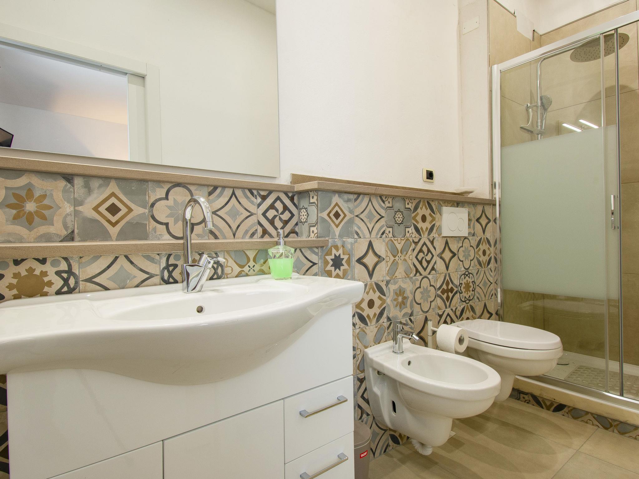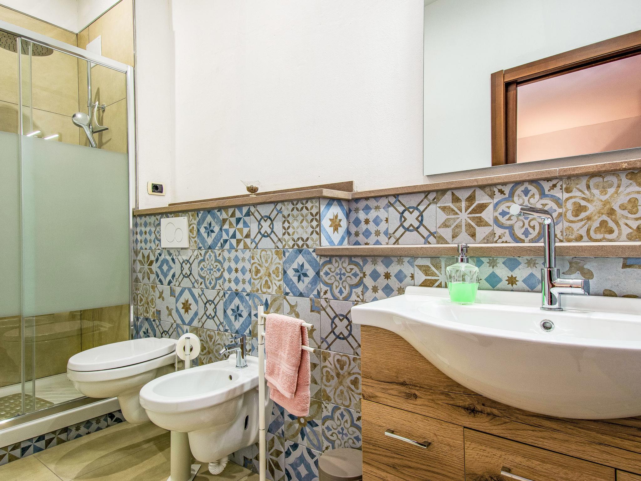 "Bianco", 4-room house 100 m2 on 1st floor. Bright, tasteful and cosy furnishings: living room with 1 sofabed, 1 double sofabed, open-hearth fireplace and shower/bidet/WC. 2 double bedrooms, each room with shower/bidet/WC. Kitchen (dishwasher, 4 induction hot plates, toaster, kettle, microwave, electric coffee machine). Exit to the terrace. Terrace furniture, deck chairs. Facilities: hair dryer. Internet (WiFi, free). Please note: maximum 1 pet/ dog allowed. Smoke alarm, fire extinguisher. IT050016B5RB47C3OT