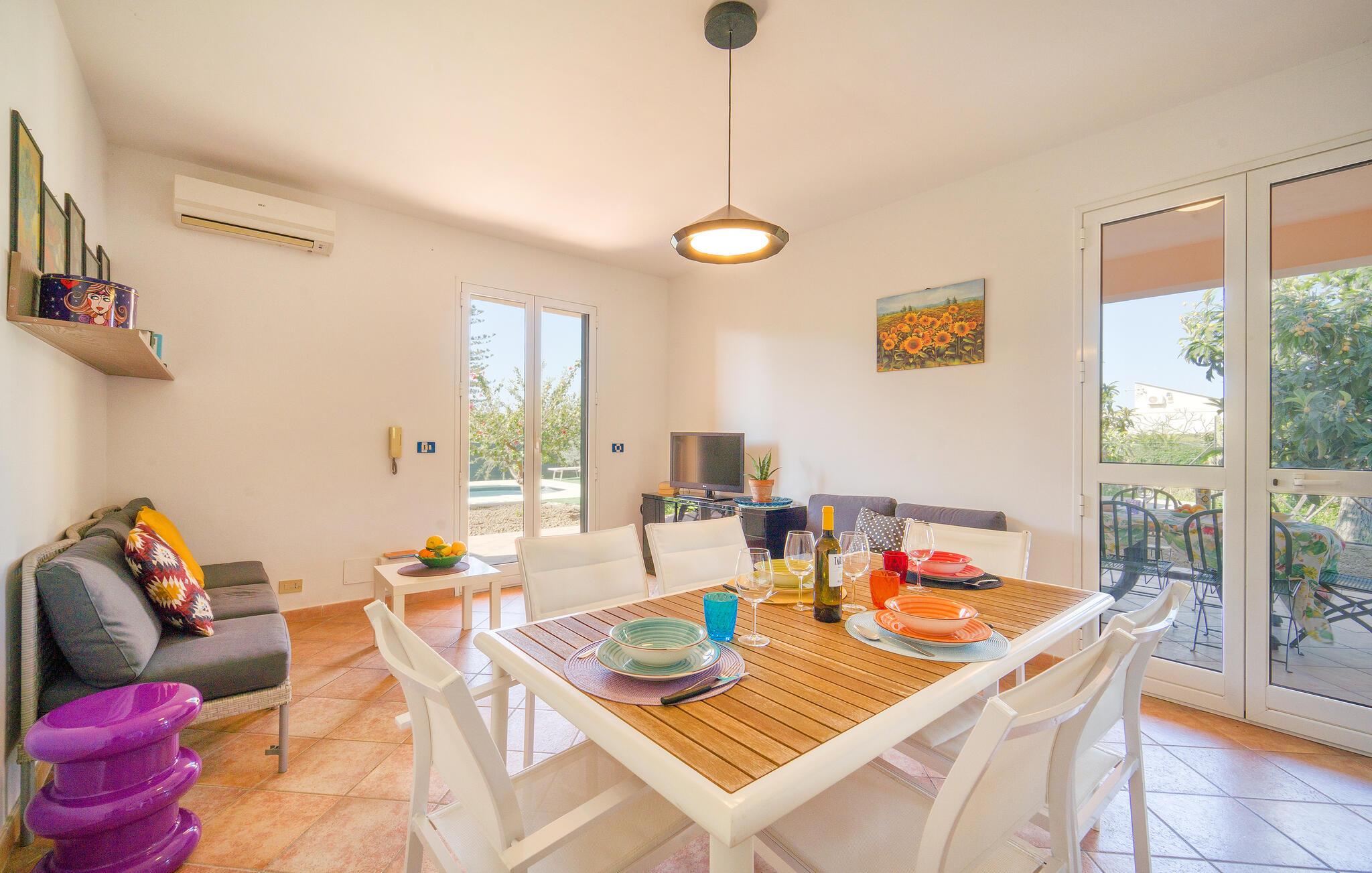 Fra opholdsrummet kan I gå direkte ud på feriehusets terrasse, snuppe et friskt dyp i poolen og slutte en skøn dag af med et måltid under åben himmel.