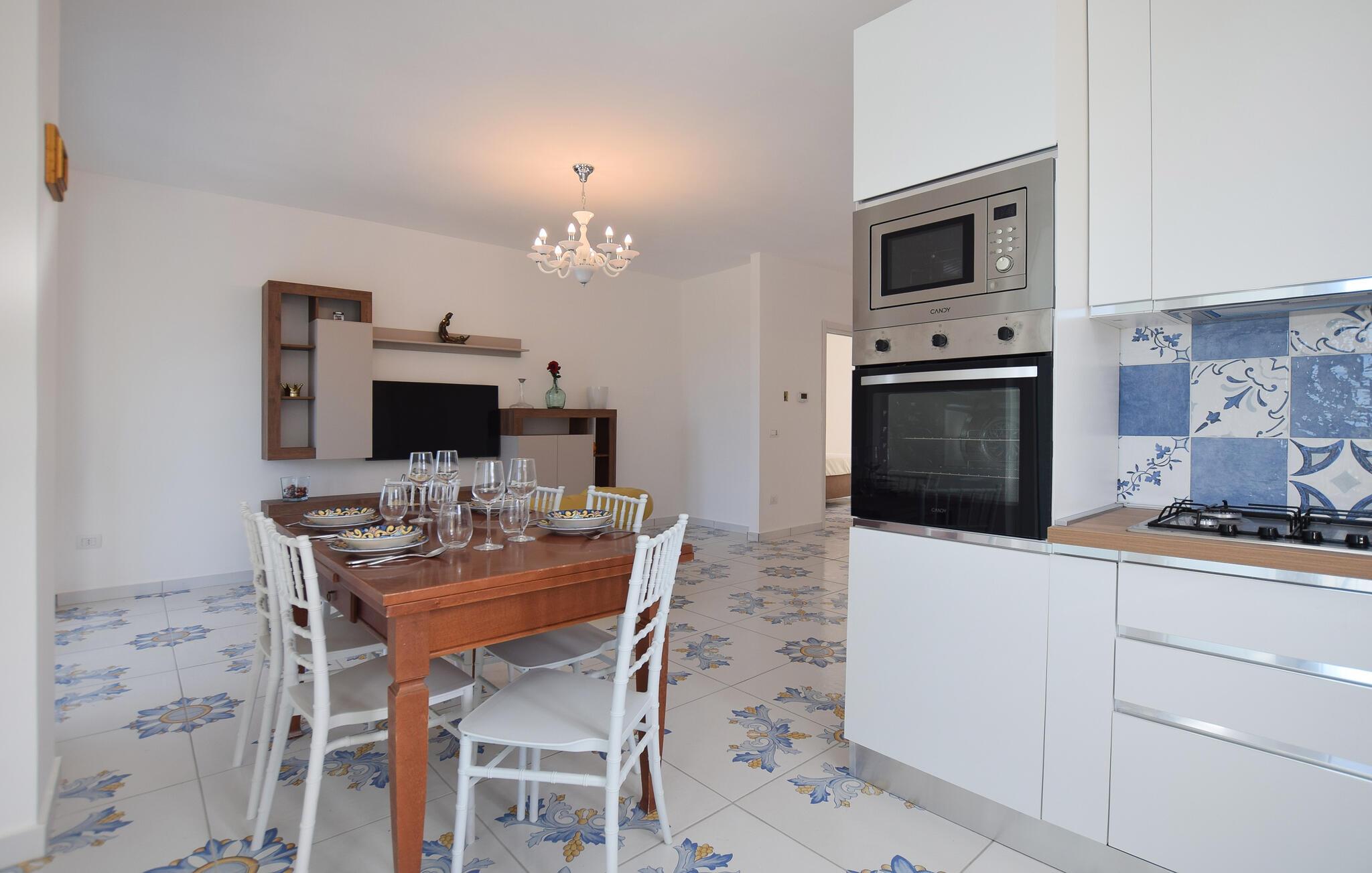 Velkommen til denne lyse og moderne lejlighed, der lægger op til at tilbringe afslappende dage med venner eller familie i en frisk og elegant atmosfære. Tilbered lækre pastaretter, planlæg jeres udflugter med stilfulde måltider, og find en spændende serie, som alle vil nyde efter en lang dag.