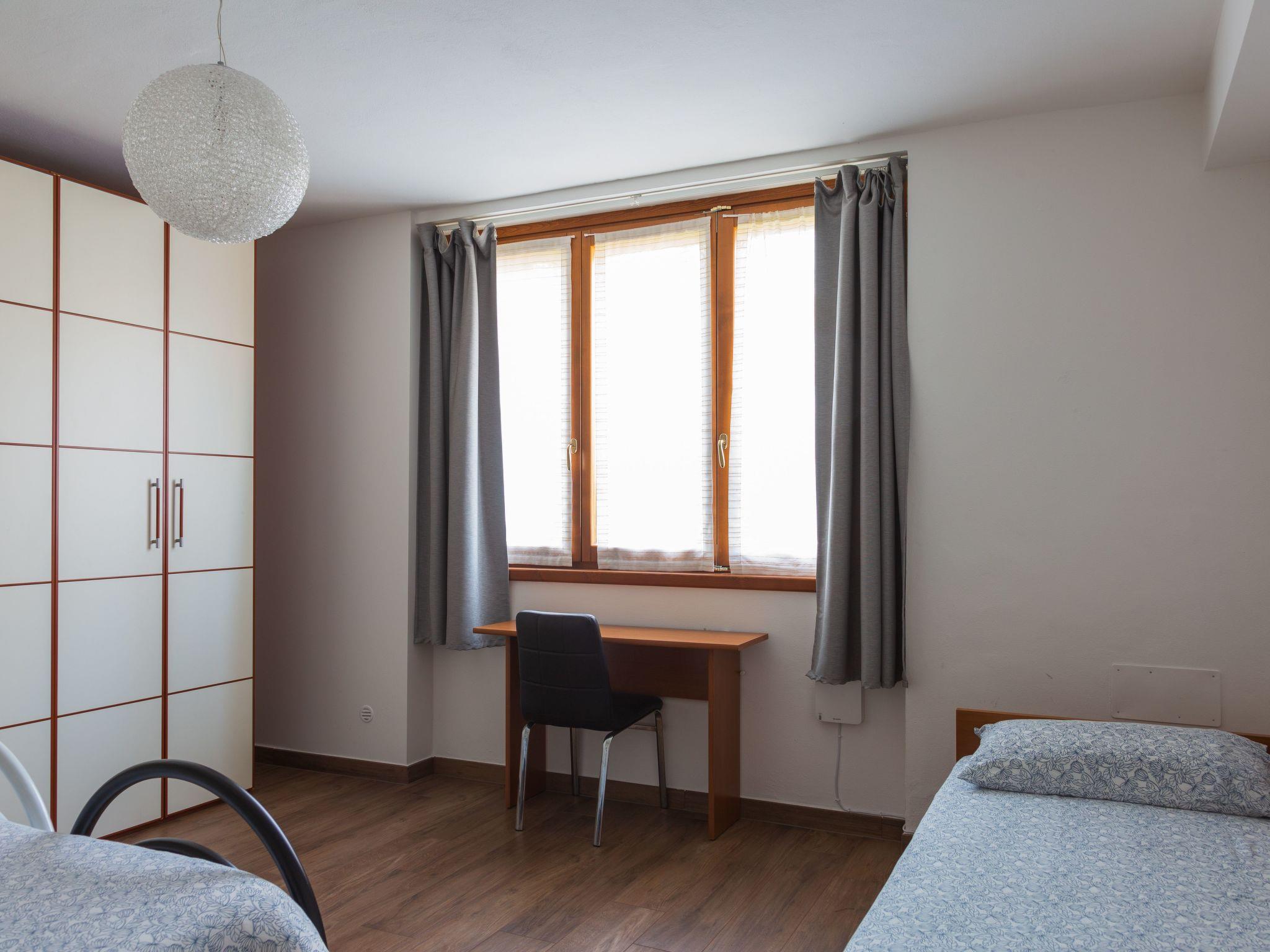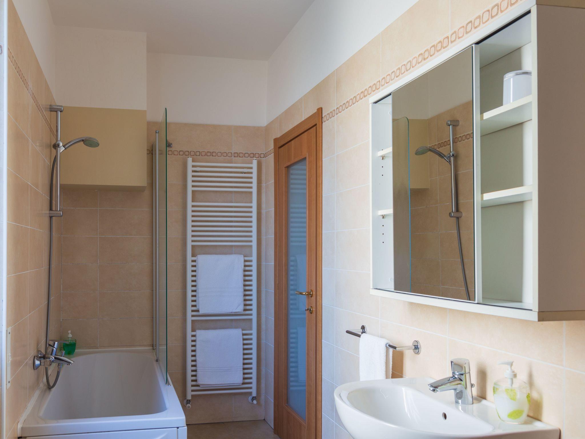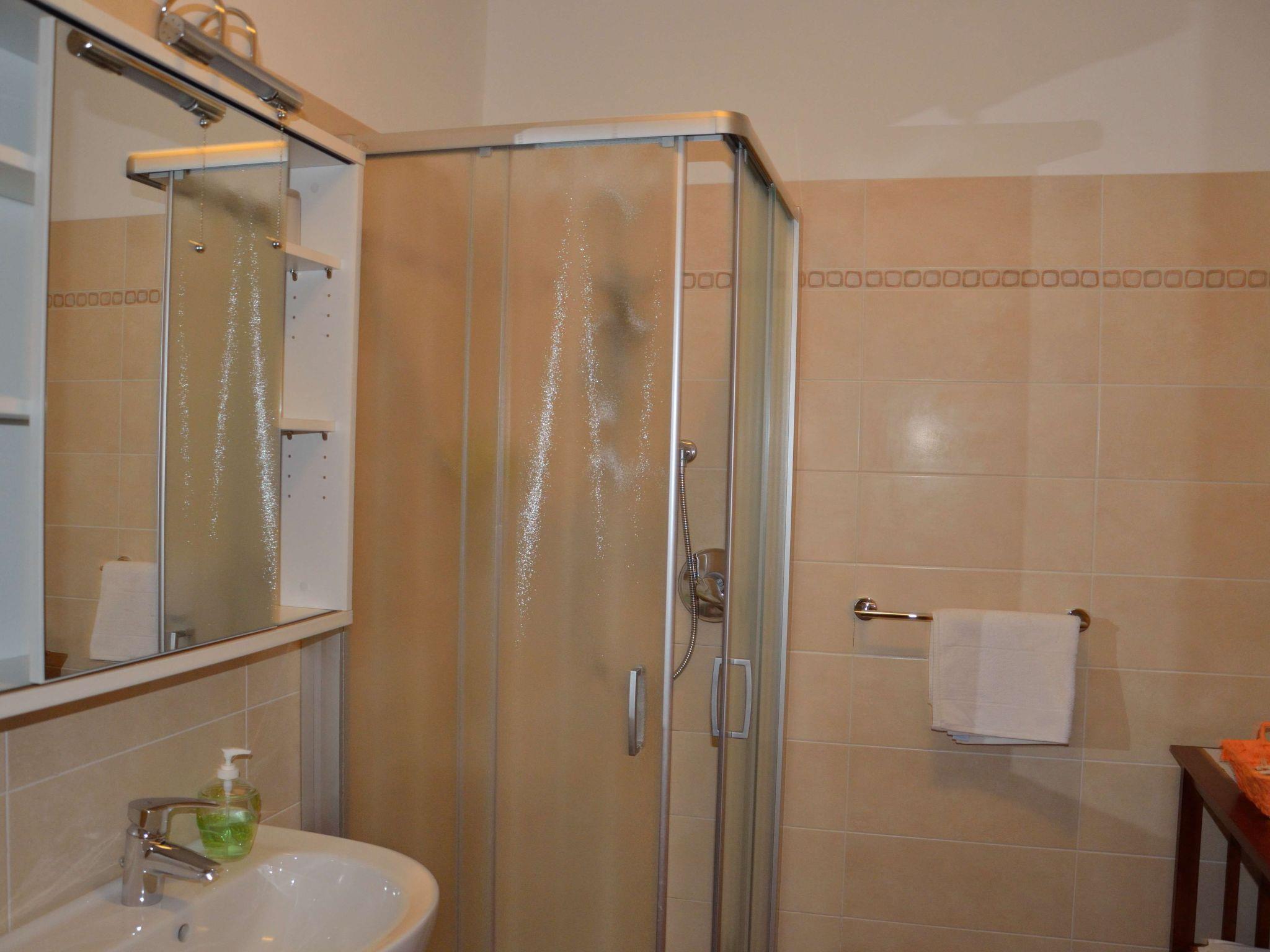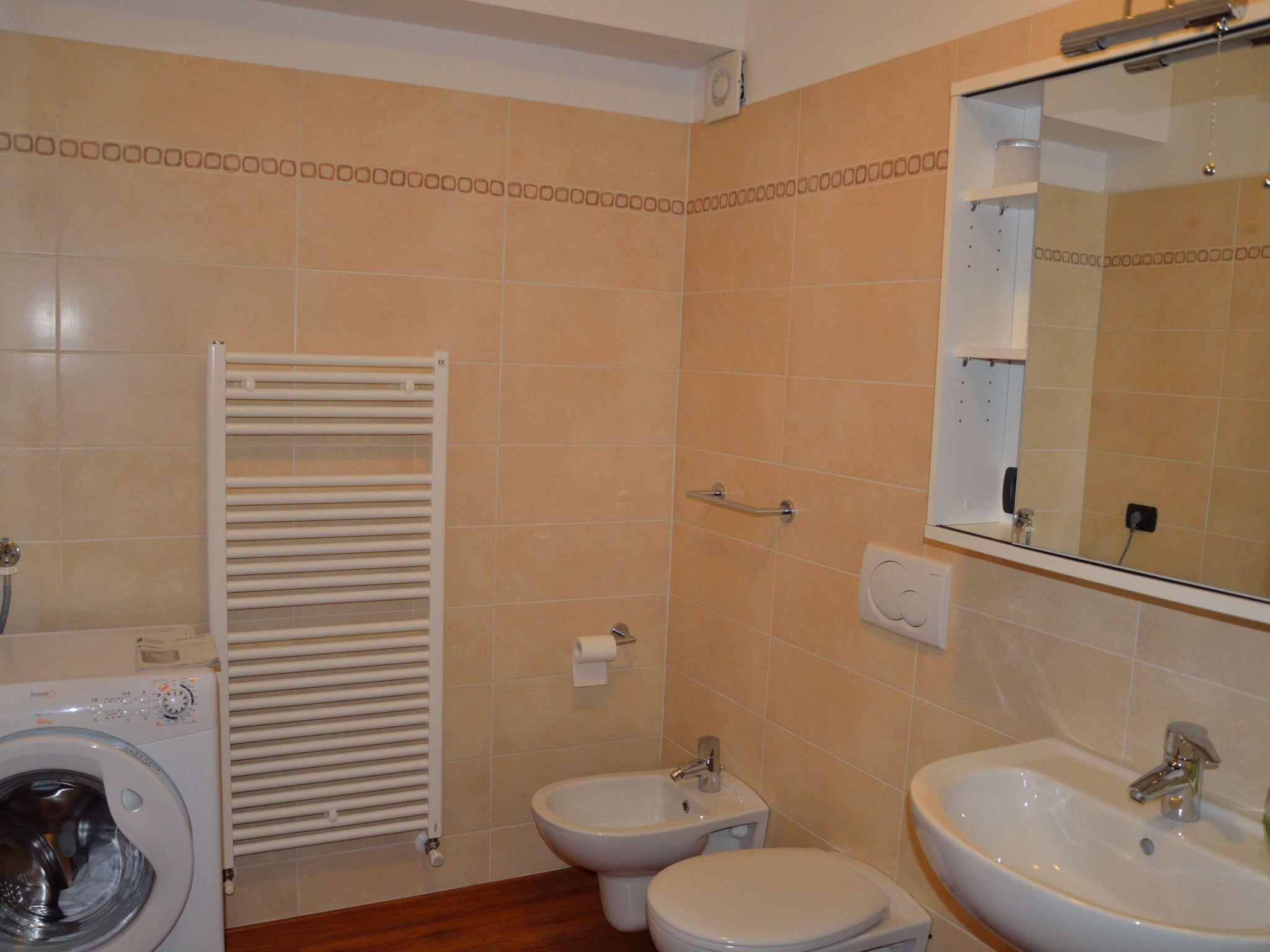 Internally, the flat covers approximately 110 square metres of well-organised and cosy space, capable of accommodating up to 9 adults in total comfort. The layout includes two large bedrooms and a smaller one with two single beds, along with two modernly equipped bathrooms with showers. The large living room with a fully equipped kitchen invites for convivial moments, while air conditioning (available at an extra charge if used), a washing machine, TV and Wi-Fi internet access guarantee a stay filled with every modern comfort.
