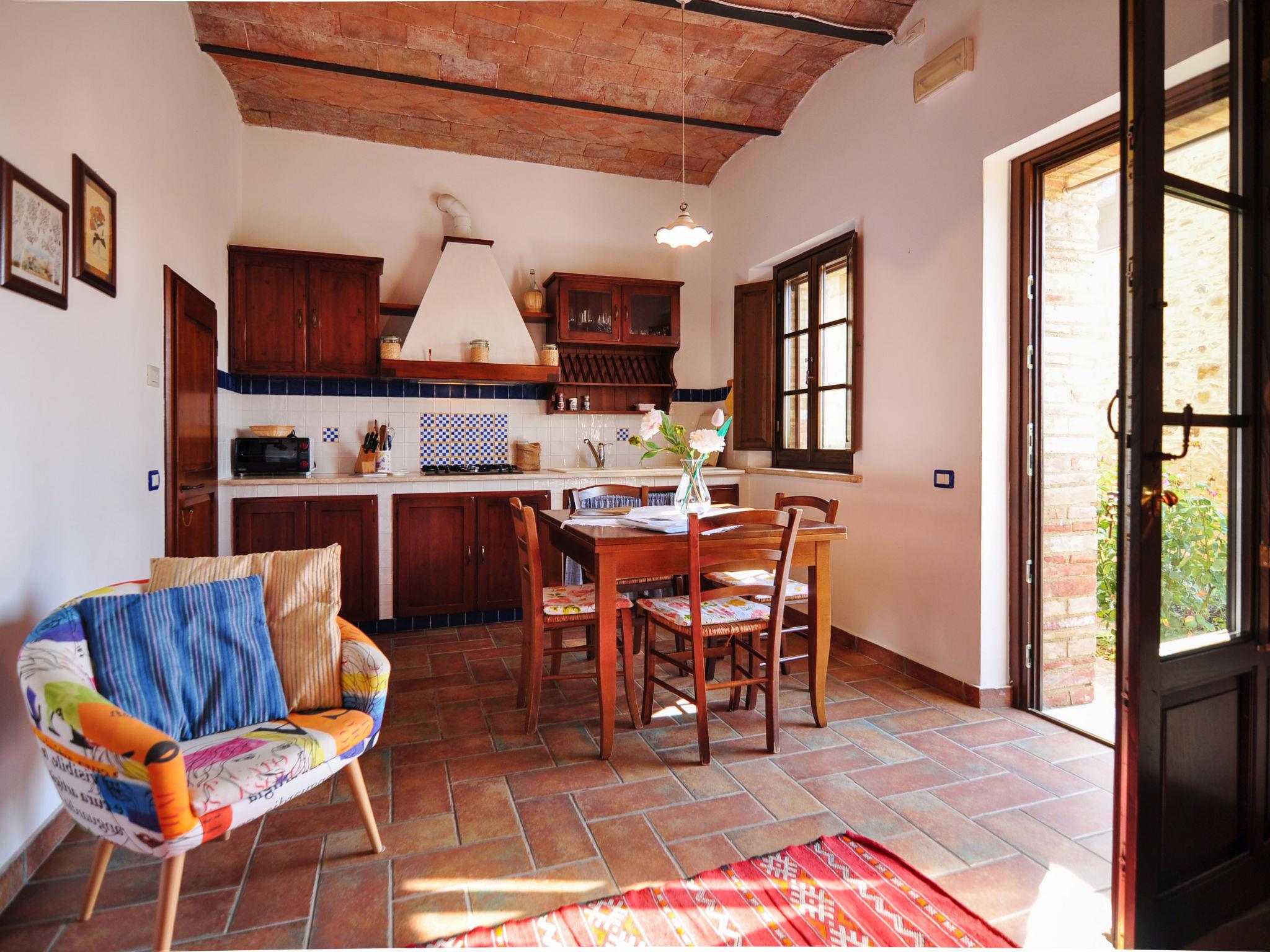 Very beautiful country house "Linearis", detached, surrounded by trees, fields and vineyards. 9 apartments in the residence. In the district of Linari 3 km from the centre of Poggibonsi, 6 km from the centre of Barberino Val d'Elsa, 15 km from the centre of San Gimignano, in a secluded, sunny, elevated position, 82 km from the sea, in the countryside. For shared use: beautiful, well-kept garden 10'000 m2 (fenced) with plants and trees, meadow, swimming pool fenced (14 x 7 m, depth 165 cm, seasonal availability: 01.Apr. - 05.Nov.). Outdoor shower, poolhouse with shower and WC, terrace, garden furniture, barbecue, children's playground, pool maintenance by the owner/gardener. In the complex: reception, lounge, washing machine (extra), tumble dryer (for shared use, extra). House maid on request (extra). 100 m footpath to the house. Parking on the premises, communal covered parking (extra). Grocery 2 km, supermarket 3 km, restaurant 2 km, bakery 2 km, bus stop 3 km, railway station "Poggibonsi" 3 km, sandy beach "Cecina Mare" 72 km, indoor swimming pool 3 km. Nearby attractions: Siena 36 km, Firenze 46 km, Volterra 38 km, Pisa 90 km. Please note: reception open 09:00-13:00 hrs. Suitable for families, baby equipment (included). Local sale of farm products. Please note: Loading and unloading of baggage is possible at the holiday house. Residence with electric gates. The owner lives in the same residence. All houses/apartments are individually designed/furnished. Obligation to wear bathing caps.