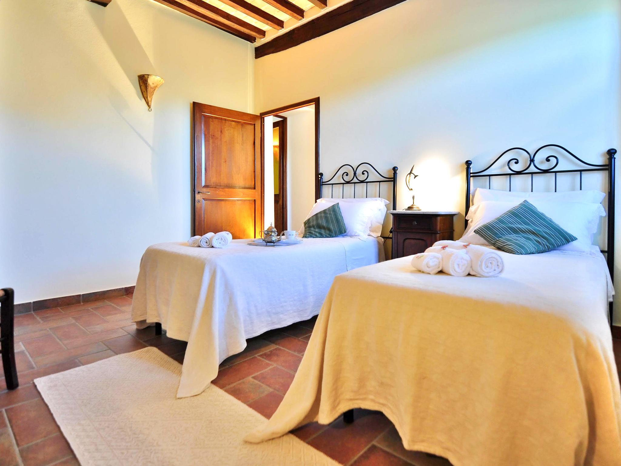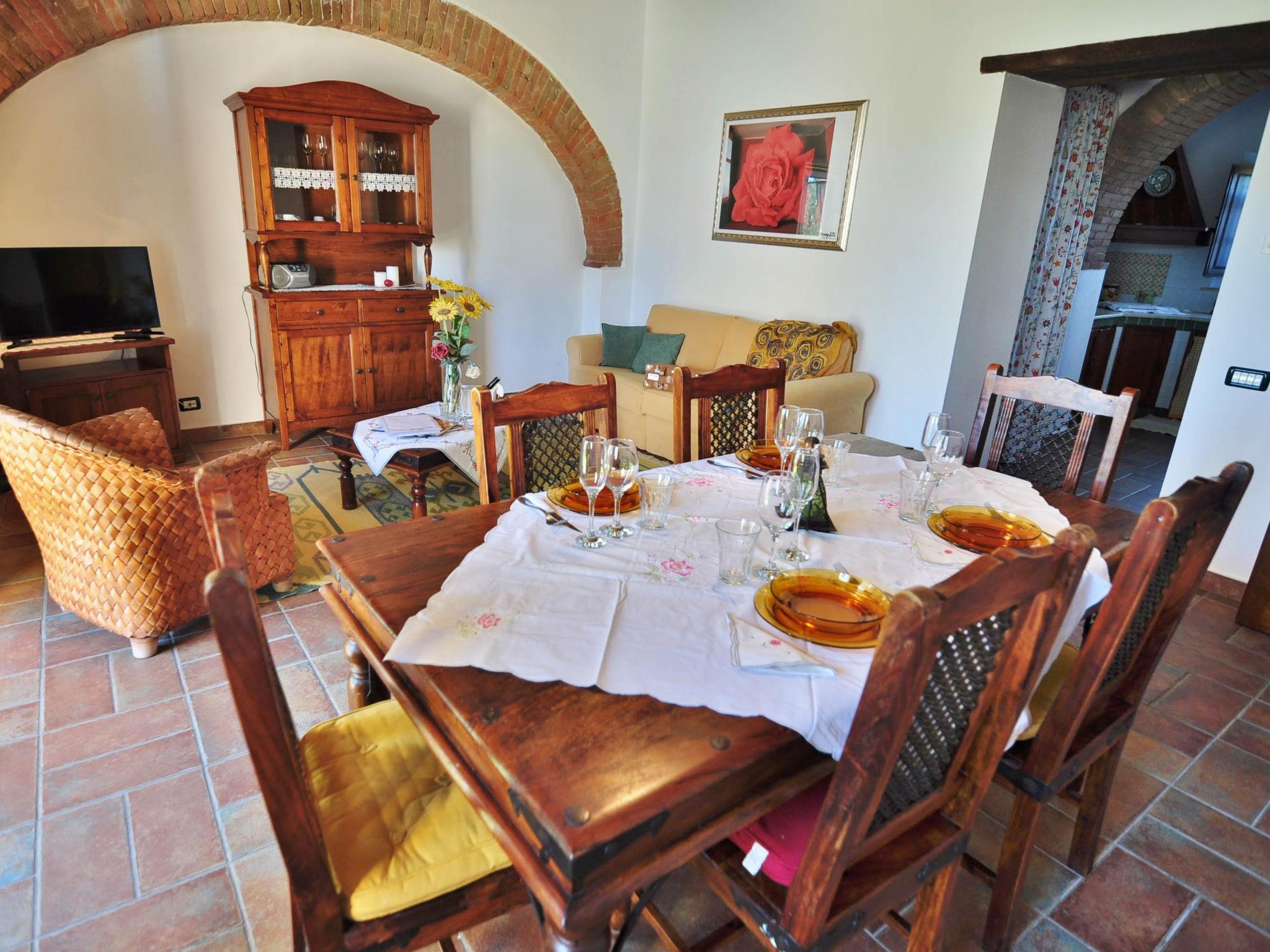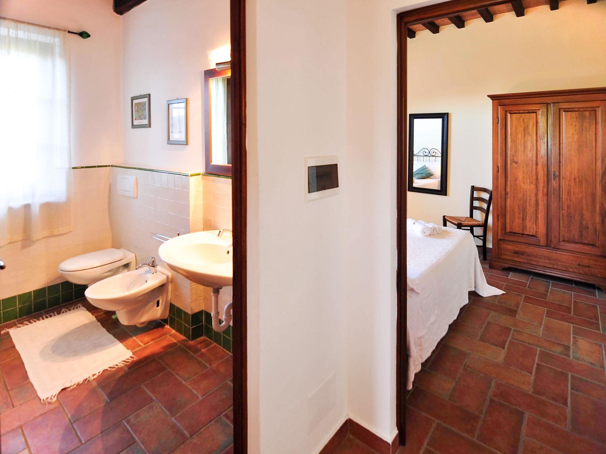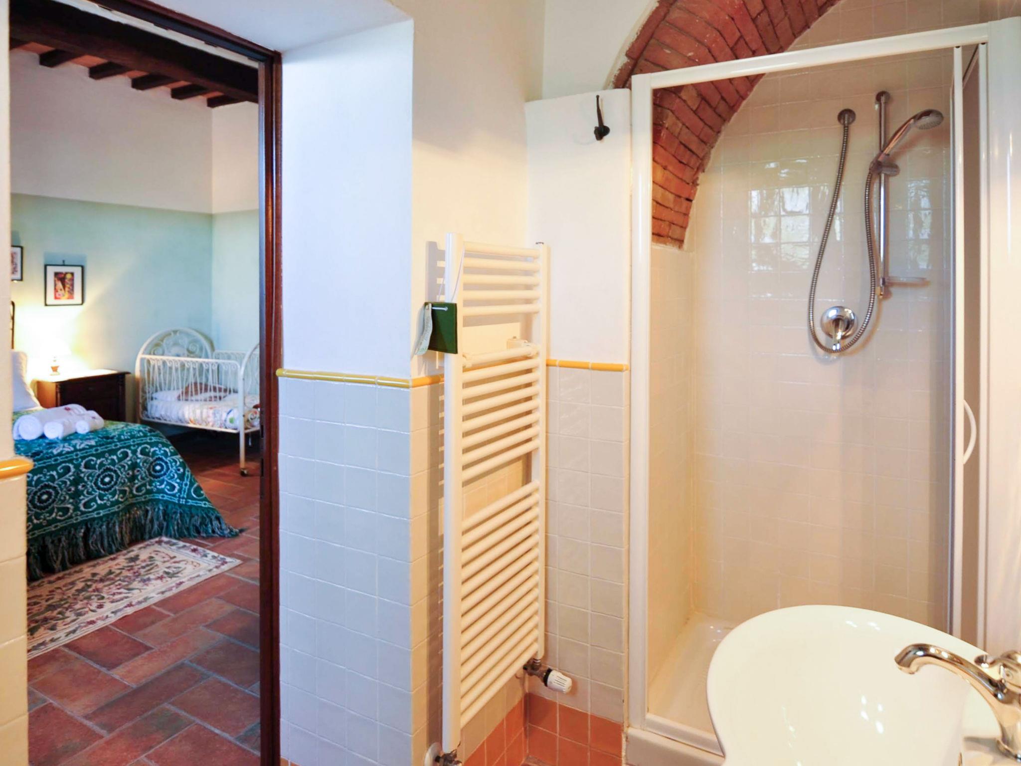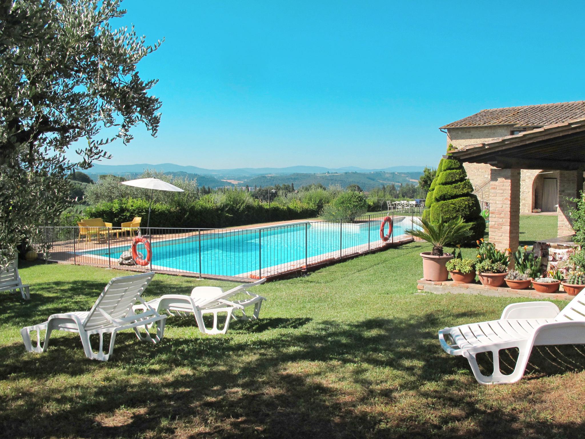 Very beautiful country house "Linearis", detached, surrounded by trees, fields and vineyards. 9 apartments in the residence. In the district of Linari 3 km from the centre of Poggibonsi, 6 km from the centre of Barberino Val d'Elsa, 15 km from the centre of San Gimignano, in a secluded, sunny, elevated position, 82 km from the sea, in the countryside. For shared use: beautiful, well-kept garden 10'000 m2 (fenced) with plants and trees, meadow, swimming pool fenced (14 x 7 m, depth 165 cm, seasonal availability: 01.Apr. - 05.Nov.). Outdoor shower, poolhouse with shower and WC, terrace, garden furniture, barbecue, children's playground, pool maintenance by the owner/gardener. In the complex: reception, lounge, washing machine (extra), tumble dryer (for shared use, extra). House maid on request (extra). 100 m footpath to the house. Parking on the premises, communal covered parking (extra). Grocery 2 km, supermarket 3 km, restaurant 2 km, bakery 2 km, bus stop 3 km, railway station "Poggibonsi" 3 km, sandy beach "Cecina Mare" 72 km, indoor swimming pool 3 km. Nearby attractions: Siena 36 km, Firenze 46 km, Volterra 38 km, Pisa 90 km. Please note: reception open 09:00-13:00 hrs. Suitable for families, baby equipment (included). Local sale of farm products. Please note: Loading and unloading of baggage is possible at the holiday house. Residence with electric gates. The owner lives in the same residence. All houses/apartments are individually designed/furnished. Obligation to wear bathing caps.