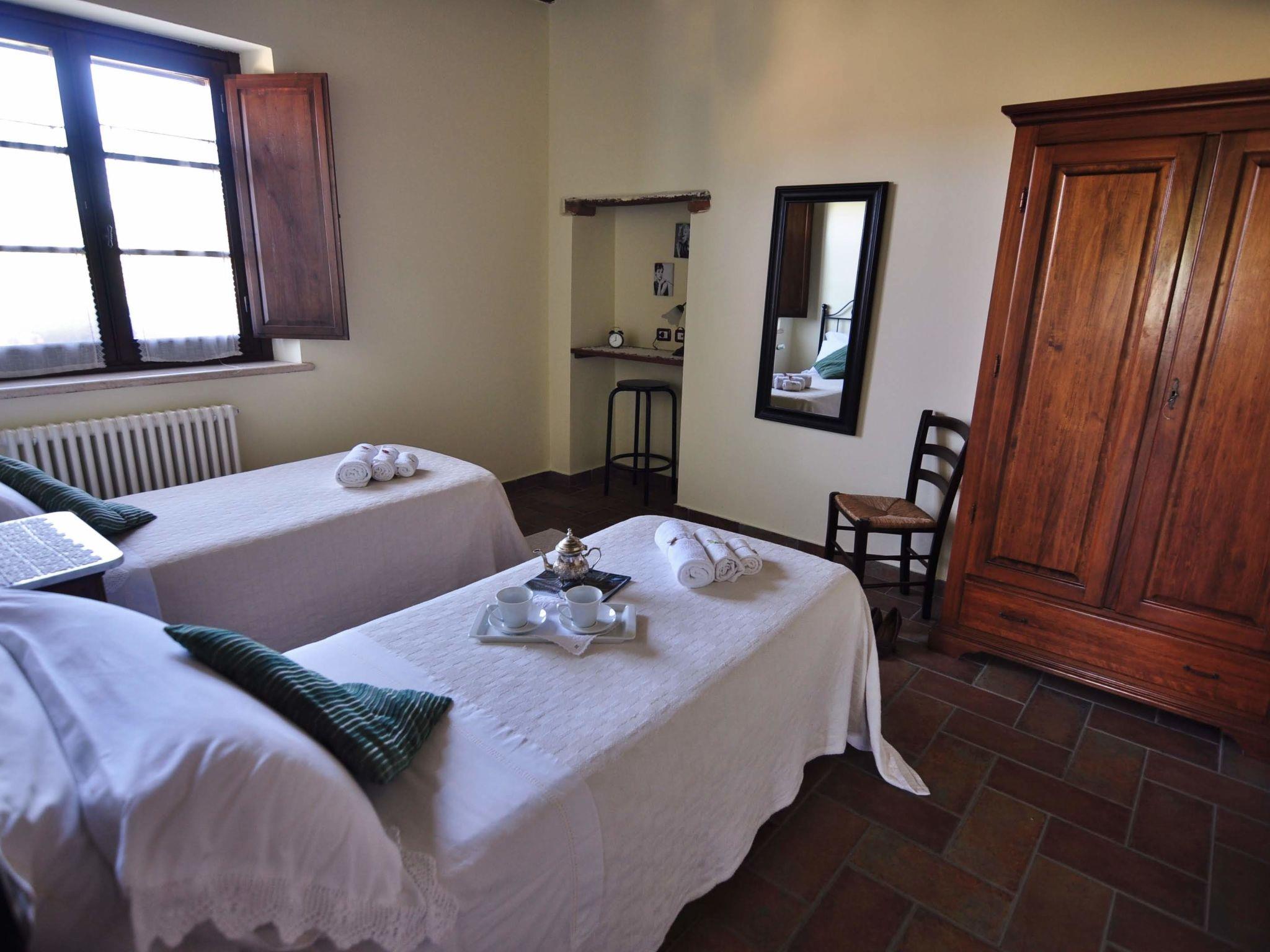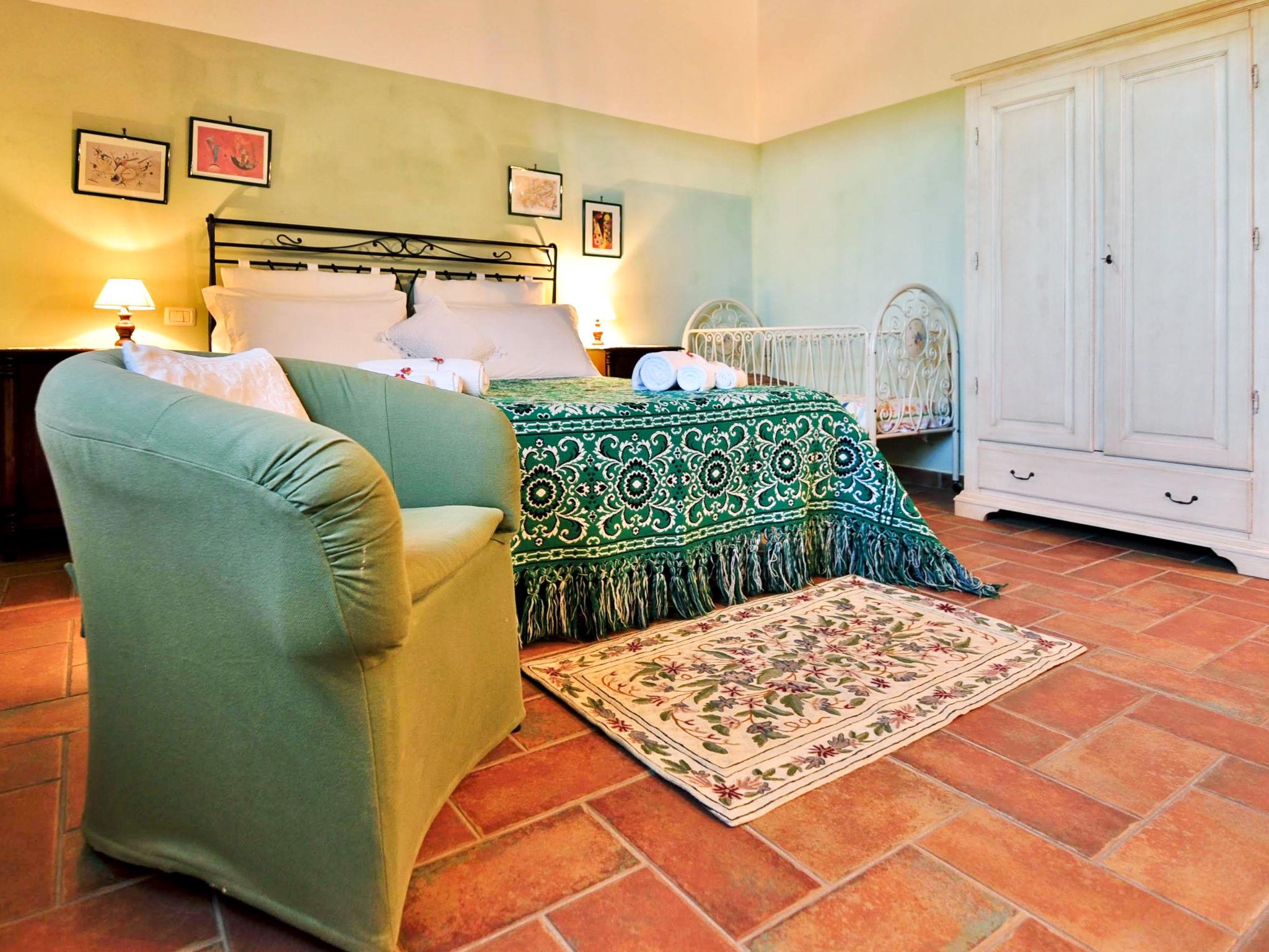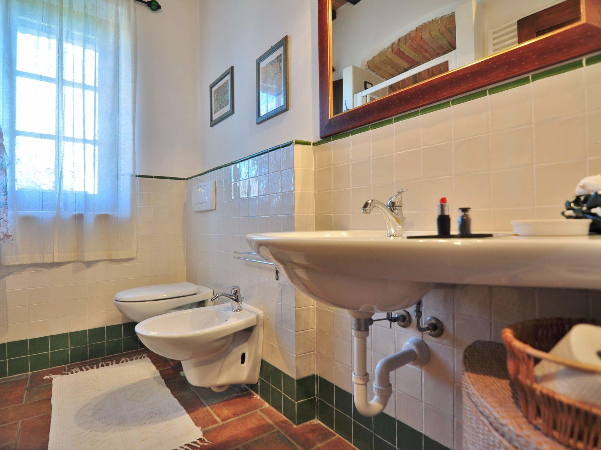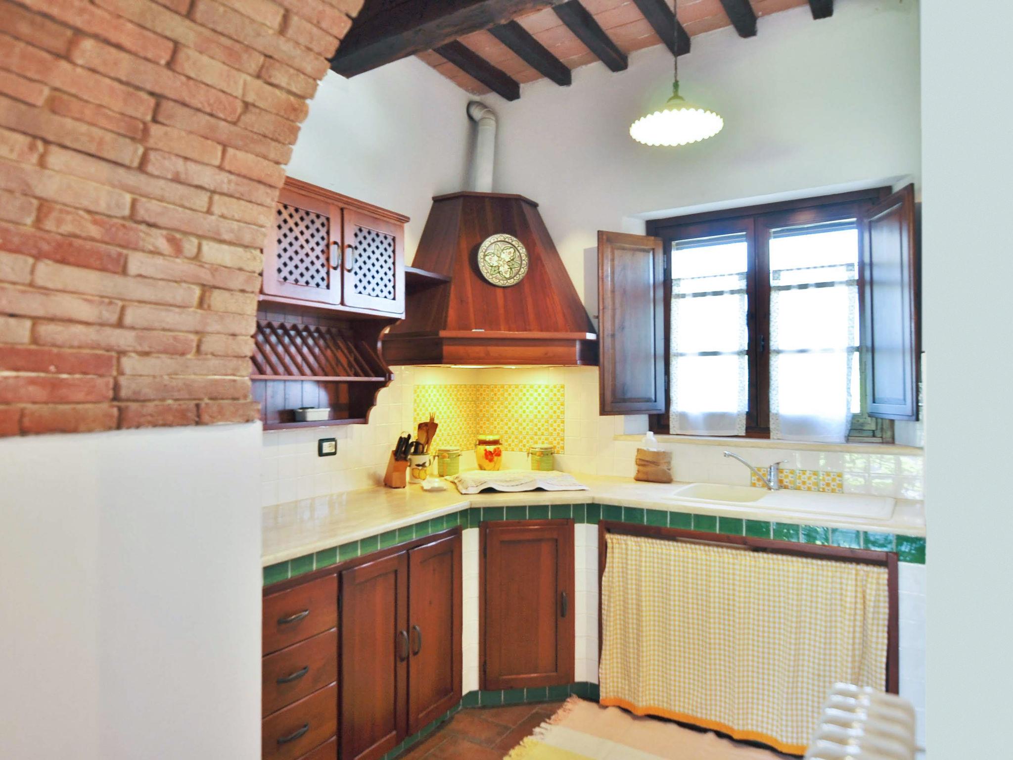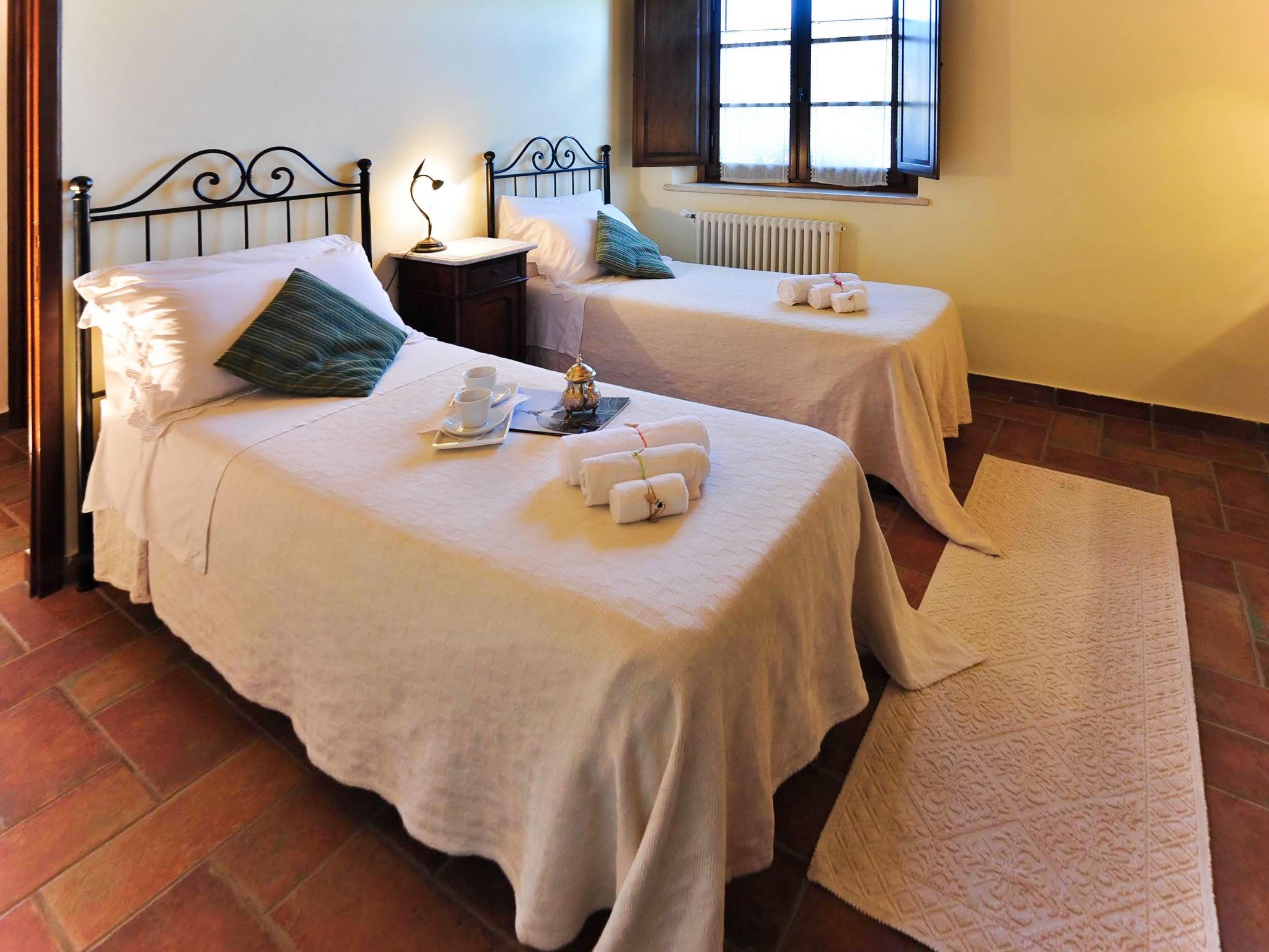 Very beautiful country house "Linearis", detached, surrounded by trees, fields and vineyards. 9 apartments in the residence. In the district of Linari 3 km from the centre of Poggibonsi, 6 km from the centre of Barberino Val d'Elsa, 15 km from the centre of San Gimignano, in a secluded, sunny, elevated position, 82 km from the sea, in the countryside. For shared use: beautiful, well-kept garden 10'000 m2 (fenced) with plants and trees, meadow, swimming pool fenced (14 x 7 m, depth 165 cm, seasonal availability: 01.Apr. - 05.Nov.). Outdoor shower, poolhouse with shower and WC, terrace, garden furniture, barbecue, children's playground, pool maintenance by the owner/gardener. In the complex: reception, lounge, washing machine (extra), tumble dryer (for shared use, extra). House maid on request (extra). 100 m footpath to the house. Parking on the premises, communal covered parking (extra). Grocery 2 km, supermarket 3 km, restaurant 2 km, bakery 2 km, bus stop 3 km, railway station "Poggibonsi" 3 km, sandy beach "Cecina Mare" 72 km, indoor swimming pool 3 km. Nearby attractions: Siena 36 km, Firenze 46 km, Volterra 38 km, Pisa 90 km. Please note: reception open 09:00-13:00 hrs. Suitable for families, baby equipment (included). Local sale of farm products. Please note: Loading and unloading of baggage is possible at the holiday house. Residence with electric gates. The owner lives in the same residence. All houses/apartments are individually designed/furnished. Obligation to wear bathing caps.