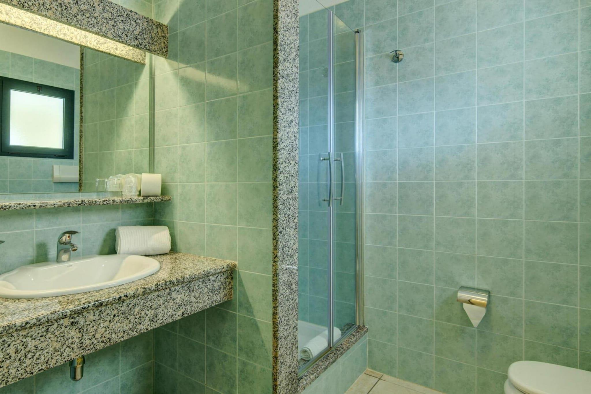 Stue(enkeltsovesofa, Fjernsyn(Ingen tyske TV-kanaler)), tekøkken(spisebord, kogeplade(Komfur med fire kogeplader, gas), elkedel, brødrister, mikrobølgeovn, køle-fryseskab), soveværelse(dobbeltseng), badeværelse(bruser, toilet, bidet, føntørrer), Grill center, Reception, Vaske faciliteter, Parkering, Legeområde, Have, tørretumbler(deles med andre gæster, betalt), bruser(deles med andre gæster, udendørs), vaskemaskine(deles med andre gæster, betalt), balkon eller terrasse, varme(gennem aircondition), klimaanlæg, terrasse(deles med andre gæster), havemøbler, solstole, Parasol, swimmingpool(deles med andre gæster, 7 x 7 m.), baby crib(paid)