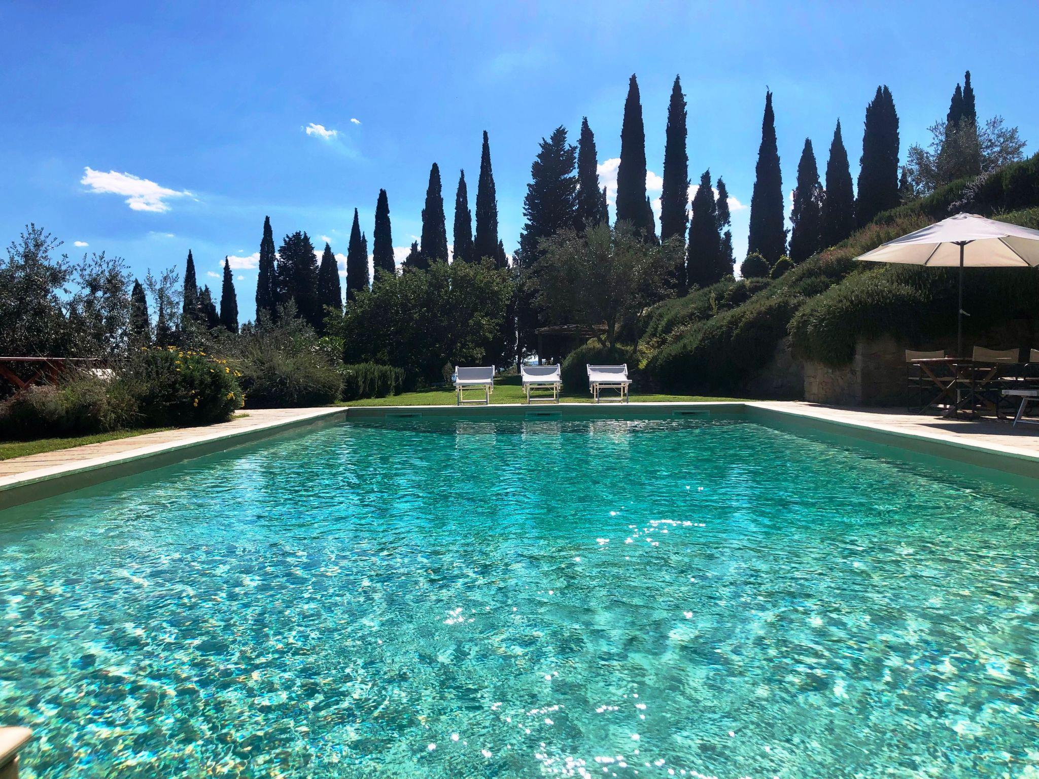 An independent stone building on the Poggio Corsucci estate, a panoramic place of great natural beauty in the heart of Tuscany. Immersed in greenery surrounded by large lawns, it is enriched by a large pergola from which you can admire an unforgettable sunset. Situated between Florence Siena and Arezzo, it is an excellent starting point for visiting the most renowned artistic and cultural centres, for organising wine and food itineraries in central Italy and for enjoying total relaxation at the edge of a swimming pool surrounded by centuries-old olive and cypress trees.