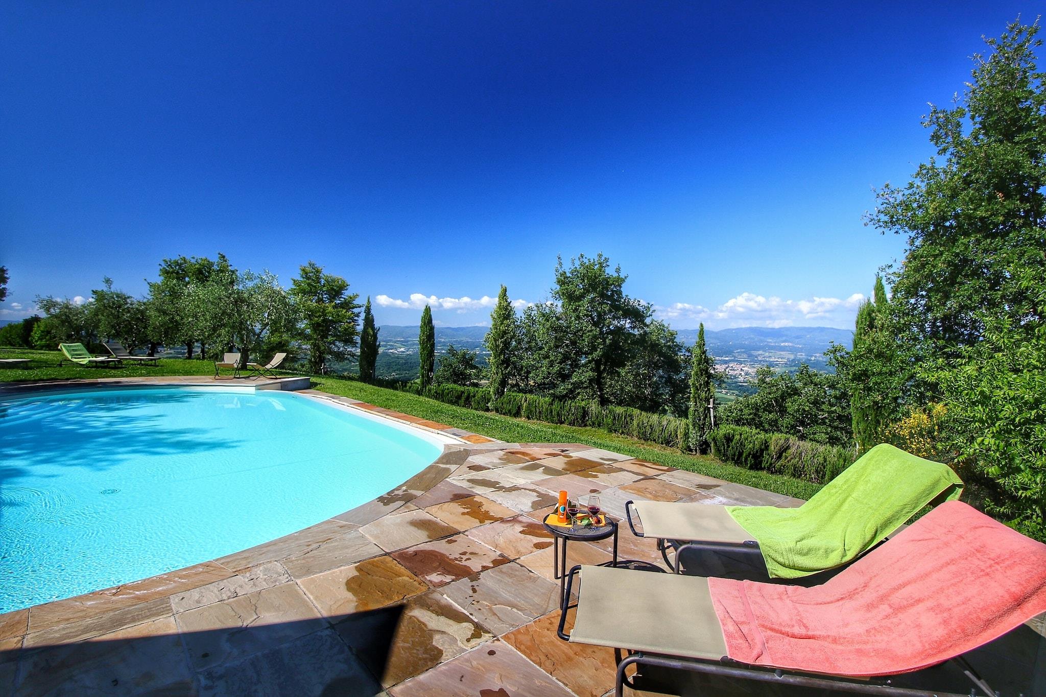 Dette feriehus ligger midt i bakkerne i Valdarno Arentino i 600 meters højde og tilbyder sine indbyggere en betagende udsigt over de toscanske dale. Villa Clemacine er beliggende på ejendom af en Agriturismo, som var blevet fuldstændig restaureret i sin oprindelige tilstand, mens de autentiske elementer bevares, og er omgivet af vinmarker, oliven- og frugtplantager. Villaen er moderne indrettet og opfylder alle krav til luksuriøs komfort. Agriturismo ligger på en ejendom på ca. 40 ha. af skov, som er en del af et naturreservat, der huser harer, egern, fasaner og andre dyrearter, du kan støde på under dine gåture. Du har en fælles udendørs swimmingpool til din rådighed, som tilbyder en betagende udsigt over Pieve di Gropina. En anbefaling til de romantiske mennesker blandt os, der elsker at opleve en solnedgang fra swimmingpoolen! Udover komplekset ligger en gammel lille kirke, som i gamle dage blev brugt som mødested for de regionale bønder. Agriturismoen dyrker også hvid- og rødvin, Chianti og olivenolie. På grund af den gunstige beliggenhed er velkendte byer som Firenze, Arezzo og Siena nemme at nå.