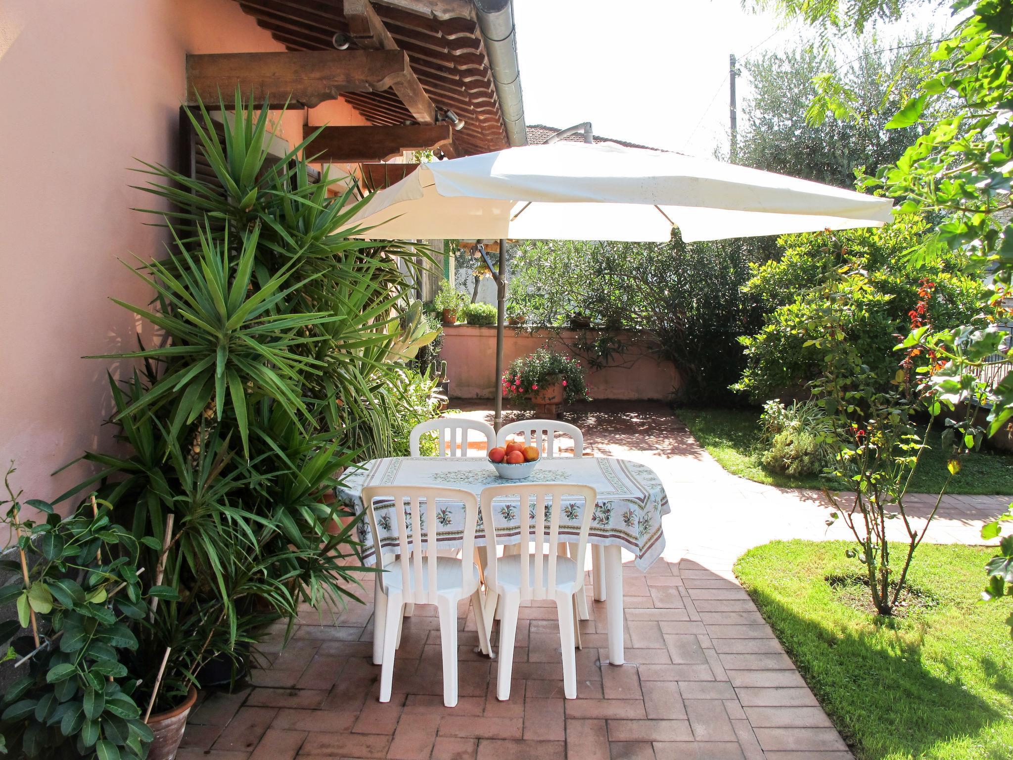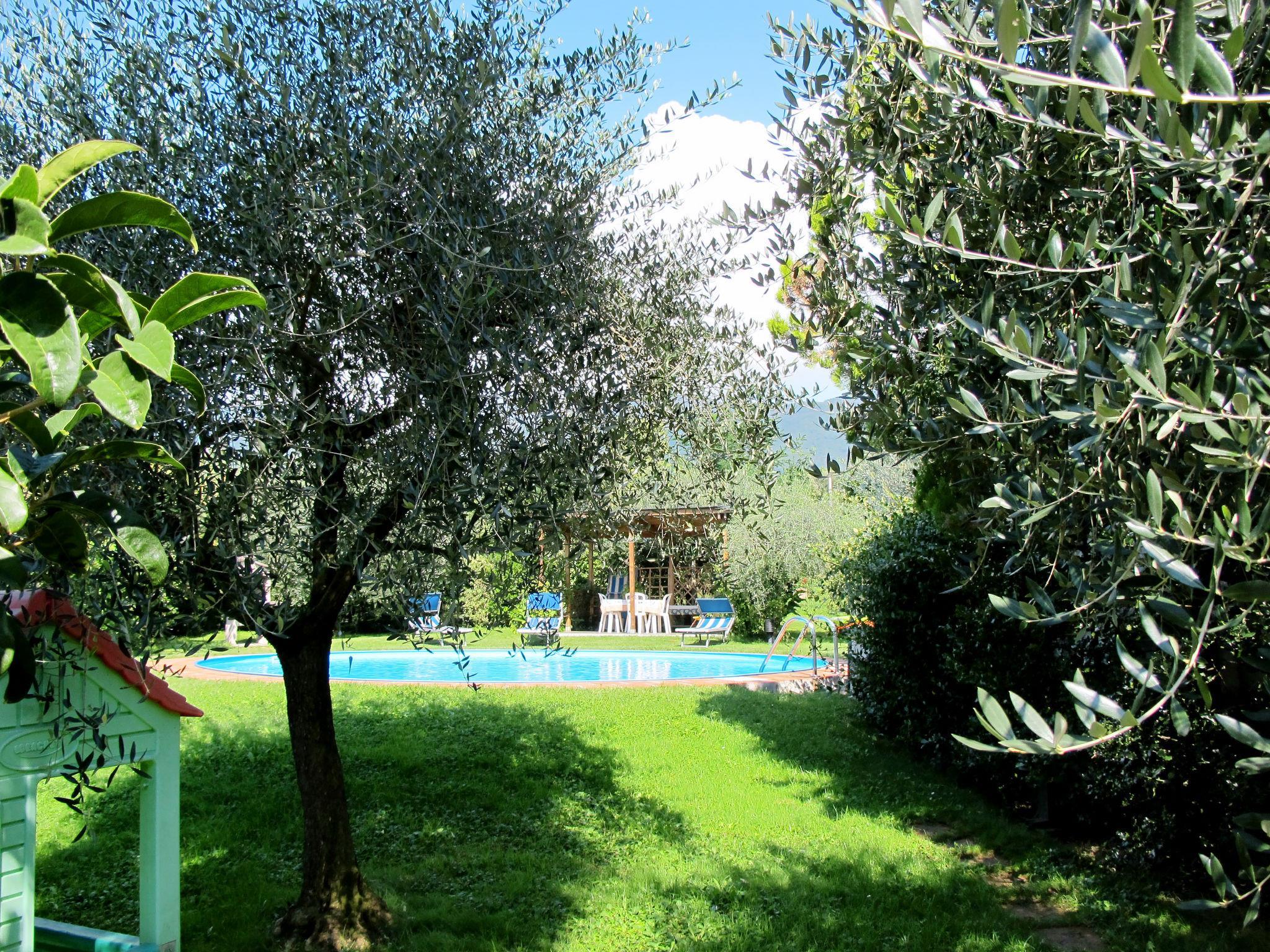 Segromigno in Monte 10 km from Lucca: Semi-detached house "Agrifoglio". 400 m from the centre of Segromigno in Monte, 36 km from the centre of Pisa, 44 km from the sea. Private: property 200 m2 (fenced), well-kept garden with trees, swimming pool (8 m diameter, depth 120 cm, seasonal availability: 01.May. - 30.Sep.). Arbour. In the house: central heating system, washing machine (for shared use), heating to be paid on the spot (28.Mar. - 30.Oct.), heating available only from 31.Oct. - 27.Mar.. Shop 400 m, supermarket 5.6 km, bus stop 300 m, railway station "Lucca" 10 km, sandy beach "Viareggio" 44 km. Nearby attractions: Monsummano Terme 33 km, Collodi Pinocchio Park 8 km, Montecatini Terme 27 km, San Giuliano Terme 27 km, Firenze 90 km, Marina di Pisa 52 km. Well-known lakes can easily be reached: Lago di Massaciuccoli 32 km, Torre del Lago 40 km. Please note: the owner lives on the same property. Owner lives in separate semi-detached house.