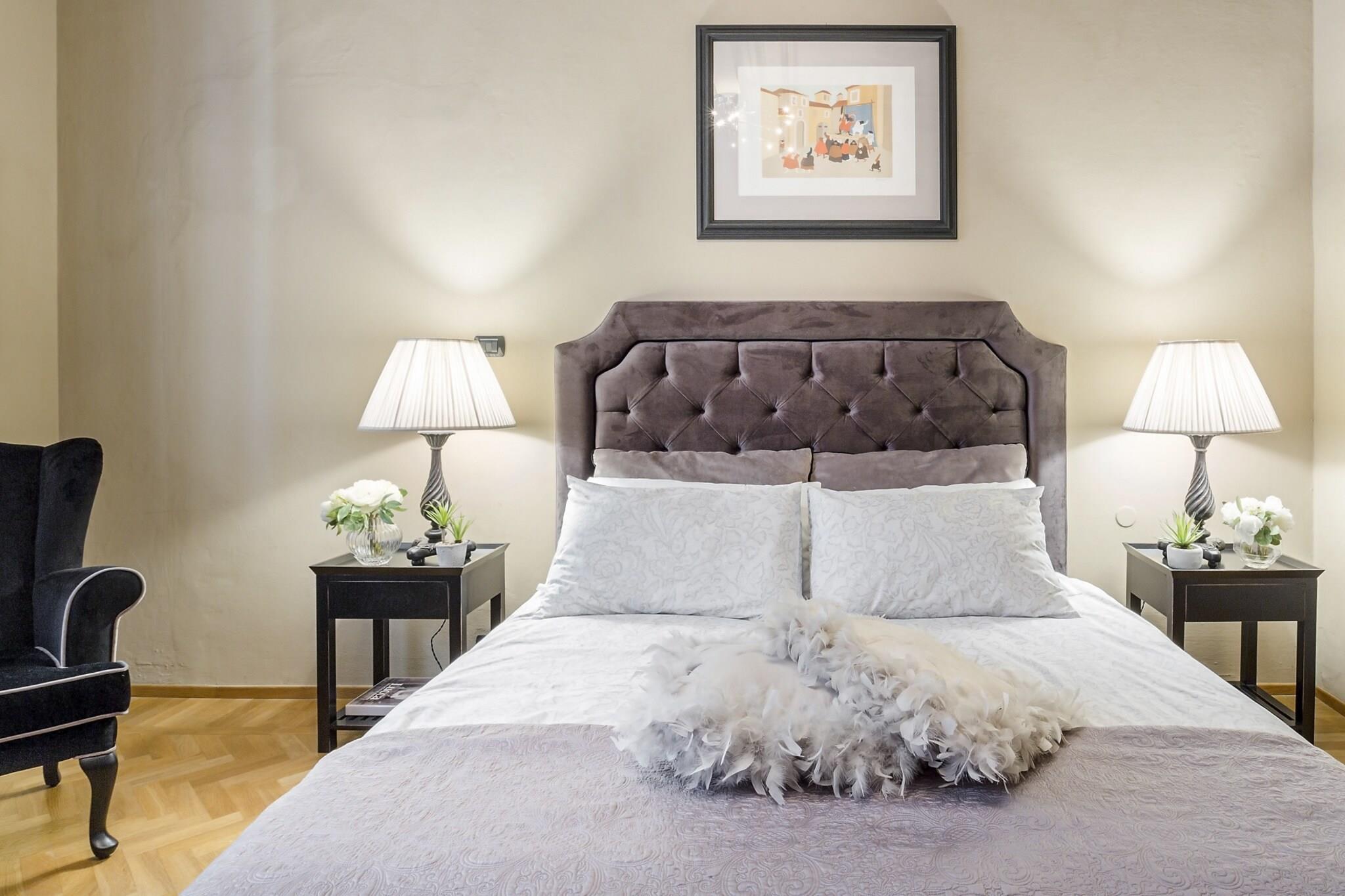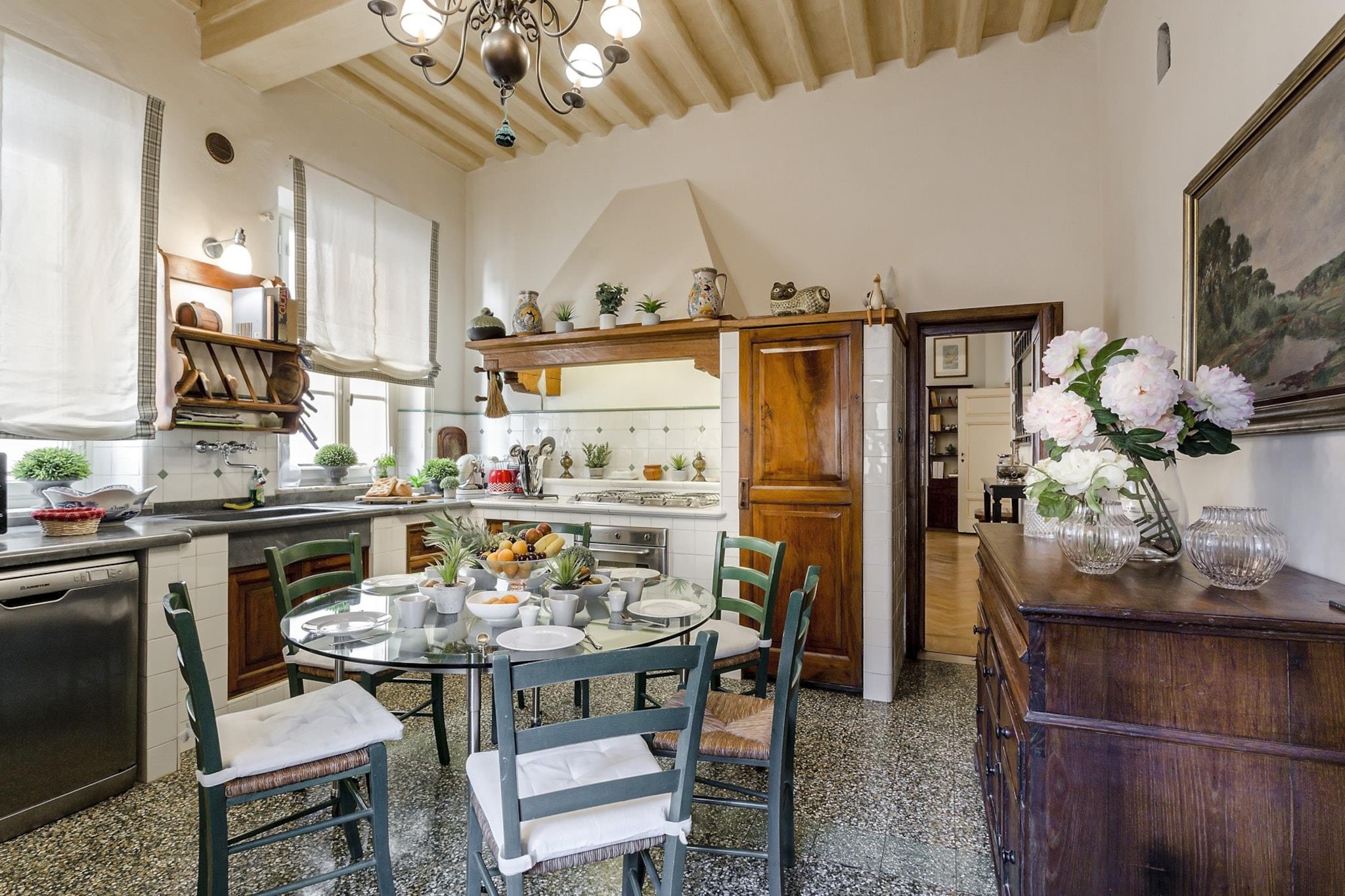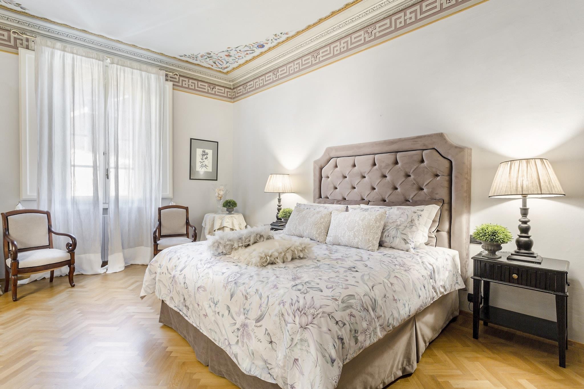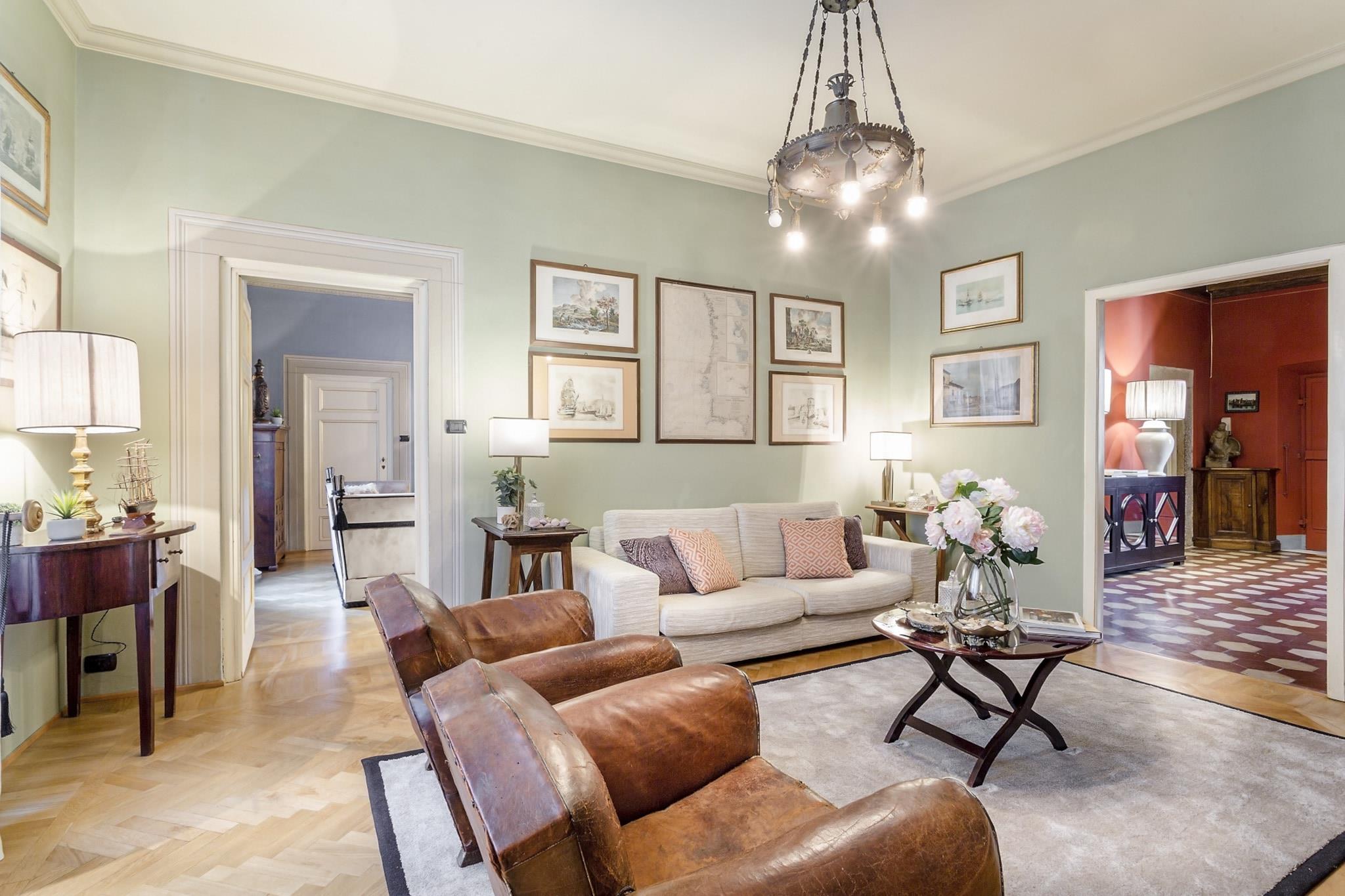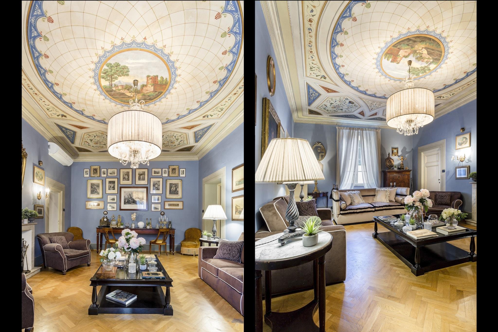 Denne udsøgte lejlighed, badet i Toscanas strålende sollys, er ideelt beliggende nær den travle Via Fillungo, hvilket gør den til en førsteklasses beliggenhed for at udforske Luccas rige historie og kultur. Kun fem minutters gåtur bringer dig til bemærkelsesværdige vartegn som Piazza San Michele, Anfiteatro og Guinigi-tårnet, samt antikvitetsmarkedet og offentlig parkering. Blandingen af historisk charme og moderne tilgængelighed skaber en unik atmosfære i denne pulserende by. Lejligheden kombinerer harmonisk elegansen af sin arkitektoniske arv med moderne bekvemmeligheder. Funktioner som freskomalerier i loftet og en marmorskorsten minder om byens historiske fortid, mens moderne bekvemmeligheder som kabel-tv, Wi-Fi og aircondition sikrer et behageligt ophold. Studieværelset tilbyder et ideelt sted til fjernarbejde, og det veludstyrede køkken med opvaskemaskine giver mulighed for stressfri madlavning, hvilket gør det nemt at nyde kvalitetstid ved det store spisebord med venner og familie. Gæsterne kan nyde lejlighedens traditionelle pragt, fremhævet af Murano-glaslysekroner og rigt mønstrede tæpper, samtidig med at de værdsætter den sofistikerede stil i moderne møbler. Beliggenheden opfordrer til udforskning af Luccas pulserende scene, lige fra at lytte til aftenlige Puccini-koncerter i den nærliggende Basilica di San Giovanni til at slentre langs de ikoniske renæssancemure. Med forskellige spisemuligheder, herunder restauranter langs kanalen og hyggelige pladser, der tilbyder lokal vin og snacks, lover oplevelsen at være både fornøjelig og mindeværdig. Bemærk venligst, at lejligheden ligger på anden sal og ikke har elevator, hvilket tilføjer et charmerende, omend autentisk, præg til din toscanske ferie. Bemærk: Turistskat skal betales på ejendommen.