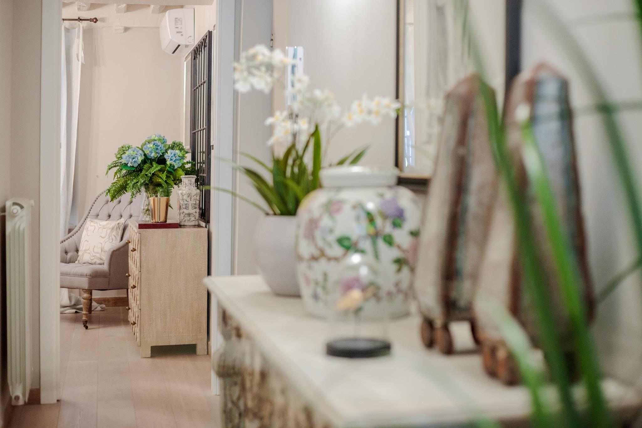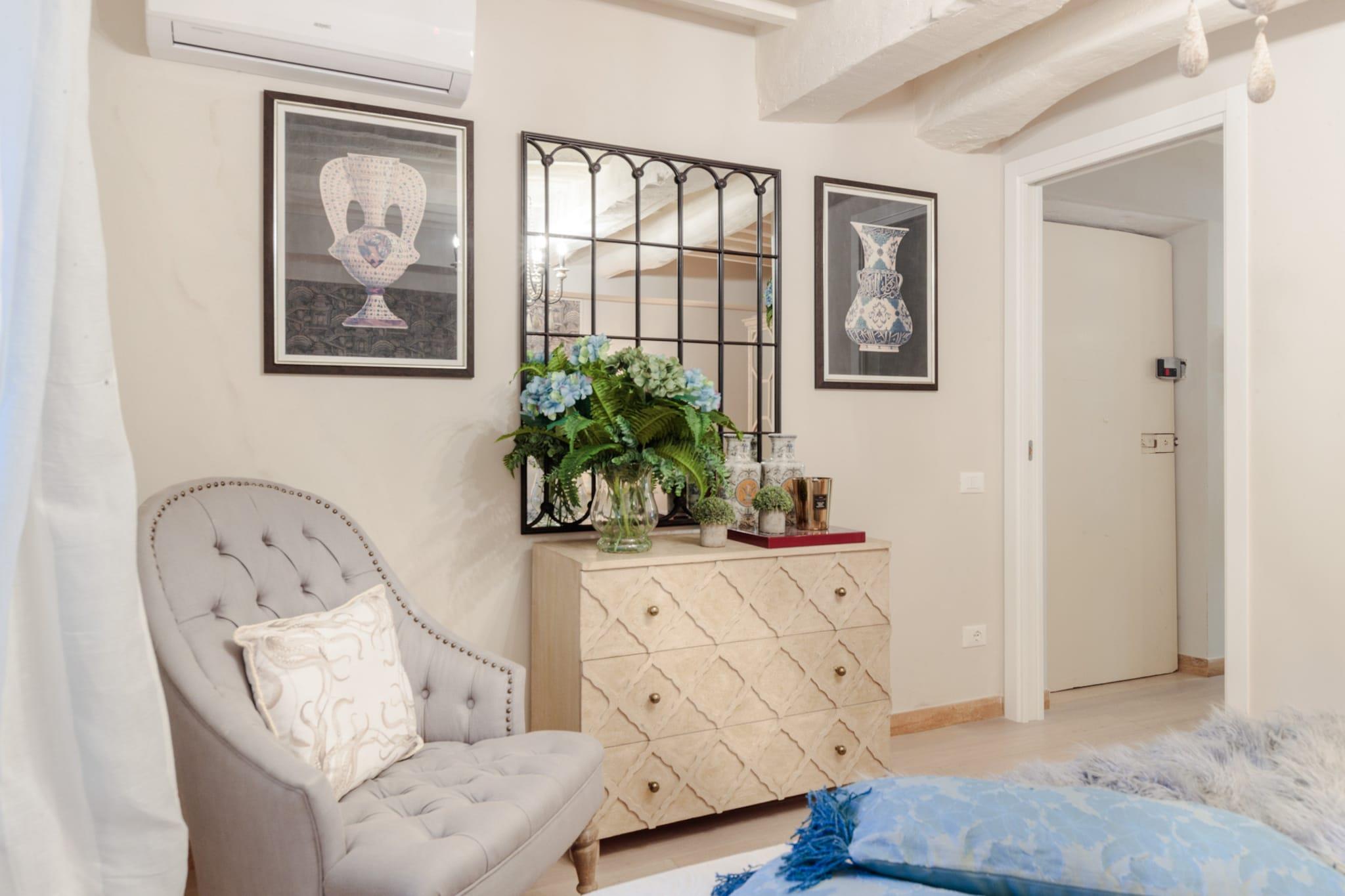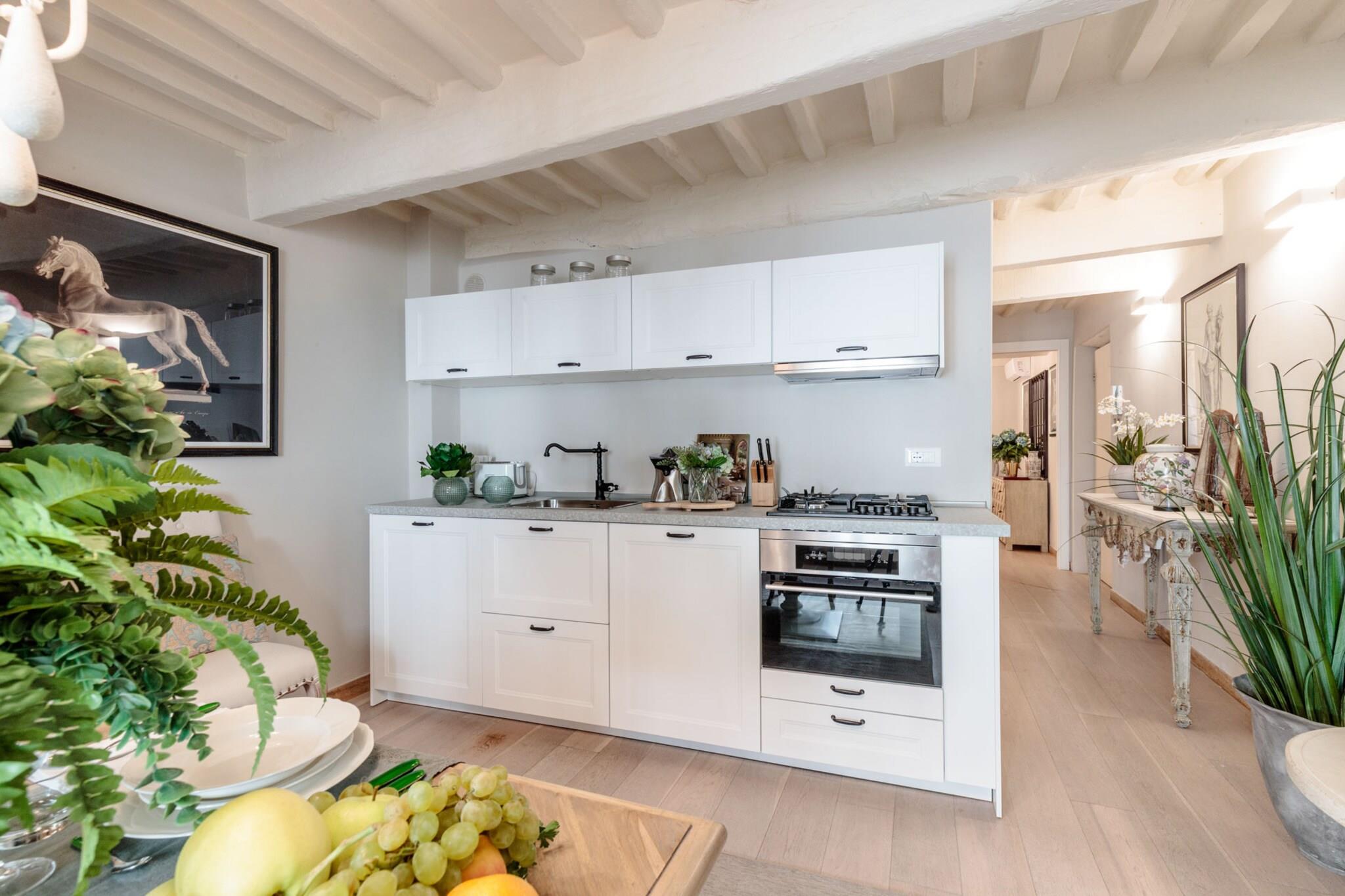 Dette romantiske gemmested i stueetagen ligger lige ved Via della Rosa og tilbyder en rolig tilflugtssted i hjertet af det historiske Lucca. Denne smukt restaurerede lejlighed blander tidløs elegance med moderne komfort og inviterer dig til at sætte farten ned og nyde Toscanas charme. Indenfor byder en blød og indbydende opholdsstue dig velkommen med høje, hvidkalkede bjælkelofter og omhyggeligt udvalgte detaljer. Soveværelset har håndmalet tapet, en overdådig seng under en glitrende lysekrone og store vinduer med udsigt over en rolig, hemmelig have. Badeværelset er et raffineret fristed med en elegant marmorbruser - perfekt til afslapning efter en dag med udforskning. Det fuldt udstyrede køkken indeholder alt fra elkedel og brødrister til både italienske og amerikanske kaffemaskiner, mikrobølgeovn og vaskemaskine - ideelt til længere ophold eller hyggelige måltider derhjemme. Et separat vaskerum tilføjer ekstra bekvemmelighed. Du vil være kun få øjeblikke fra Luccas mest ikoniske seværdigheder: Middelalderkirken Chiesa della Rosa og de gamle romerske ruiner ligger kun et minut væk. Den berømte Piazza San Giovanni, hjemsted for Puccini-koncerter, ligger kun en kort gåtur væk. Restauranter, vinbarer og gelato-butikker er overalt omkring dig og tilbyder alt fra romantiske middage til afslappede snacks. Togstationen ligger fem minutters gang derfra, og der er sikker parkering tilgængelig cirka 7-8 minutter væk til fods. Uanset om du søger en romantisk ferie eller en stilfuld storbyferie, lover dette drømmeagtige Lucca-tilflugtssted et uforglemmeligt ophold. Bemærk: Turistskat skal betales på ejendommen.