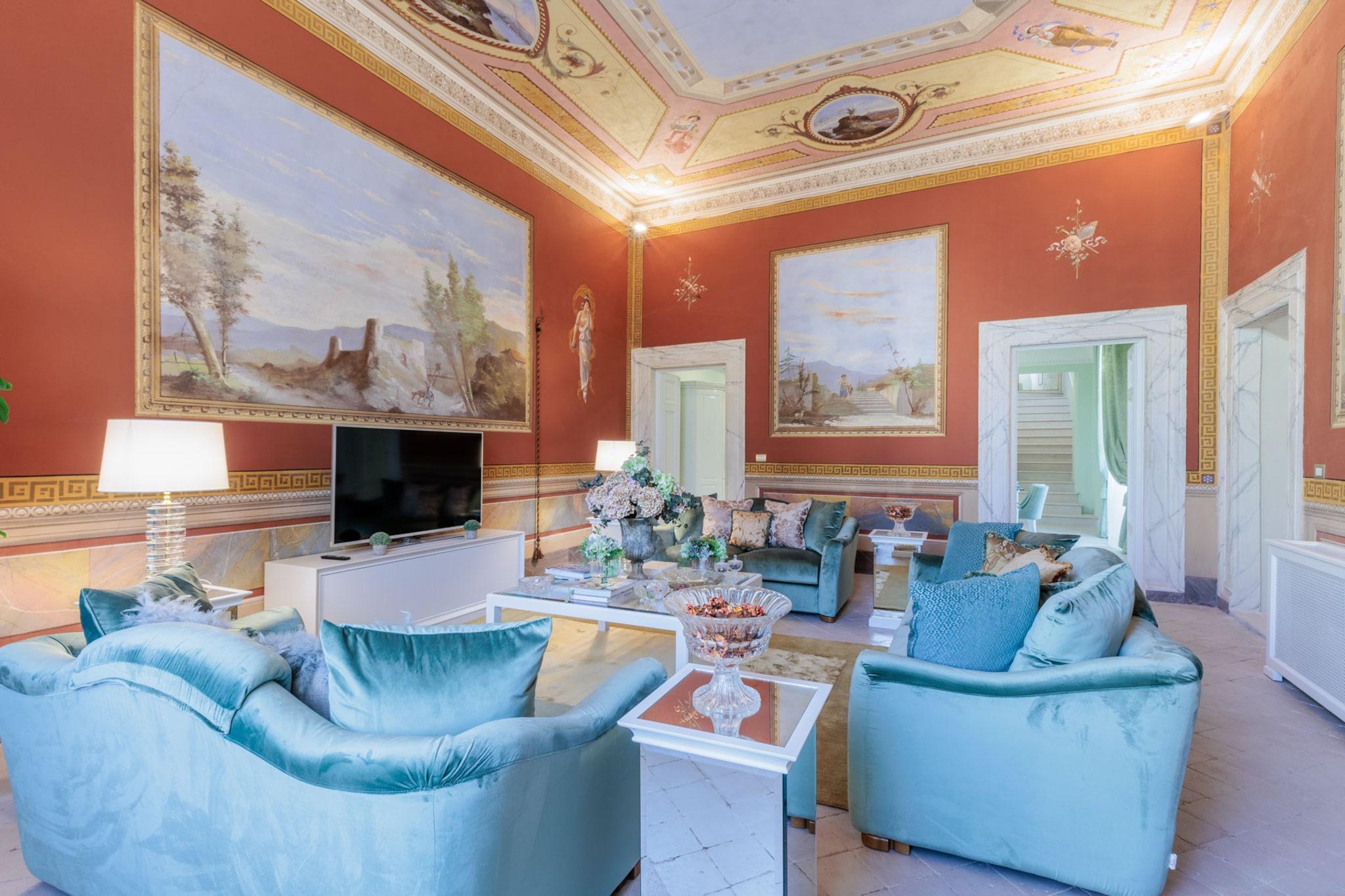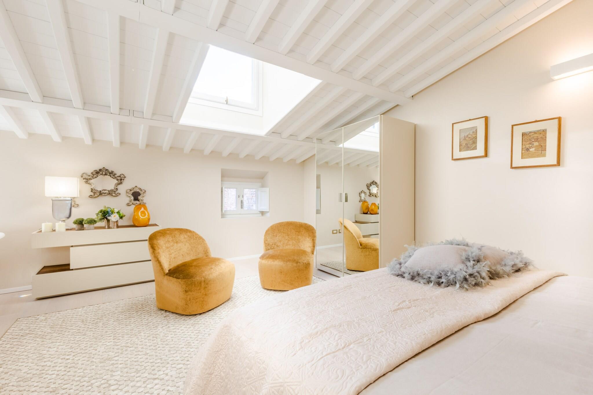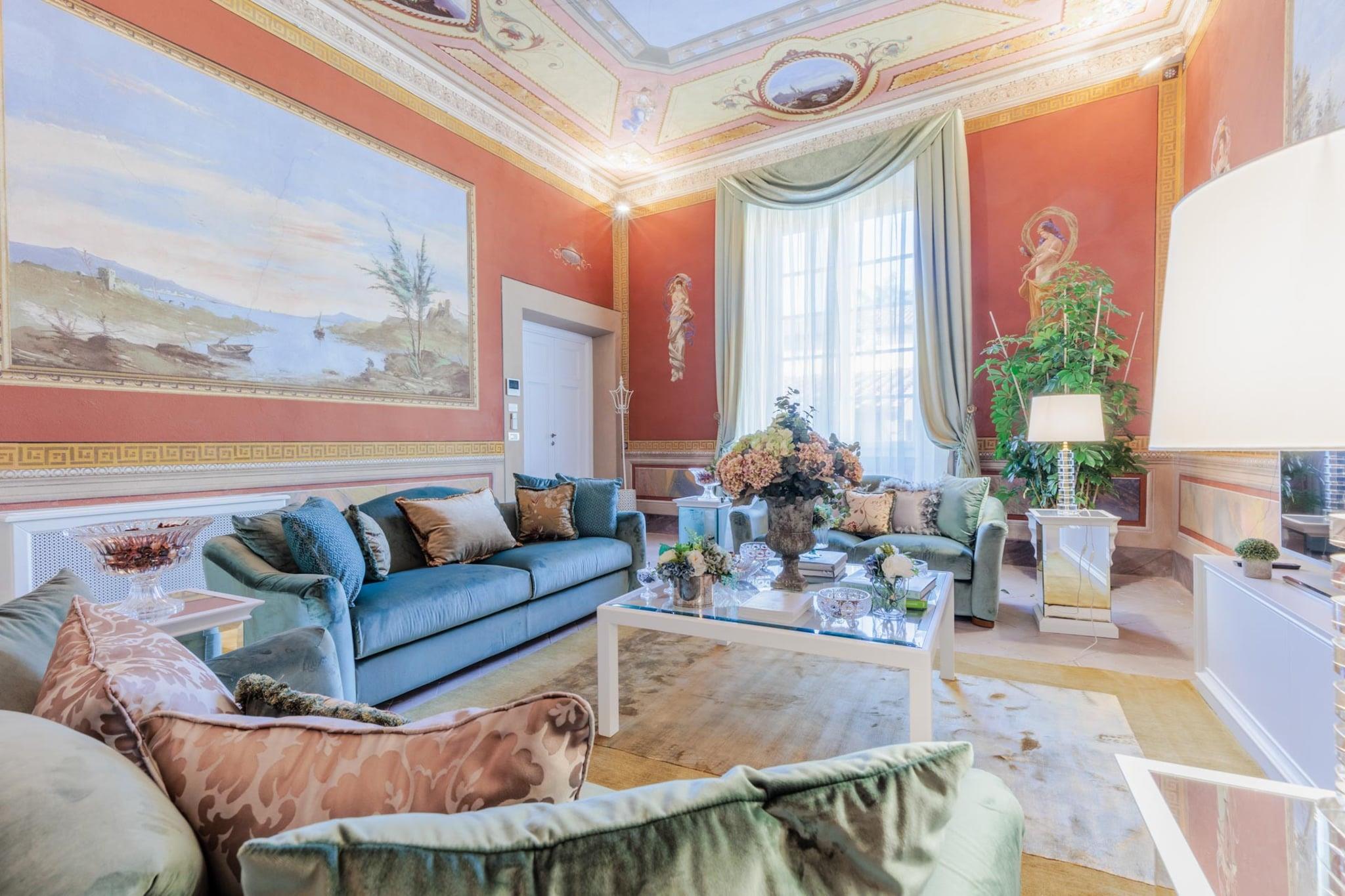 Gemt væk i hjertet af Luccas historiske centrum, er The Duchess Chambers en majestætisk tilflugtssted, hvor århundreder gammel elegance møder moderne komfort. Denne luksuriøse bolig på 200 m², der engang var hjemsted for adelen, er udsmykket med freskomalerier i stuen og trælofter i soveværelserne. Den er designet til at rumme op til seks gæster og har tre soveværelser, hver med en kingsize-seng og eget badeværelse. Den rummelige stue, fyldt med naturligt lys fra store vinduer, åbner ind til en spiseplads og et fuldt udstyret køkken, perfekt til at dele måltider efter en dag med udforskning. Hjemmet inkluderer også et gæstetoilet, vaskerum og bekvem elevatoradgang. Fra det øjeblik du træder udenfor, udfolder Luccas skatte sig omkring dig. Piazza San Michele ligger lige rundt om hjørnet, og inden for få minutters gang finder du Piazza Napoleone, det ikoniske Guinigi-tårn, Via Fillungos butikker og den elliptiske Piazza Anfiteatro. Den berømte katedral San Martino og antikvitetsmarkedet ligger også i nærheden og tilbyder en blanding af historie, kunst og lokal smag. Uanset om du foretrækker at slentre i brostensbelagte gader eller nyde espresso på en café, er byens charme altid lige ved din dør. The Duchess Chambers er godt forbundet og centralt beliggende, og er også en ideel base for at udforske områder uden for Lucca. Hovedbanegården, kun en kort gåtur væk, tilbyder nem adgang til Firenze, Pisa, Siena og endda Rom. Sikker parkering er tilgængelig cirka ti minutter fra ejendommen for gæster med bil. Uanset om du er her for kultur, gastronomi eller en ferie på landet, blander denne historiske perle ædel elegance med det bedste af toscansk livsstil. Bemærk: Turistskat skal betales på ejendommen.