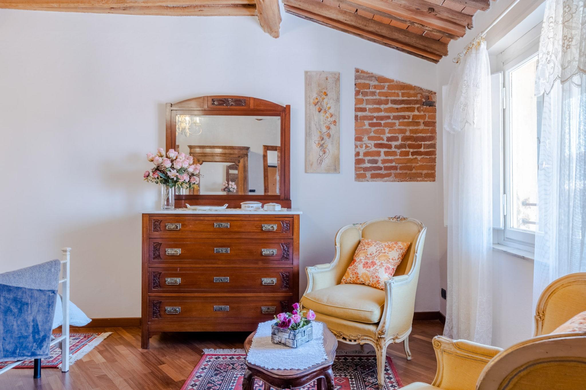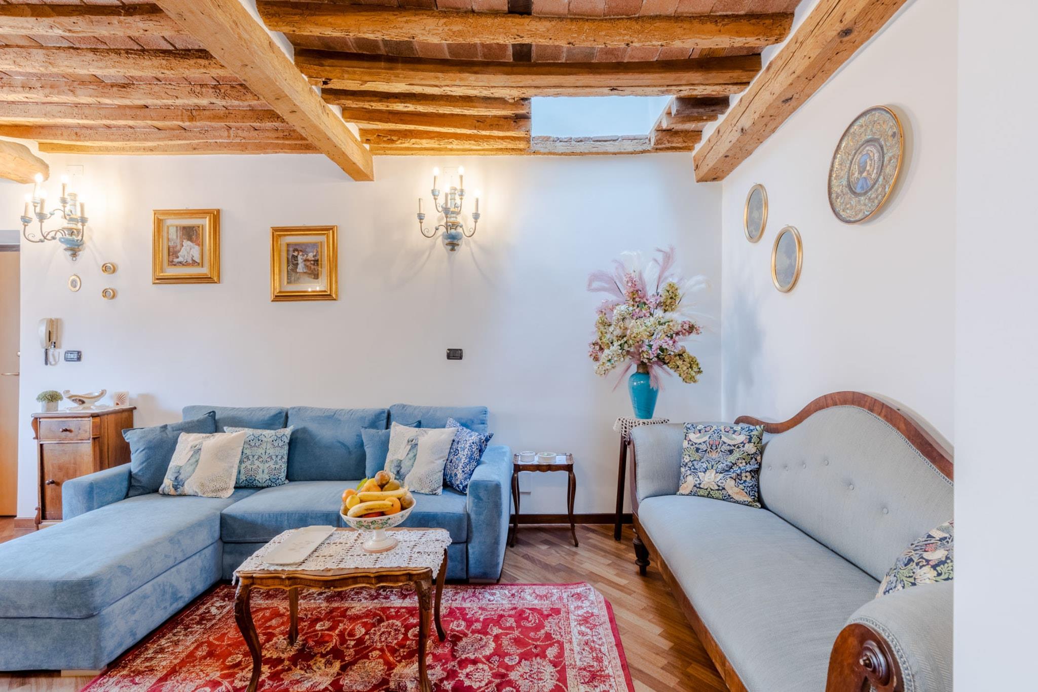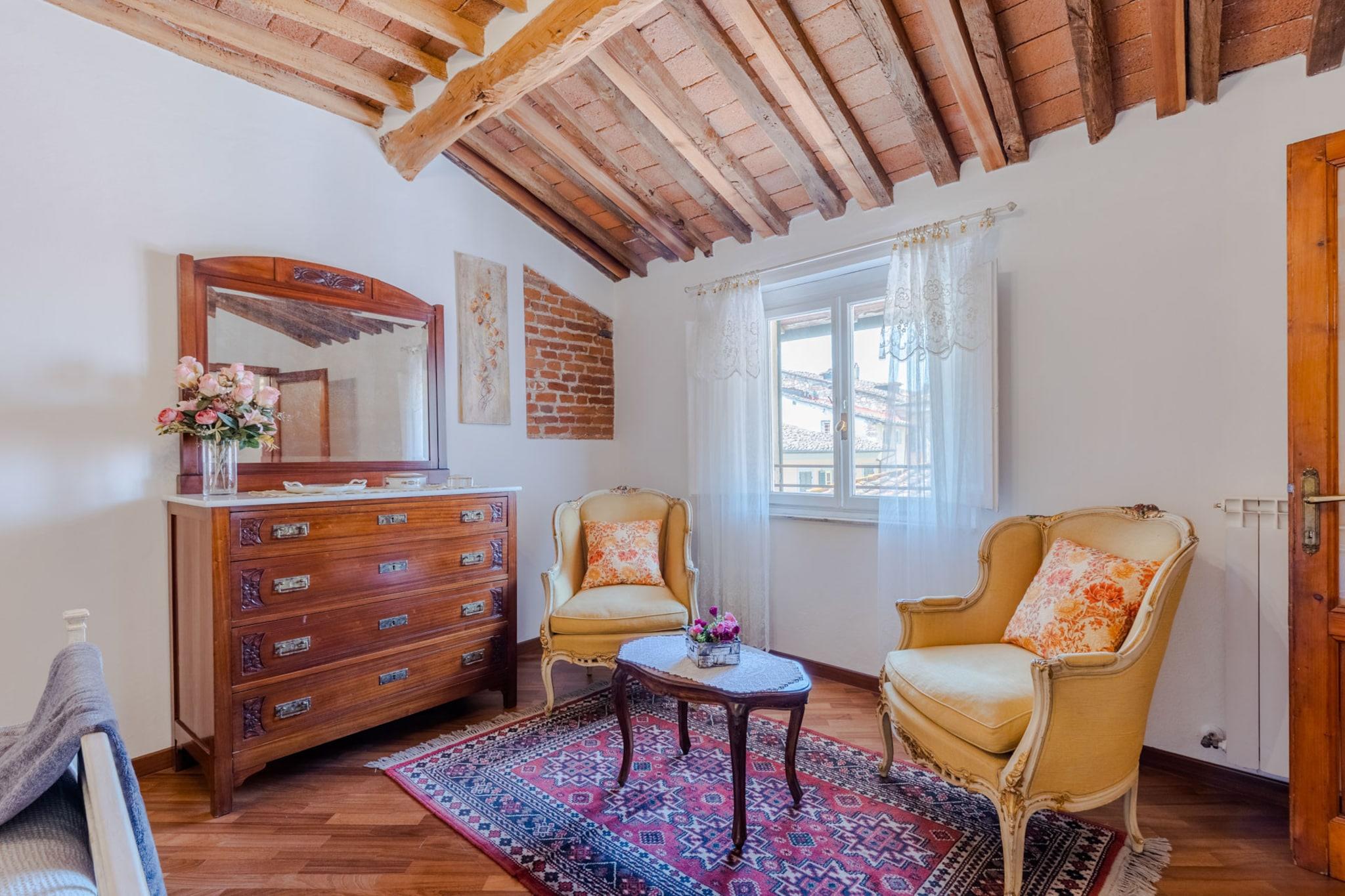 Træd ind i et levende stykke italiensk historie i denne unikke lejlighed, der ligger i det middelalderlige tårn i Bastionen Porta San Gervasio, en af Luccas oprindelige fæstningsværker fra 1100-tallet. Disse historiske mure husede engang byens vagter og deres kommandør, som boede her for at beskytte Lucca fra tårnets høje udsigtspunkt. Nu er det en omhyggeligt designet bolig i tre etager på tredje sal, der blander århundreder gammel arkitektur med vintagemøbler, livlige detaljer og moderne faciliteter, herunder WiFi og aircondition. Lejlighedens panoramavinduer åbner ud mod hustagene og de omkringliggende bakker, hvilket bringer landbrisen ind og indrammer den fredelige skyline. Dens layout inkluderer en hyggelig opholdsstue, et fuldt udstyret køkken med charmerende udsigt, to badeværelser, et soveværelse, et værelse med to enkeltsenge og ovenlysvindue, et vaskerum og et soveværelse på øverste niveau med en fransk dør, der tilbyder spektakulær udsigt - det tidligere kammer for den middelalderlige chefvagt. Charmen ved dens middelalderlige struktur er intakt, hvilket gør det til et sjældent og fordybende ophold, selvom det måske ikke er egnet til gæster med mobilitetsproblemer. Lejligheden er centralt beliggende inden for Luccas bymure, inden for den begrænsede trafikzone (ZTL), og tilbyder ikke parkering på stedet. Den nærliggende Mazzini-parkeringsplads ligger dog en kort gåtur væk og er let tilgængelig ved at følge skiltningen for at undgå områder med begrænset trafik. Med shopping, caféer og monumenter i nærheden tilbyder boligen en balance mellem historie og bekvemmelighed. Bemærk venligst, at sen indtjekning er mulig mod et gebyr, og at tjenesterne er selvforplejning i overensstemmelse med italiensk lejelovgivning. Bemærk: Turistskat skal betales på ejendommen.