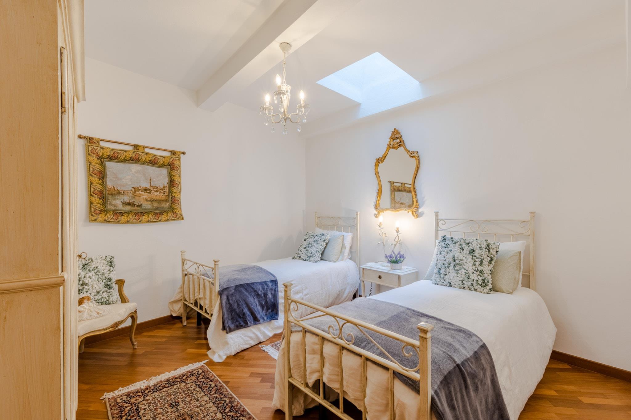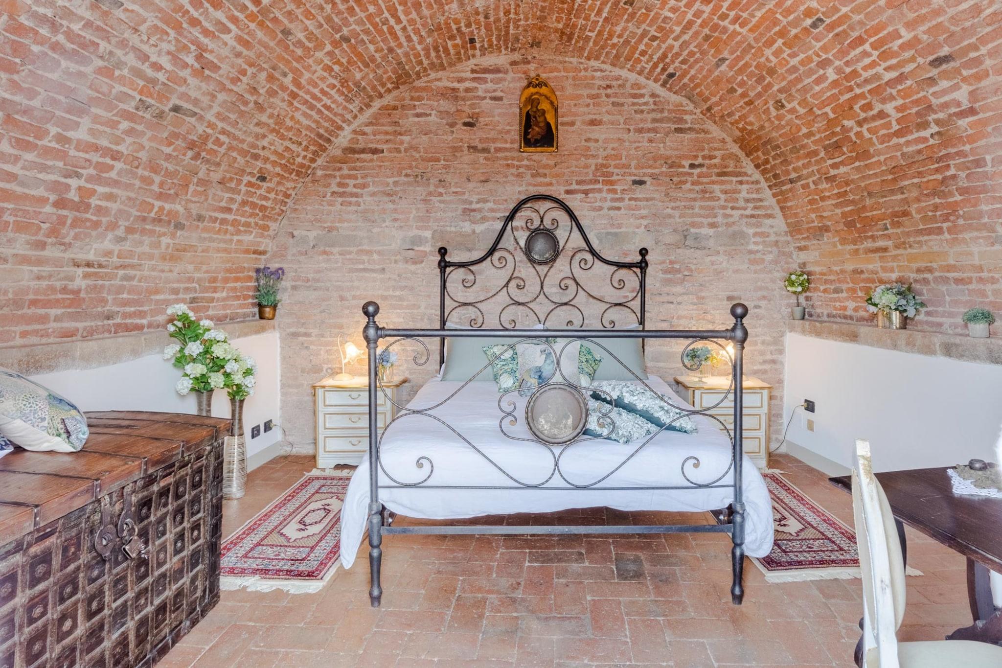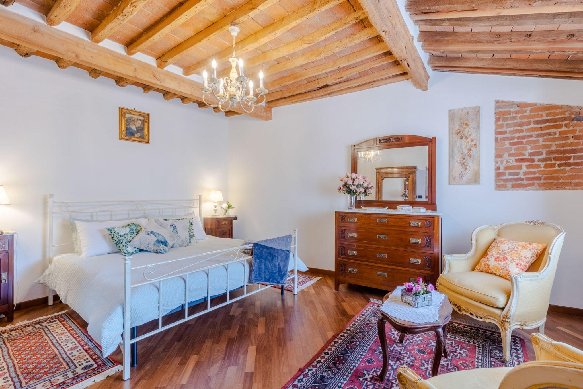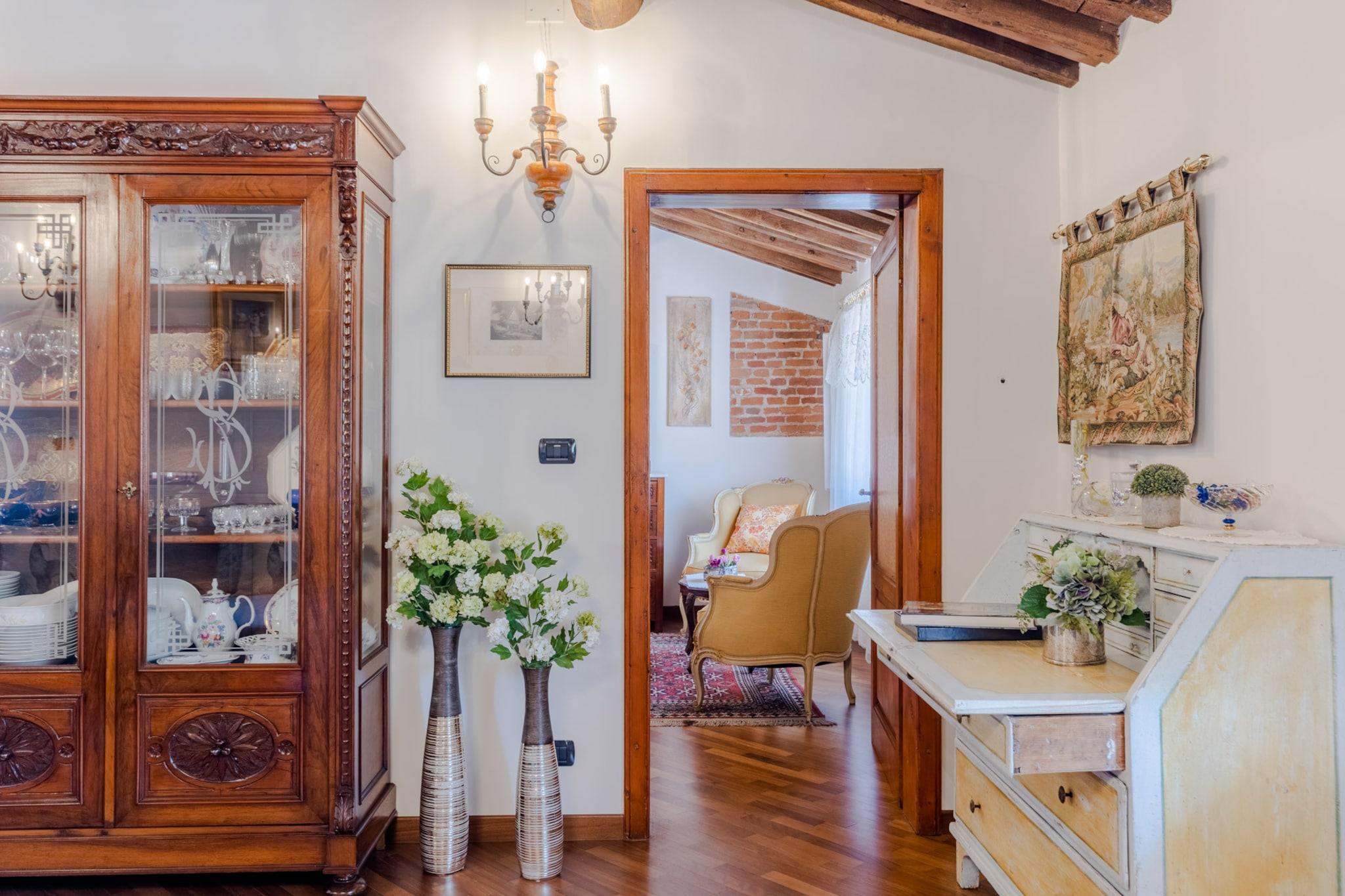 Træd ind i et levende stykke italiensk historie i denne unikke lejlighed, der ligger i det middelalderlige tårn i Bastionen Porta San Gervasio, en af Luccas oprindelige fæstningsværker fra 1100-tallet. Disse historiske mure husede engang byens vagter og deres kommandør, som boede her for at beskytte Lucca fra tårnets høje udsigtspunkt. Nu er det en omhyggeligt designet bolig i tre etager på tredje sal, der blander århundreder gammel arkitektur med vintagemøbler, livlige detaljer og moderne faciliteter, herunder WiFi og aircondition. Lejlighedens panoramavinduer åbner ud mod hustagene og de omkringliggende bakker, hvilket bringer landbrisen ind og indrammer den fredelige skyline. Dens layout inkluderer en hyggelig opholdsstue, et fuldt udstyret køkken med charmerende udsigt, to badeværelser, et soveværelse, et værelse med to enkeltsenge og ovenlysvindue, et vaskerum og et soveværelse på øverste niveau med en fransk dør, der tilbyder spektakulær udsigt - det tidligere kammer for den middelalderlige chefvagt. Charmen ved dens middelalderlige struktur er intakt, hvilket gør det til et sjældent og fordybende ophold, selvom det måske ikke er egnet til gæster med mobilitetsproblemer. Lejligheden er centralt beliggende inden for Luccas bymure, inden for den begrænsede trafikzone (ZTL), og tilbyder ikke parkering på stedet. Den nærliggende Mazzini-parkeringsplads ligger dog en kort gåtur væk og er let tilgængelig ved at følge skiltningen for at undgå områder med begrænset trafik. Med shopping, caféer og monumenter i nærheden tilbyder boligen en balance mellem historie og bekvemmelighed. Bemærk venligst, at sen indtjekning er mulig mod et gebyr, og at tjenesterne er selvforplejning i overensstemmelse med italiensk lejelovgivning. Bemærk: Turistskat skal betales på ejendommen.