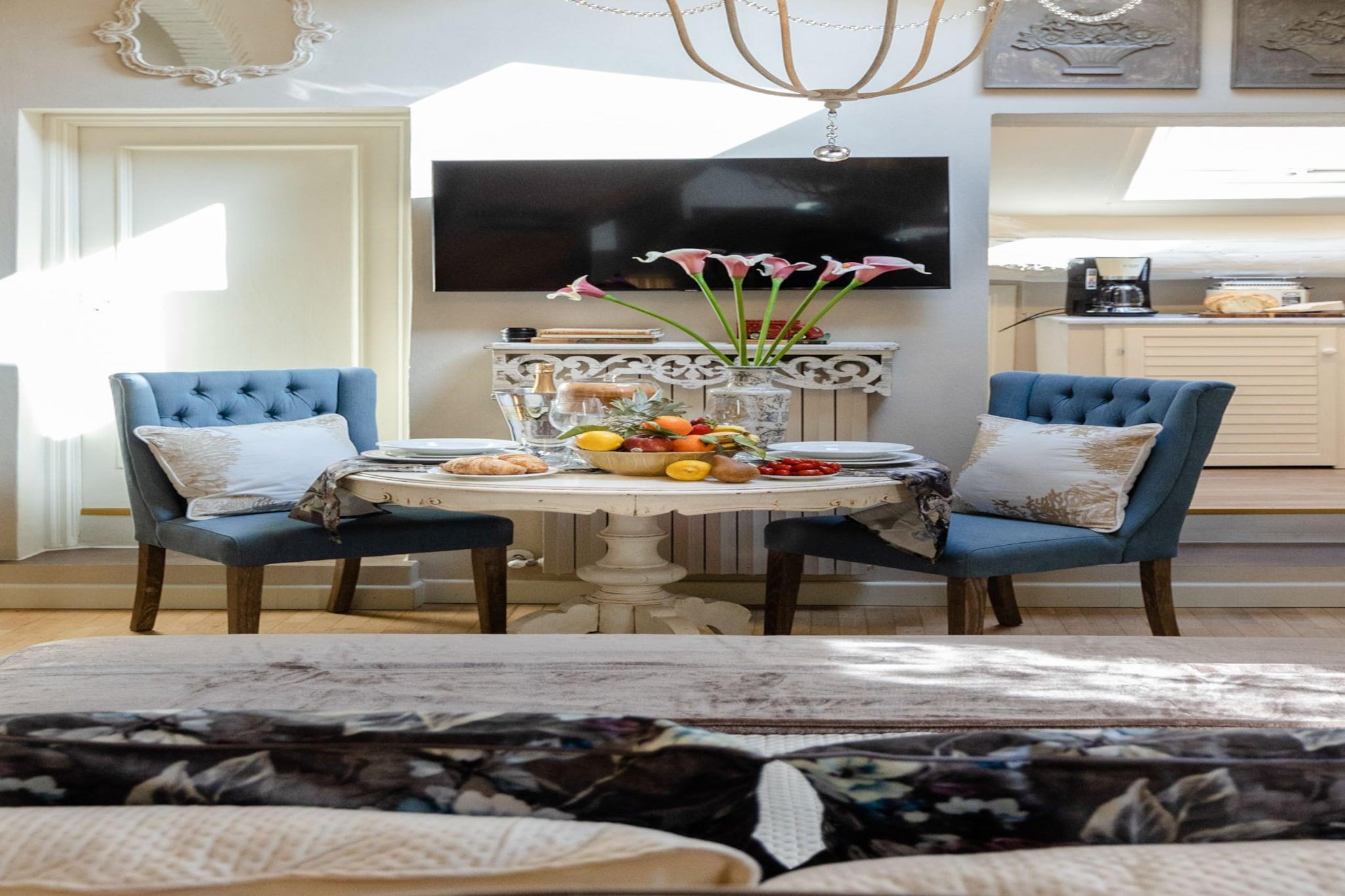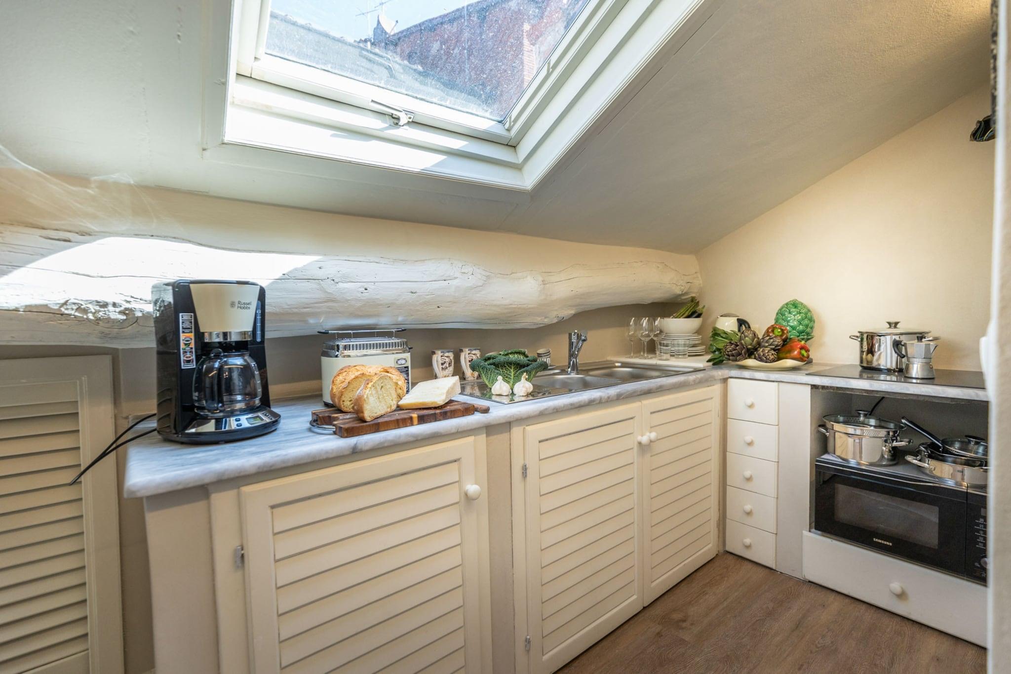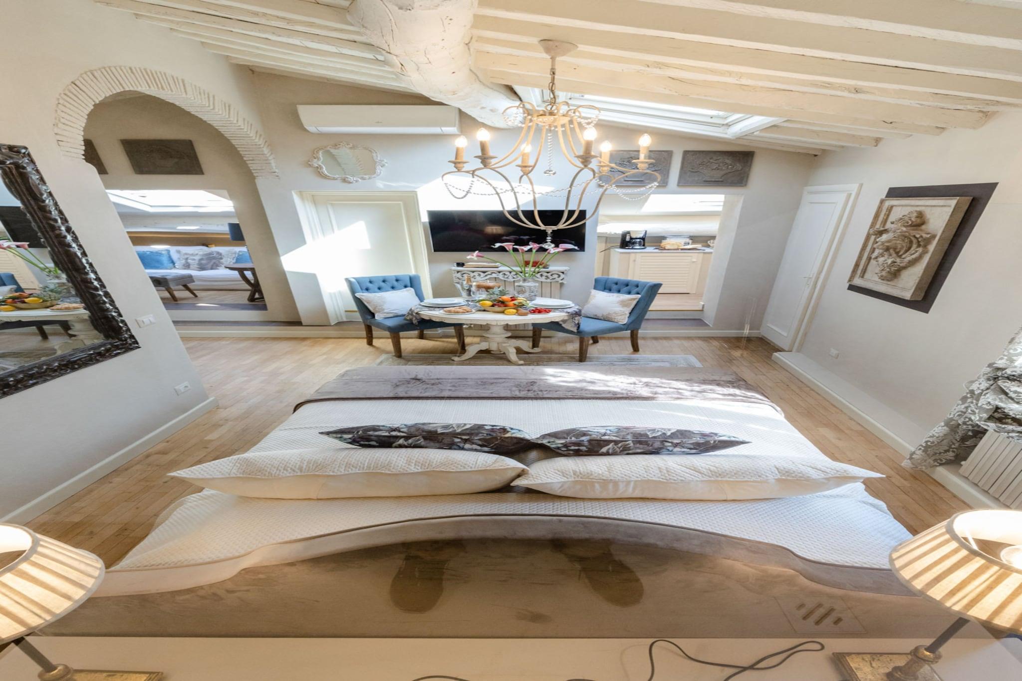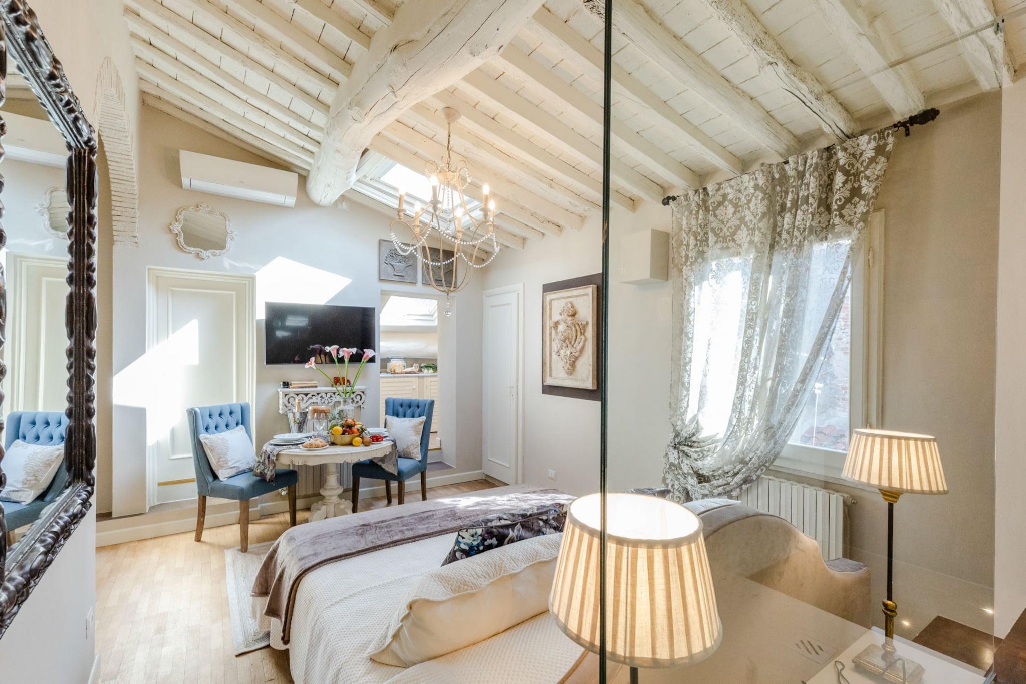 Denne kompakte og elegante studiolejlighed i hjertet af Lucca tilbyder en komfortabel dobbeltseng og er bedst egnet til solorejsende eller par, der søger et hyggeligt ophold i byens historiske centrum. Lejligheden er på 25 m² og ligger på tredje sal, og inkluderer et opholdsområde i loftsstil med lavt til loftet for ekstra charme. Selvom den er lille i størrelse, tilbyder lejligheden en komplet oplevelse med moderne bekvemmeligheder og vigtige tjenester som aircondition og højhastighedsinternet. Kæledyr er ikke tilladt, men valgfrie tjenester såsom lokale vinpakker kan arrangeres for at forbedre dit ophold. Lejligheden er ideelt beliggende ved siden af Piazza San Michele og kun få skridt fra Via Fillungo, og tilbyder direkte adgang til Luccas mest ikoniske attraktioner. Gæsterne kan nemt udforske lokale butikker, caféer, restauranter og pizzeriaer, som alle er inden for gåafstand. Beliggenheden inden for Luccas gamle mure giver en autentisk toscansk oplevelse. Der er offentlig parkering inden for ti minutters gang, og nærliggende offentlige transportmuligheder sikrer nem transport til og fra byen. Lejligheden har et smart, fuldt udstyret køkken med essentielle apparater, perfekt til at tilberede enkle måltider. Et moderne badeværelse har et indbygget brusebad og er fyldt med friske håndklæder og toiletartikler. Yderligere faciliteter inkluderer et tv, varme og alt nødvendigt sengetøj. Serviceydelser som slutrengøring, internet og elektricitet er inkluderet i bookingen, mens ekstra faciliteter såsom sen indtjekning eller en velkomstflaske vin kan tilføjes mod et gebyr. Bemærk: Turistskat skal betales på ejendommen.