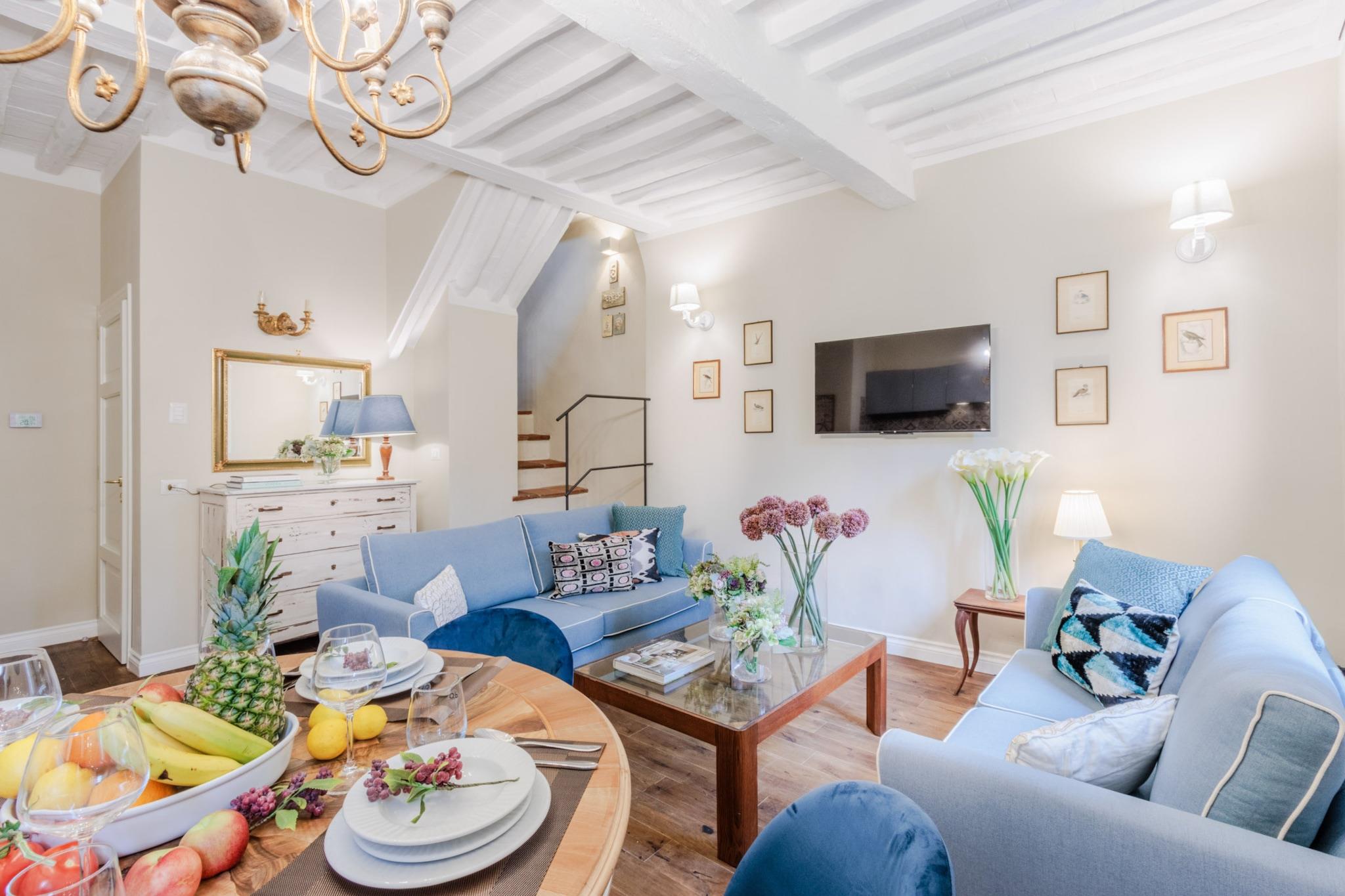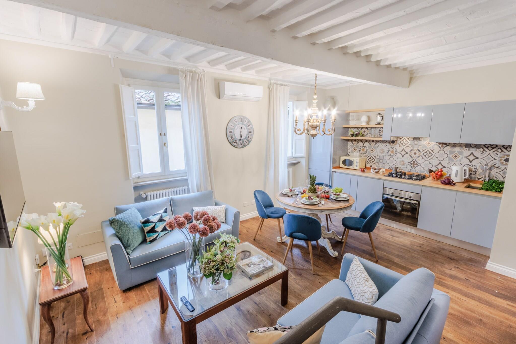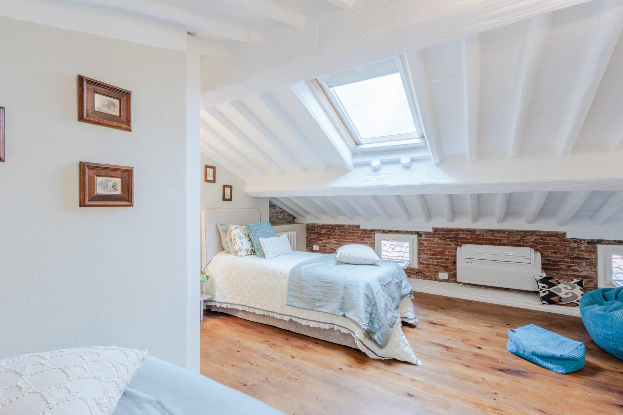 Denne charmerende lejlighed på anden sal ligger gemt væk på en stille sidegade kun få skridt fra Luccas domkirkeplads og tilbyder et fredeligt tilflugtssted i hjertet af byen. Med sine synlige træbjælker og varme, indbydende interiør blander huset historisk karakter med moderne komfort. Uanset om du planlægger en dag med sightseeing, museumsbesøg eller blot nyder den lokale kultur, er denne centralt beliggende lejlighed den perfekte base. Planlægningen er gennemtænkt og fordelt på to etager. Stueetagen har en hyggelig opholds- og spisestue med et fuldt udstyret køkken, to dobbeltværelser - det ene med eget badeværelse - og et ekstra badeværelse. Ovenpå tilbyder et soveværelse med to enkeltsenge, eget brusebad og separat toilet et unikt gemmested i loftsstil, ideelt for gæster, der søger lidt privatliv. Et kompakt vaskerum med vaskemaskine og tørretumbler giver ekstra bekvemmelighed ved længere ophold. Trods sin centrale beliggenhed forbliver lejligheden bemærkelsesværdigt stille og tilbyder en rolig tilflugtssted efter en dag med udforskning. Med togstationen og parkering kun en kort gåtur væk er det nemt at bevæge sig ud over Lucca for at opdage Toscanas skønhed. Uanset om du rejser med familie eller venner, tilbyder denne lejlighed et komfortabelt og karakterfuldt ophold i en af Italiens mest fortryllende byer. Bemærk: Turistskat skal betales på ejendommen.