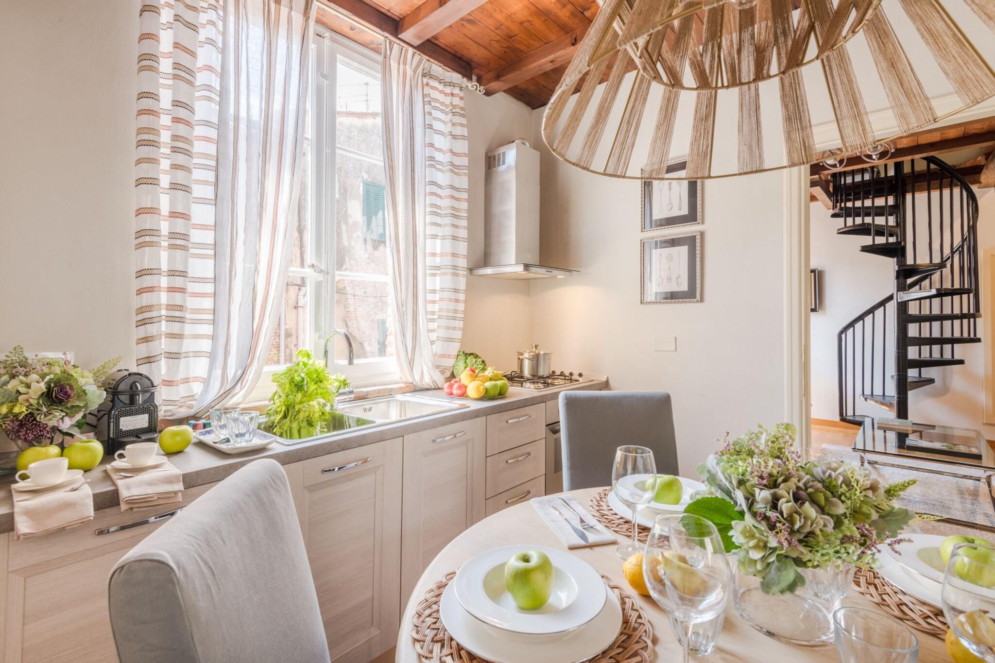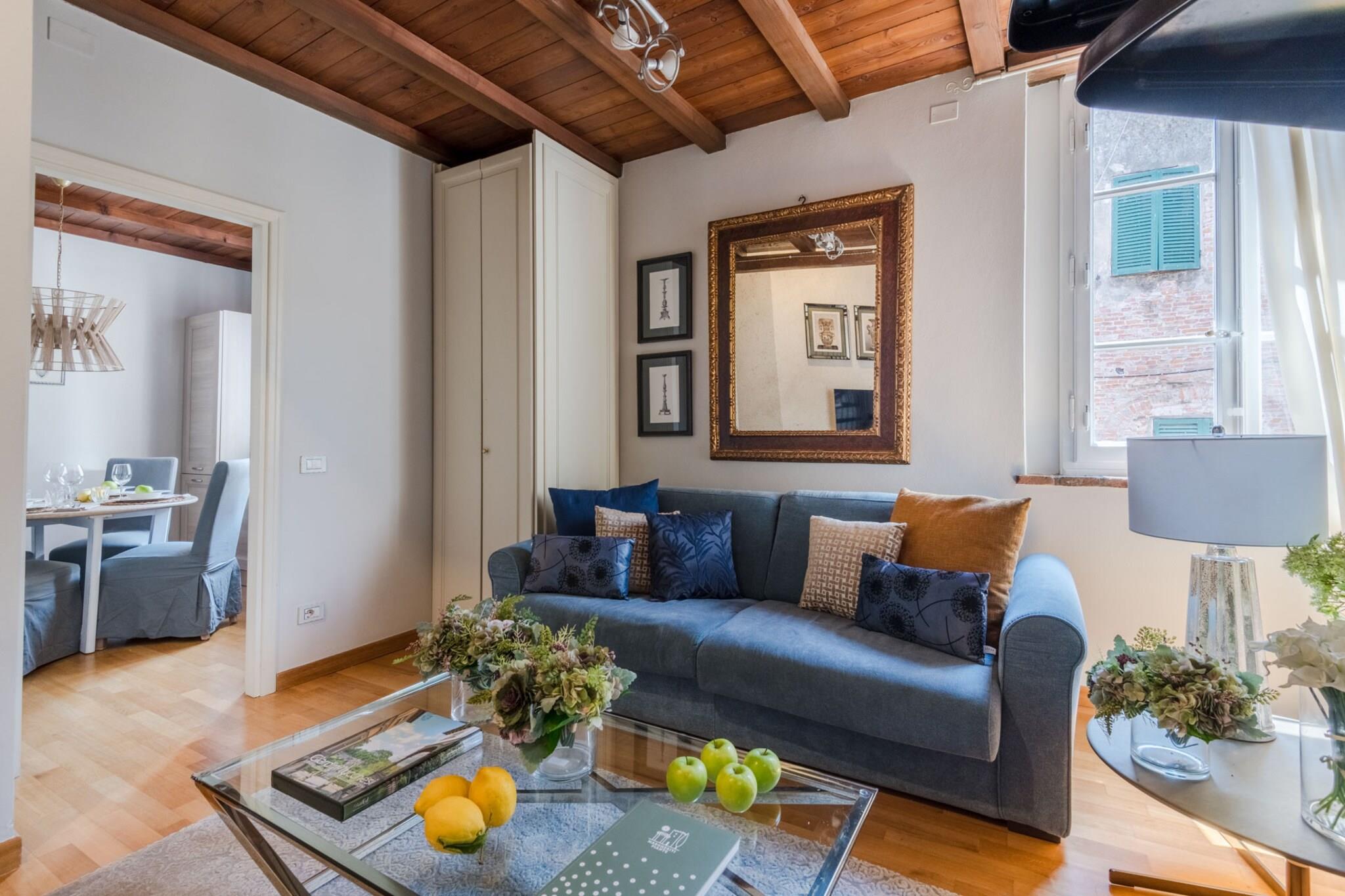 Træd ind i historien i denne charmerende lejlighed på Via del Gallo, beliggende i hjertet af Luccas kunst- og antikvitetsdistrikt. Huset på tredje sal blander historisk karakter med moderne komfort, omgivet af gallerier, boghandlere og kunsthåndværkerbutikker, der indfanger byens tidløse kreativitet. Lejligheden tilbyder et hyggeligt, men stilfuldt tilflugtssted. Soveværelset har en dobbeltseng og et lyst ensuite badeværelse med moderne inventar, hvilket skaber et roligt sted at slappe af. Den kompakte opholdsstue er perfekt til rolige aftener med en bog eller en kop kaffe. Det fuldt udstyrede køkken gør madlavning ubesværet med køleskab, ovn, mikrobølgeovn, opvaskemaskine, kaffemaskine, brødrister, elkedel og juicer, der er velegnet til alt fra hurtig morgenmad til gourmetmiddage. På trods af den centrale beliggenhed er bekvemmeligheden lige ved hånden: togstationen, busterminalen og nærliggende parkering ligger kun 10 minutters gang væk, hvilket giver nem adgang til at udforske byens mure. Yderligere bekvemmeligheder inkluderer aircondition, Wi-Fi, tv, strygejern og hårtørrer. En højstol og barneseng er tilgængelige efter anmodning. Denne lejlighed tilbyder ikke bare et ophold, men en oplevelse – en perfekt base for at udforske Luccas historiske gader, pulserende kultur og kunstneriske arv, mens man nyder privatlivet og charmen i et hjem i bymidten.