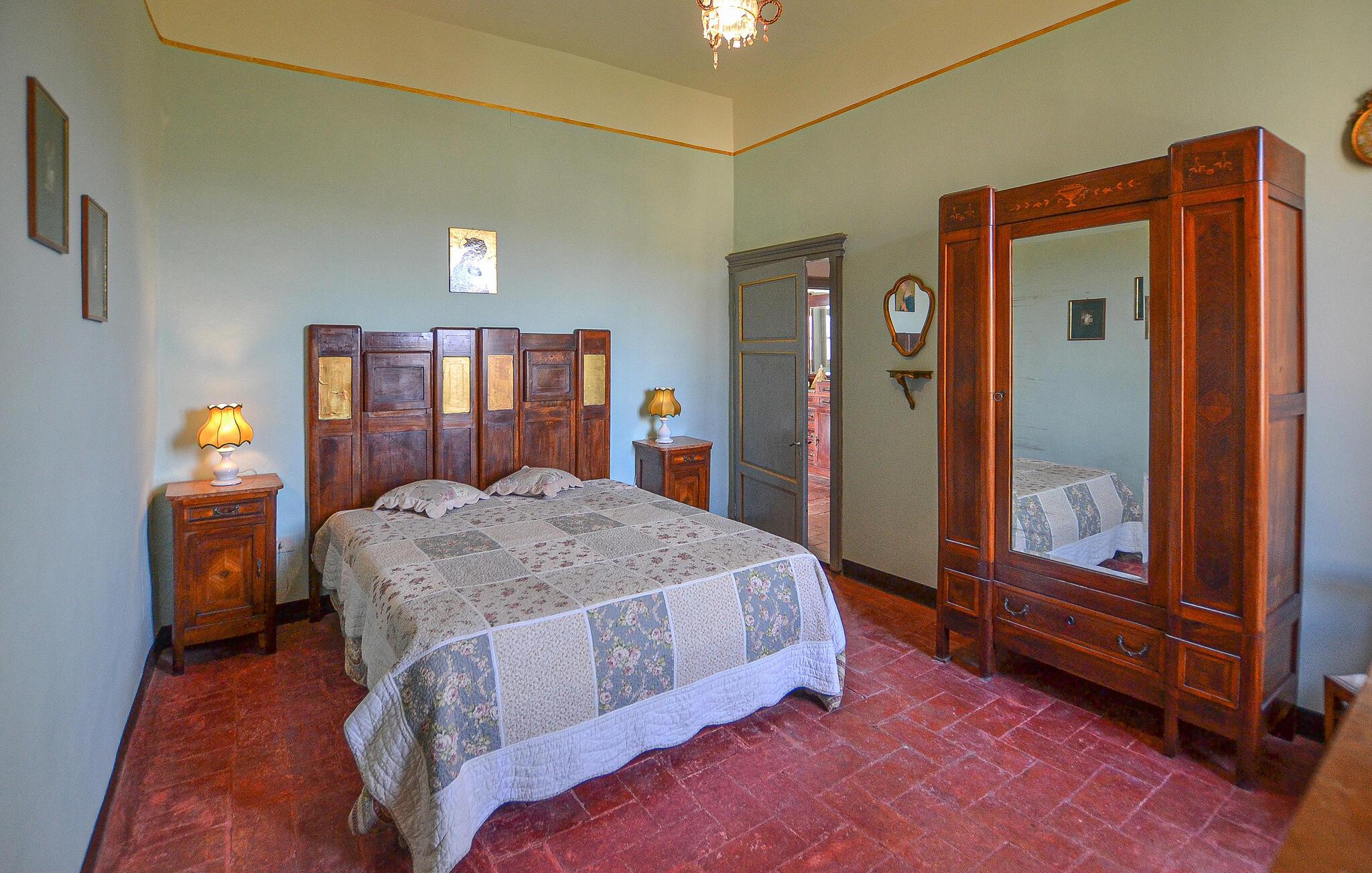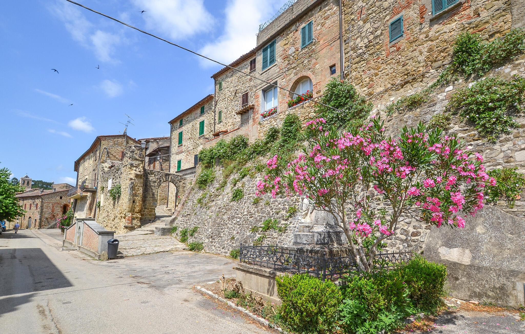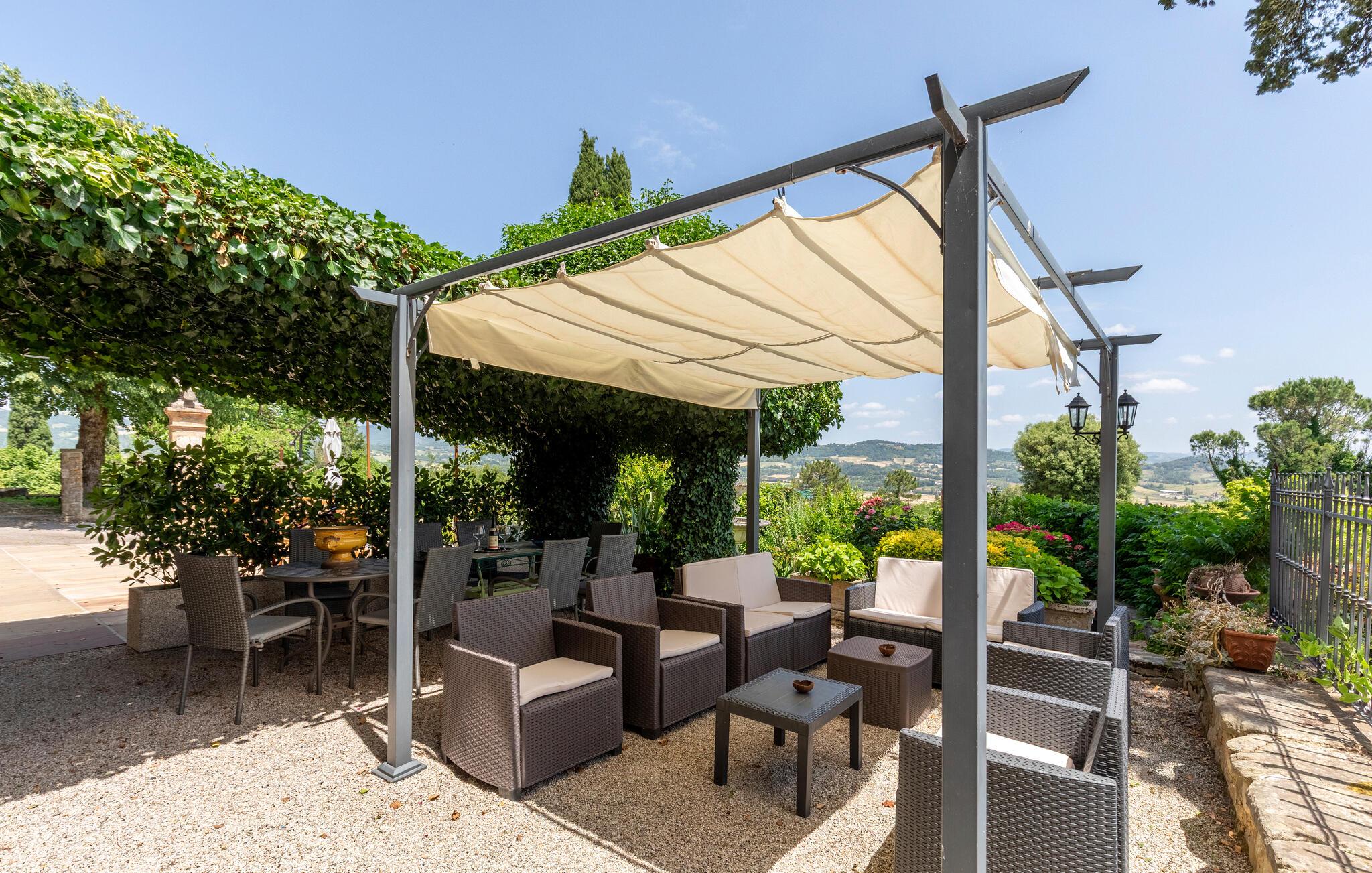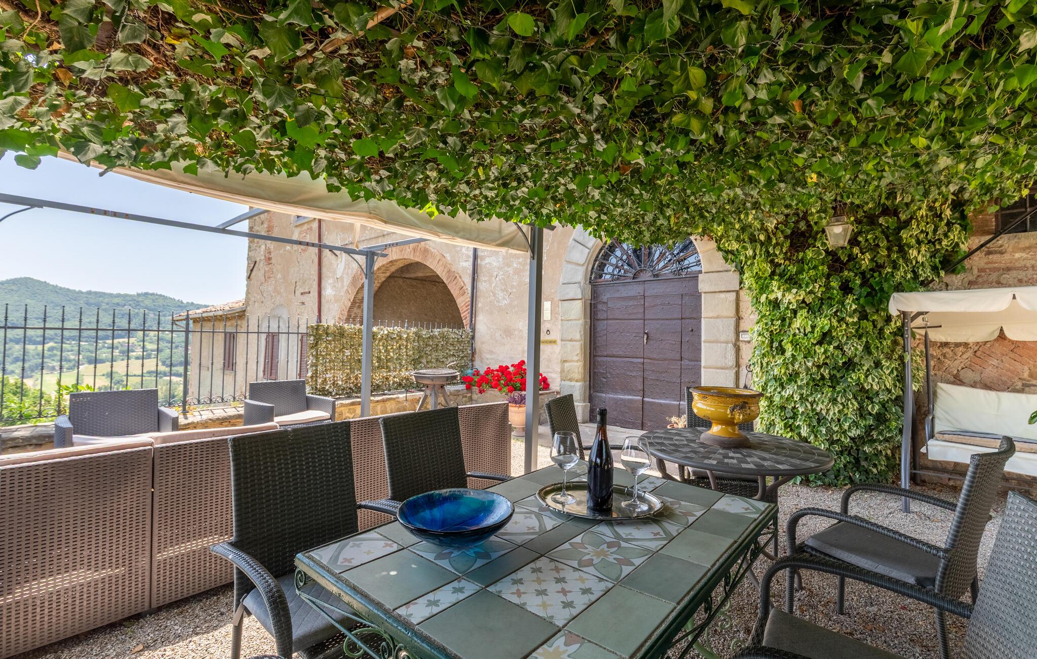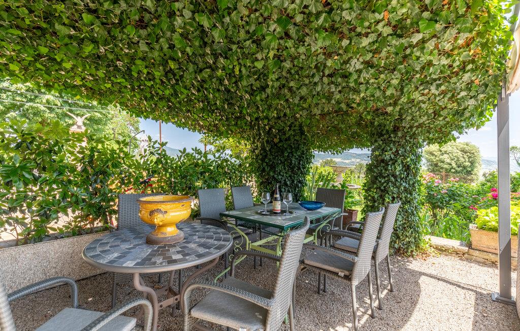 I udkanten af ??en middelalderlig bygning på en rolig bakke mellem Città di Castello (20 km) og Cortona (35 km) findes denne specielle del af et tofamiliehus. Stilfuldt restaureret med originale antikke møbler. I stueetagen åbnes porten til det høje indgangsparti med trapper, badeværelse, spiseplads og stort køkken. På 1. sal er der tre soveværelser, to stuer, et badeværelse og et andet badeværelse på 2. sal. I kan spise under pergolaen foran huset. Lidt nedenfor er det private poolområde med liggestole og en overdækket terrasse samt en parklignende havegrund med oliventræer, figner og kaktus - et lille paradis!