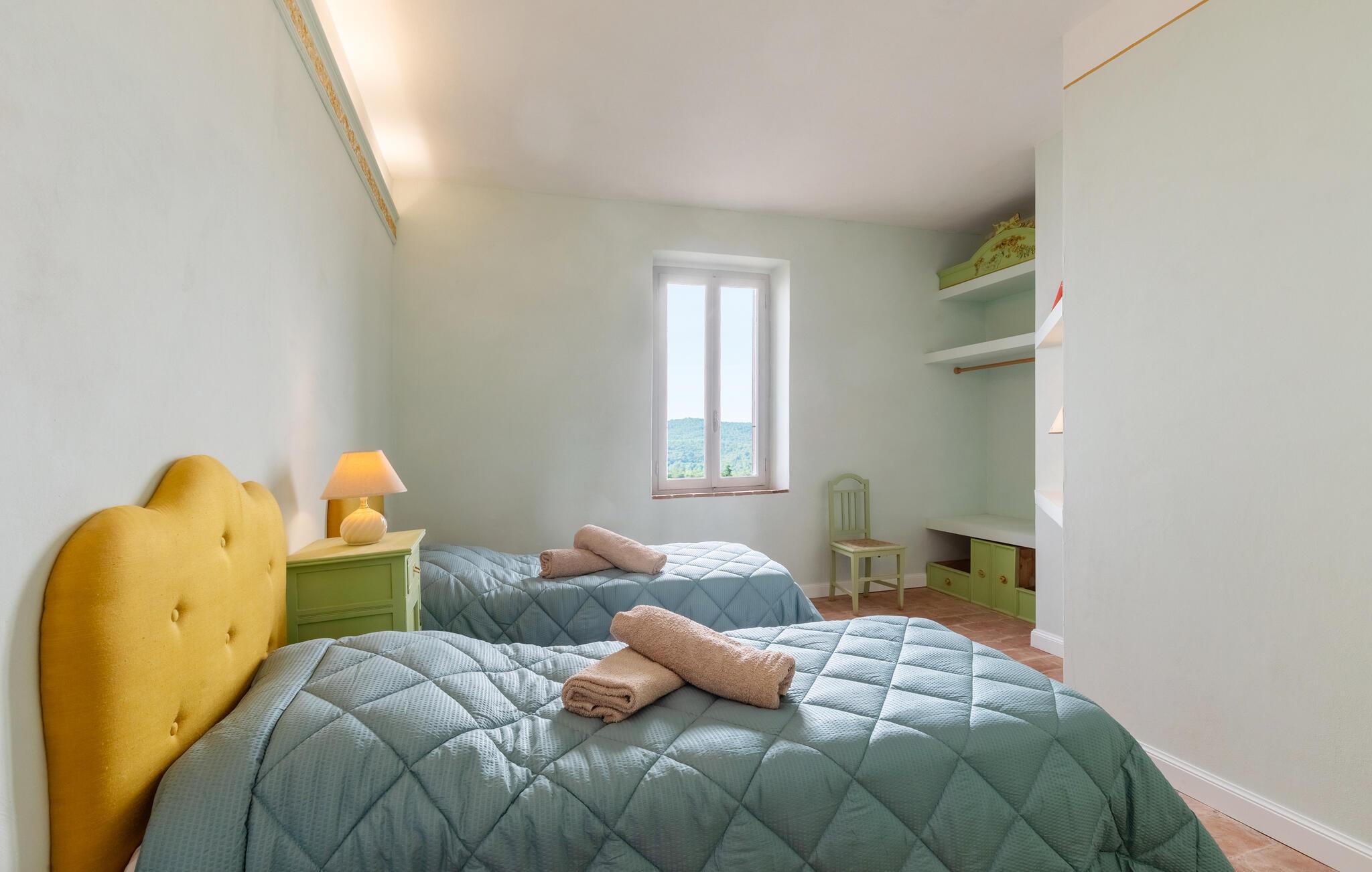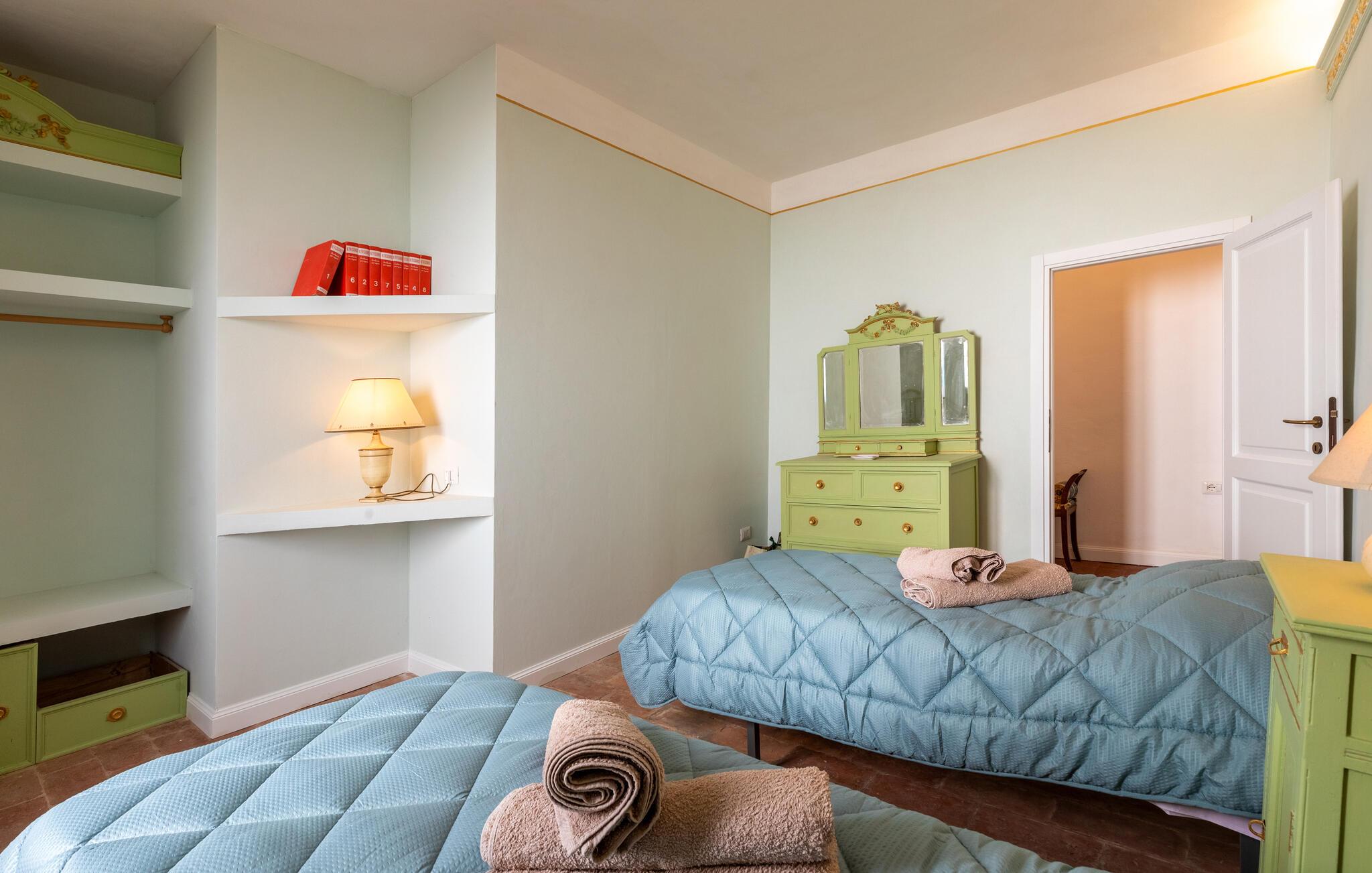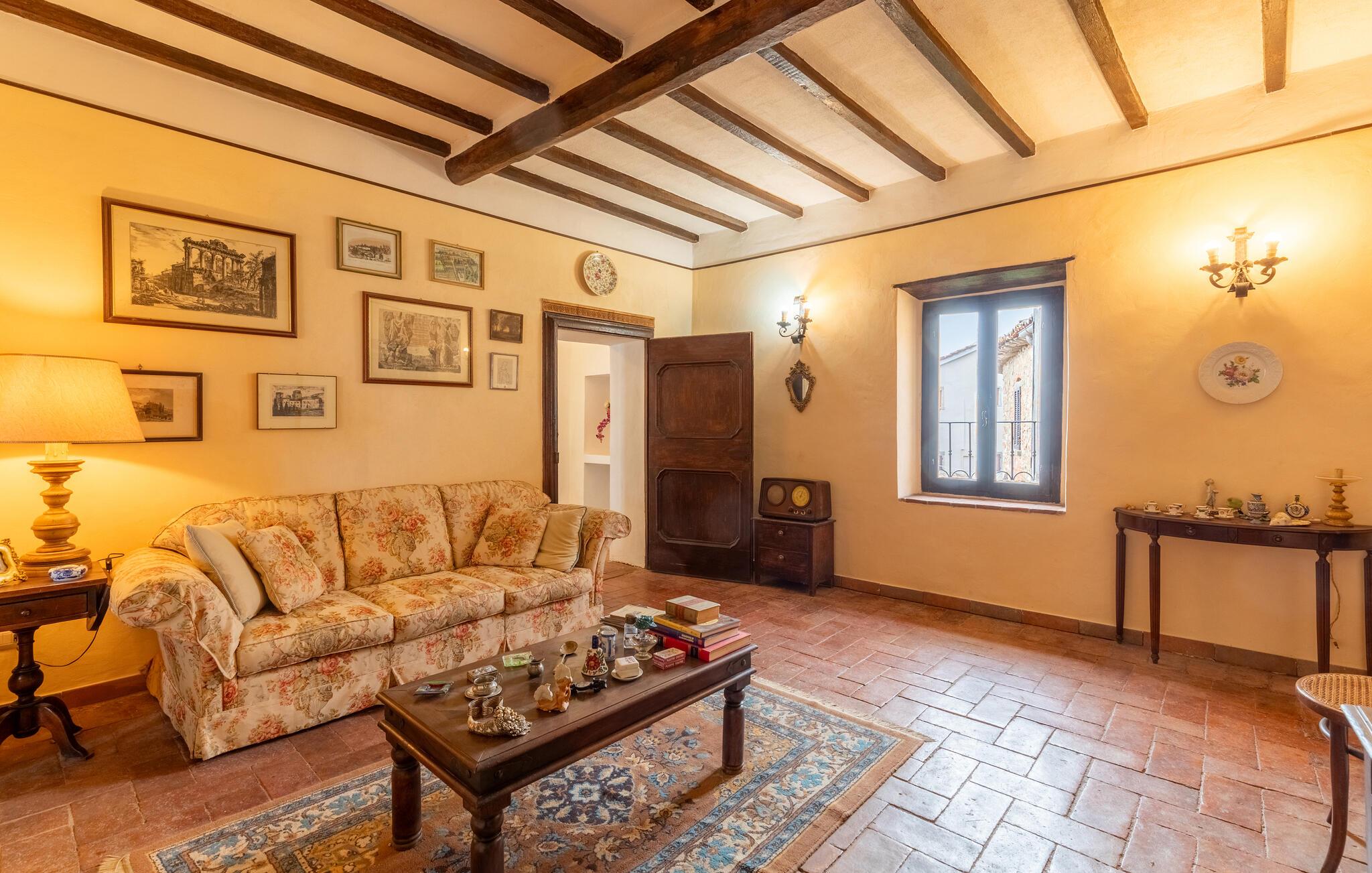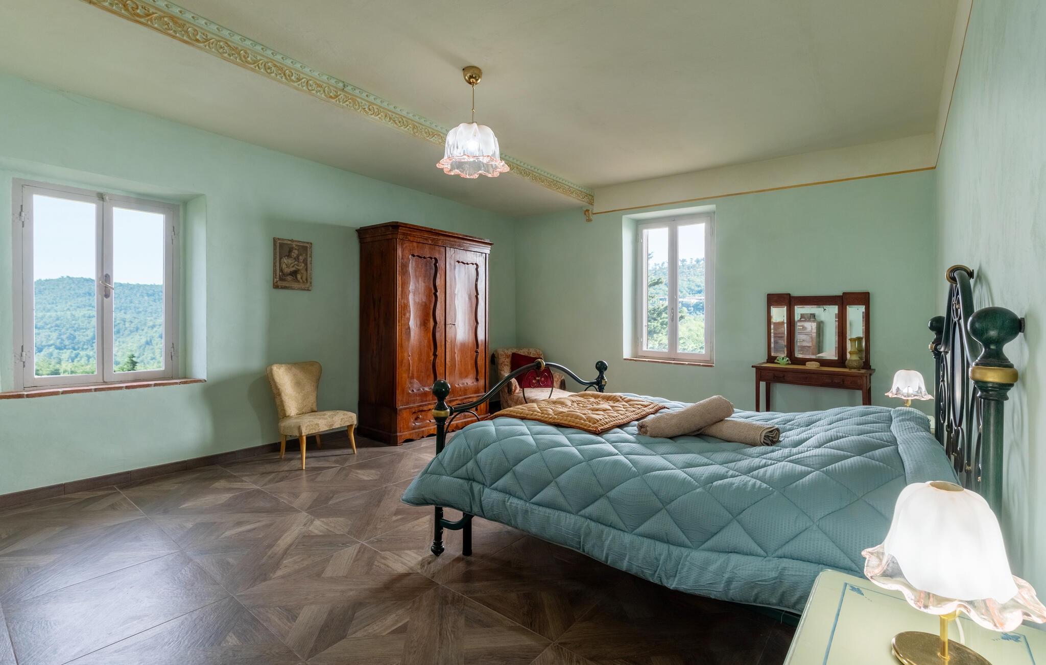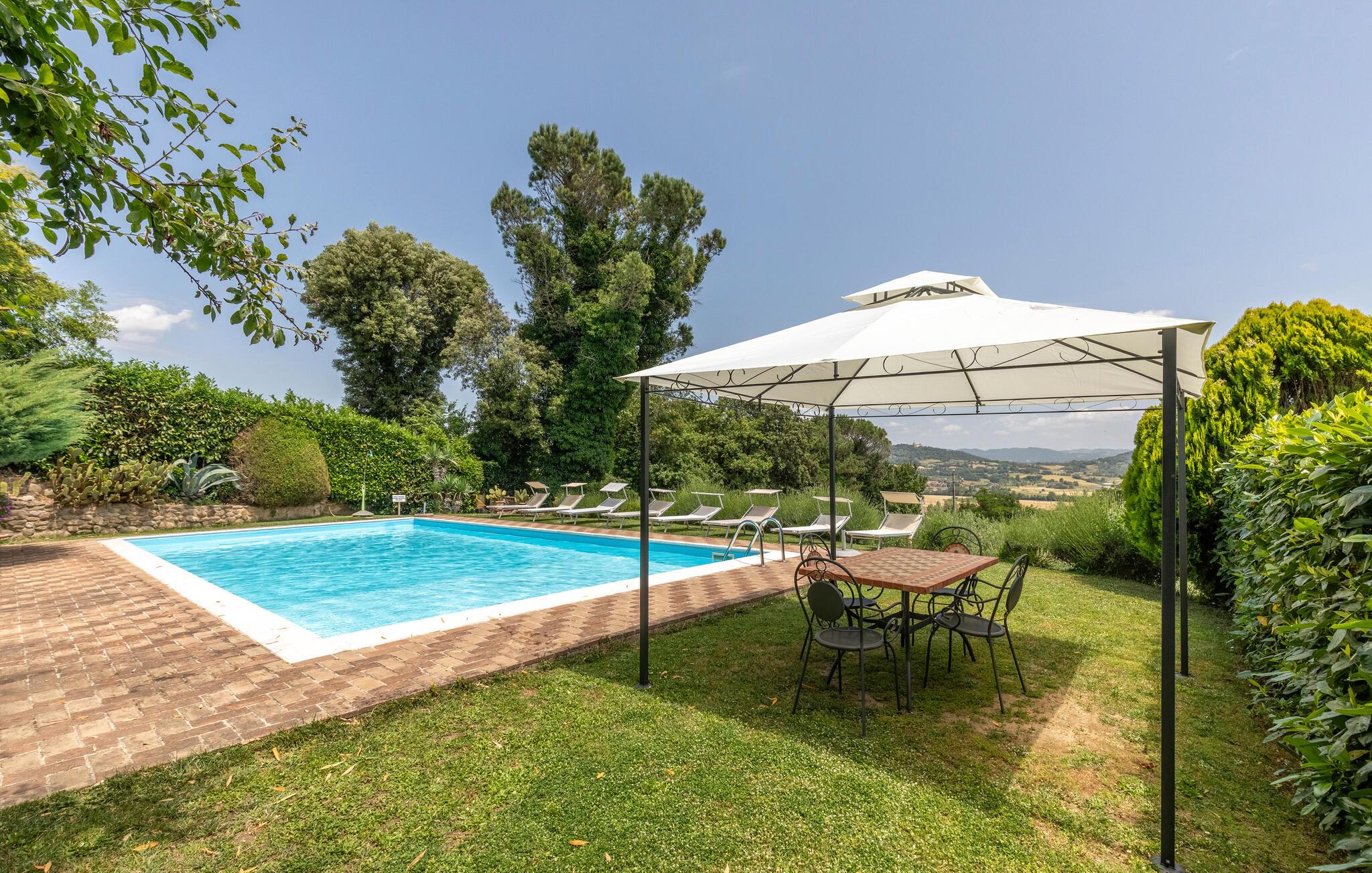 I udkanten af ??en middelalderlig bygning på en rolig bakke mellem Città di Castello (20 km) og Cortona (35 km) findes denne specielle del af et tofamiliehus. Stilfuldt restaureret med originale antikke møbler. I stueetagen åbnes porten til det høje indgangsparti med trapper, badeværelse, spiseplads og stort køkken. På 1. sal er der tre soveværelser, to stuer, et badeværelse og et andet badeværelse på 2. sal. I kan spise under pergolaen foran huset. Lidt nedenfor er det private poolområde med liggestole og en overdækket terrasse samt en parklignende havegrund med oliventræer, figner og kaktus - et lille paradis!