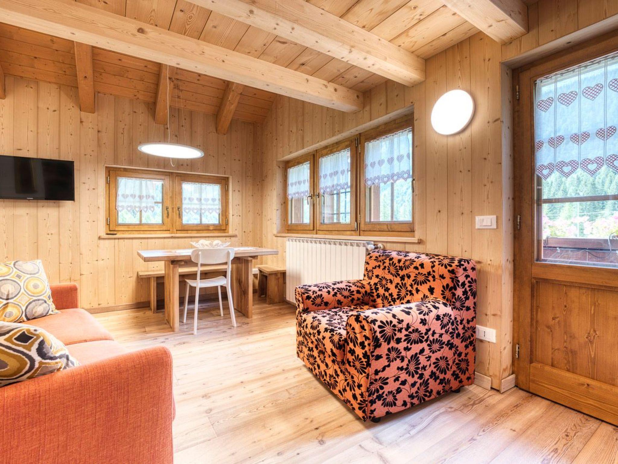 - Living room with solid wood table, modern equipped kitchen and double sofa bed;