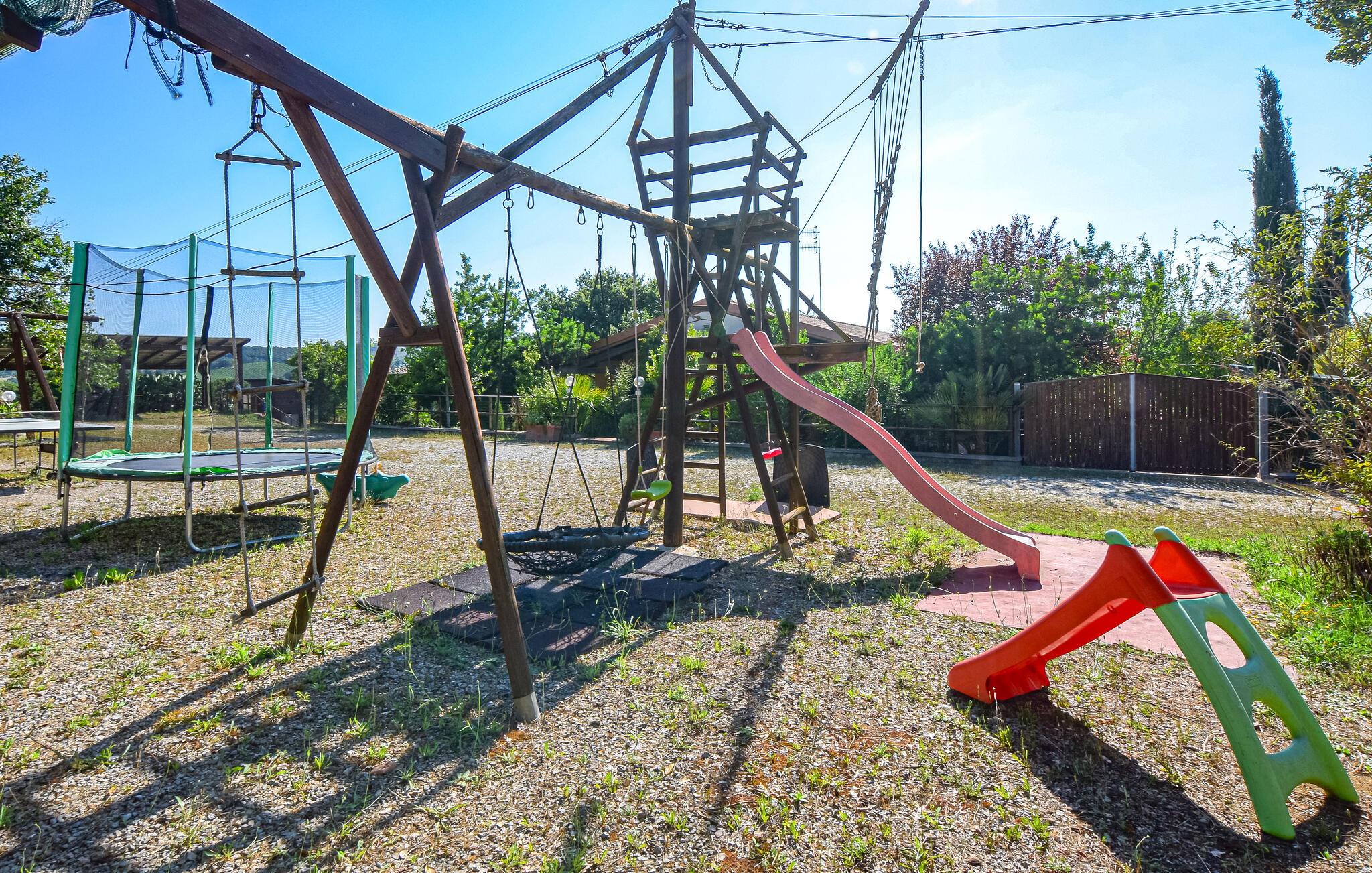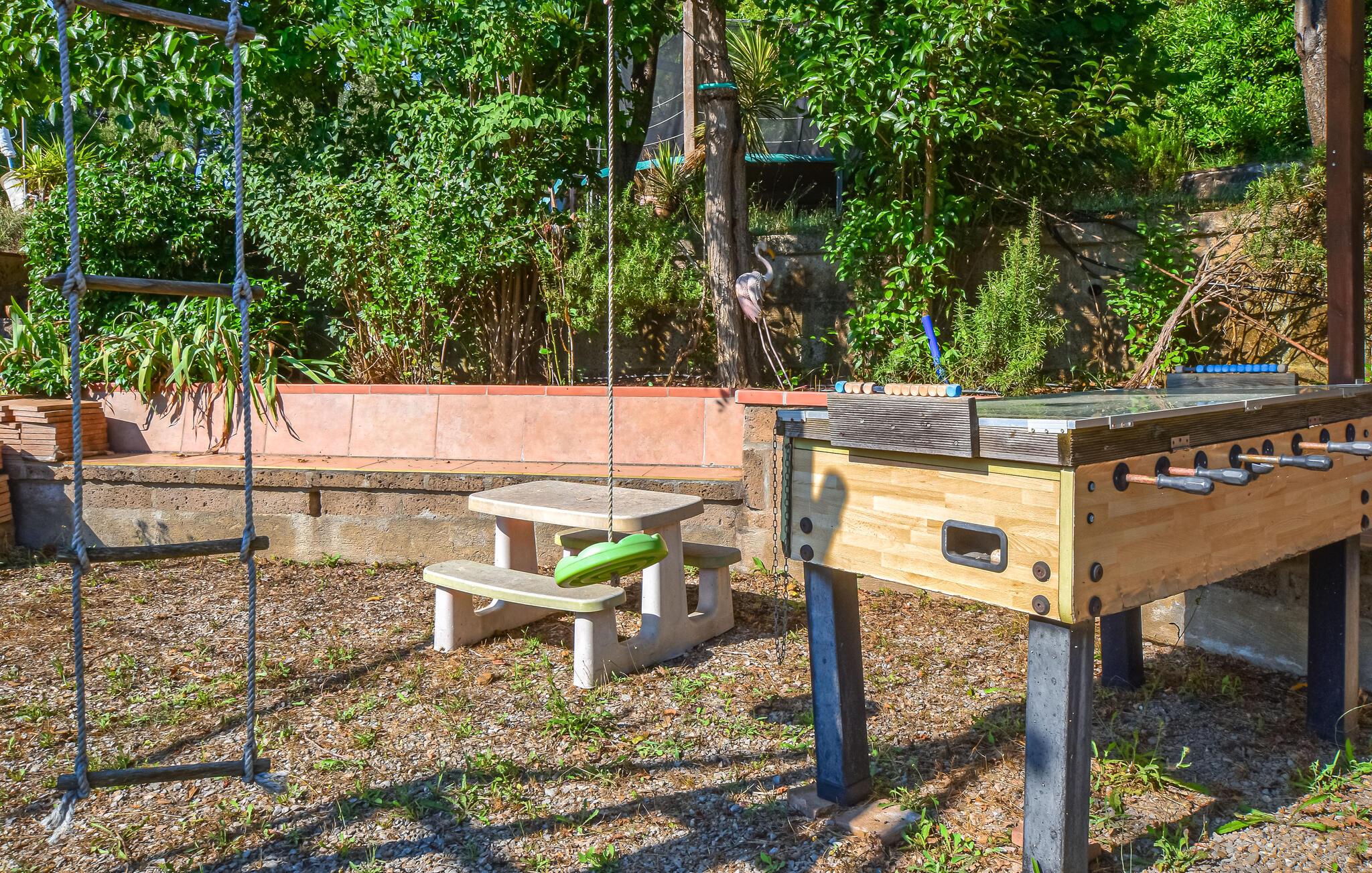 Oplev denne ferielejlighed, der vil fortrylle jer med familiær charme og en varm, indbydende atmosfære. De kærligt indrettede rum inviterer jer til at finde ro og nyde jeres ferie fuldt ud. I det veludstyrede køkken kan I lave mad sammen og derefter nyde måltiderne på jeres terrasse. Den store grund byder på mange muligheder for afslapning: en swimmingpool, en børnepool, en tennisbane og en idyllisk dam med bro, hvor I kan nyde afslappende timer udendørs.