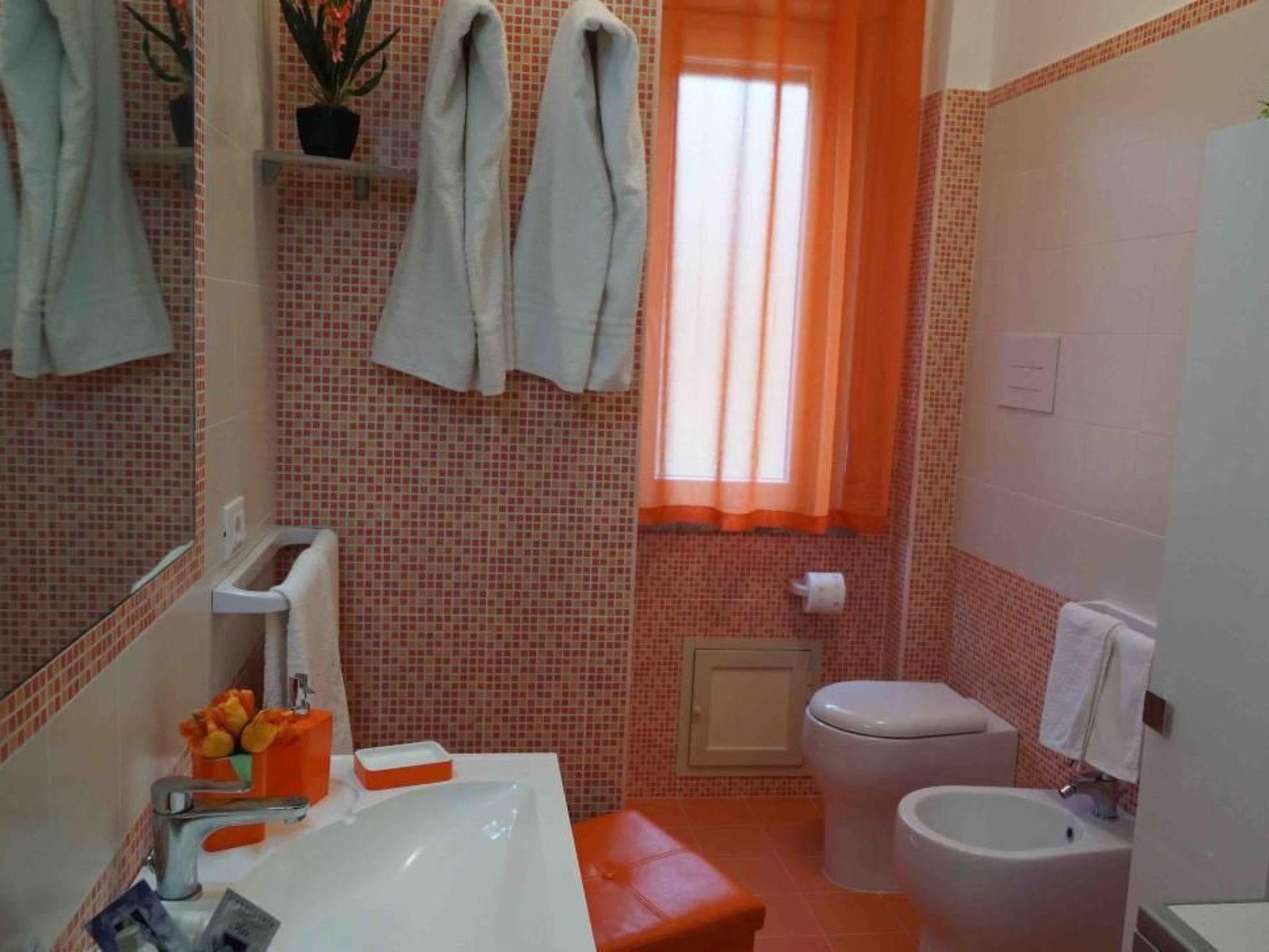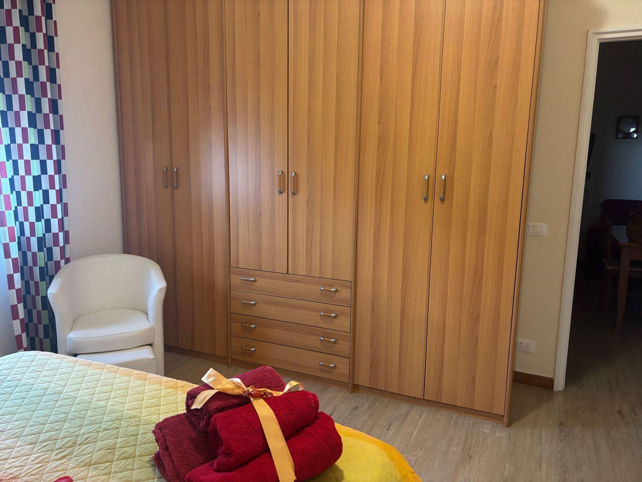 Inside, the flat is equipped with every comfort to guarantee you a pleasant and carefree stay. You will find a cosy living room with a sofa bed, a fully equipped kitchen with a sea view, a double bedroom with wardrobe and shoe rack, a bedroom with two single beds, desk and wardrobe, and a bathroom equipped with shower, toilet, bidet, washbasin, cabinet, mirror, and washing machine. For your comfort, the flat also has air conditioning, satellite TV, a coffee machine, microwave and much more.